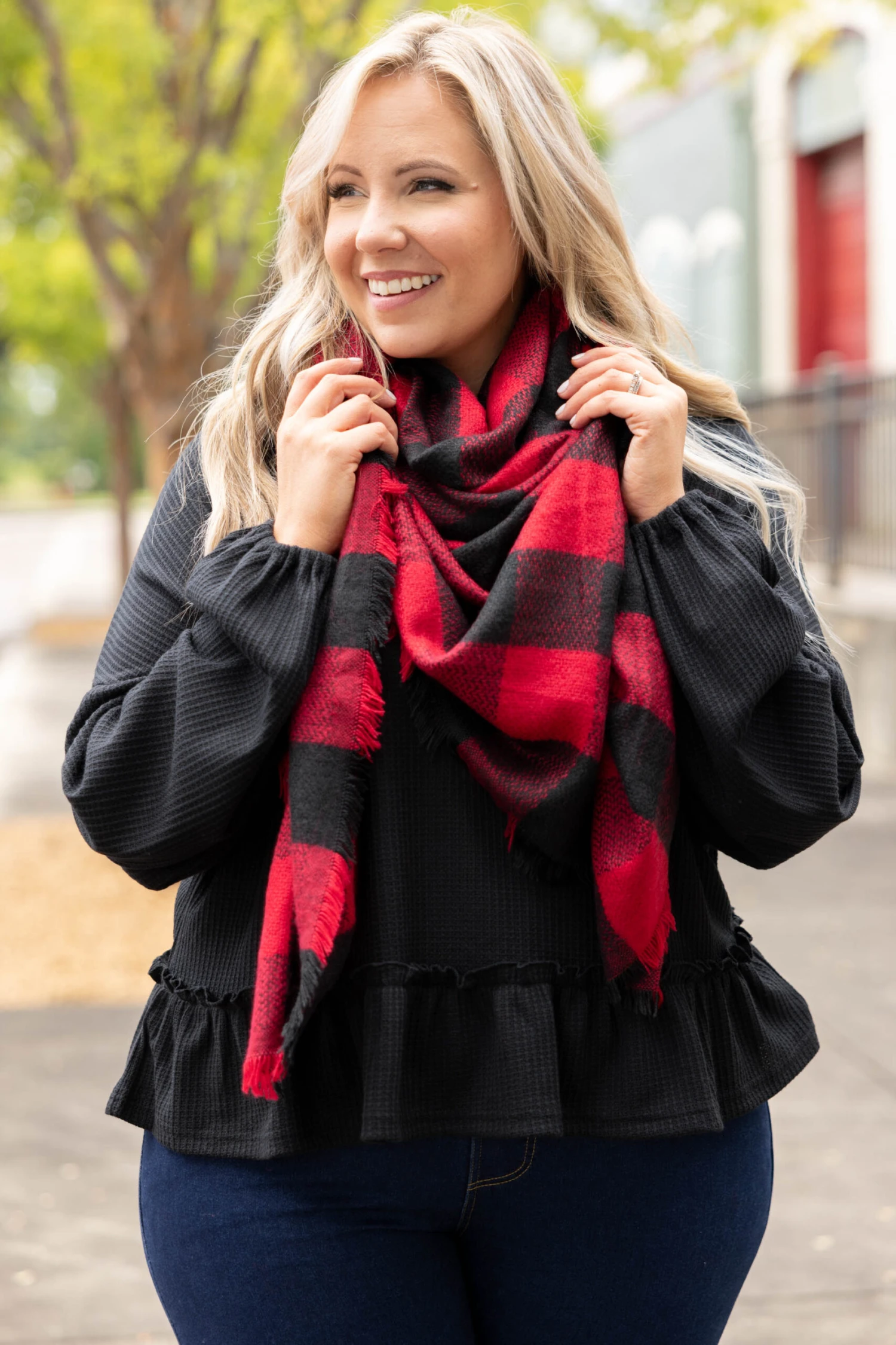 This cutie will warm your body and your heart! The black-red color and trendy plaid design is just in time for the season! Style this scarf with some skinnies and slides or a cute dress and heels for a fun, chic look!