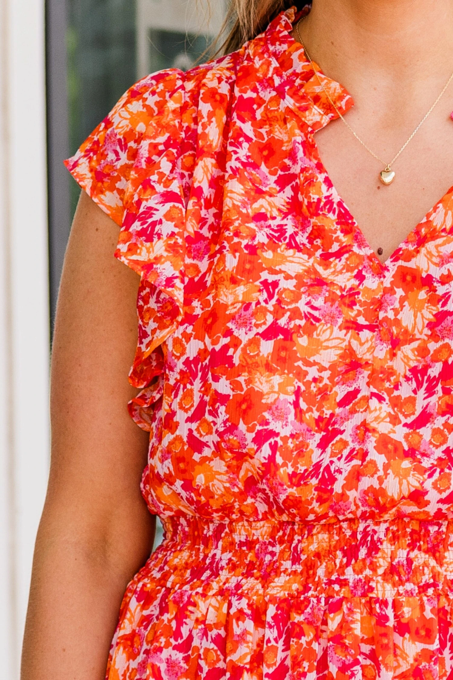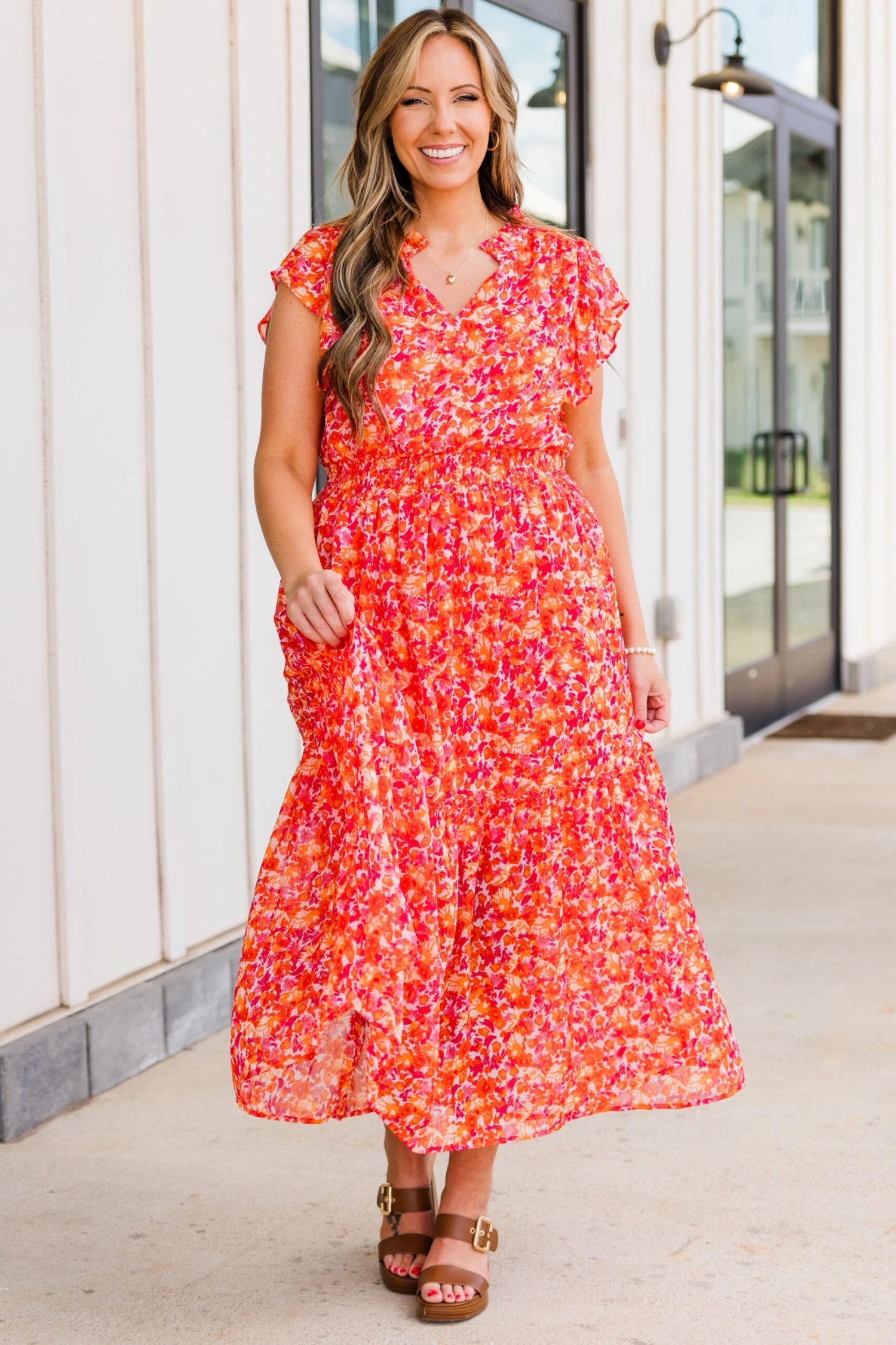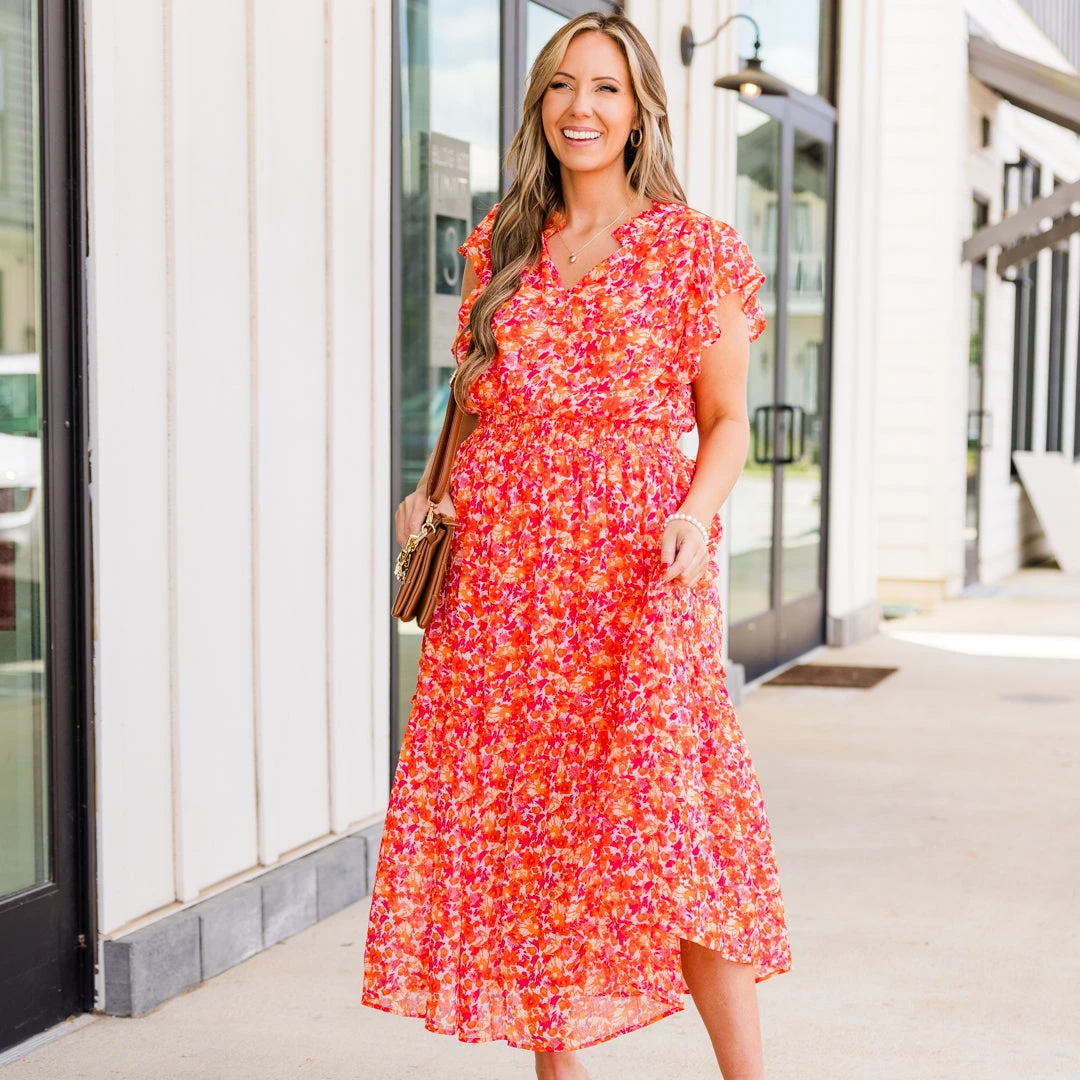 Discover the perfect blend of elegance and playfulness with our Keep ‘Em Guessing Dress in tangerine! Featuring a striking metallic floral print, this ruffle maxi dress is designed with a flattering v-neckline, elastic waistband, and flutter sleeves! Make a bold statement in this must-have dress!