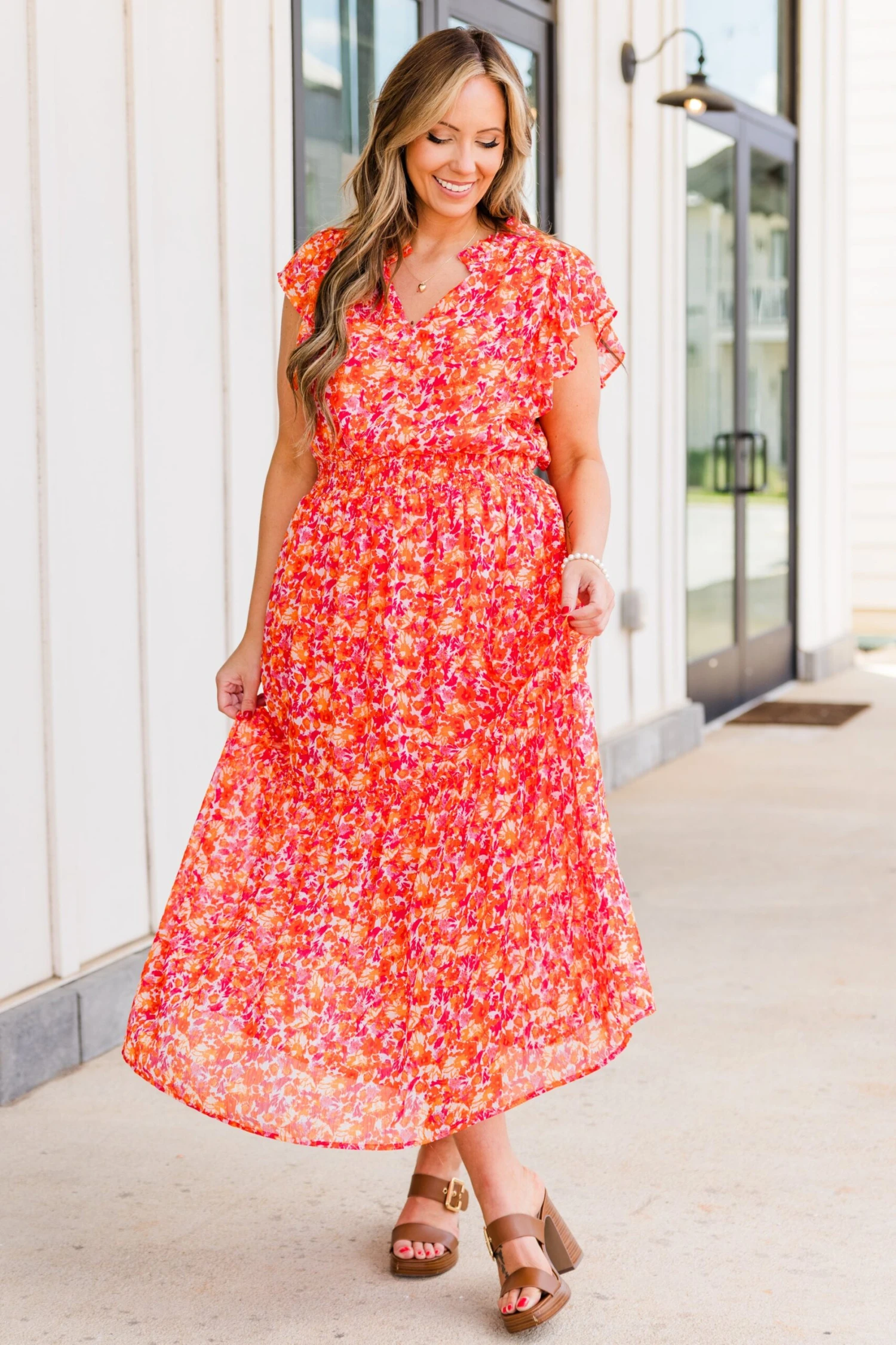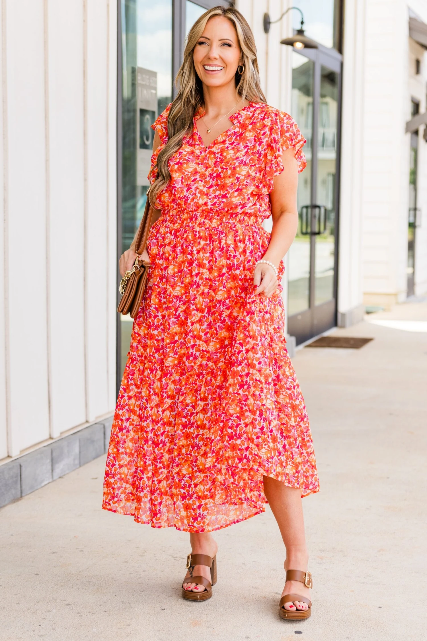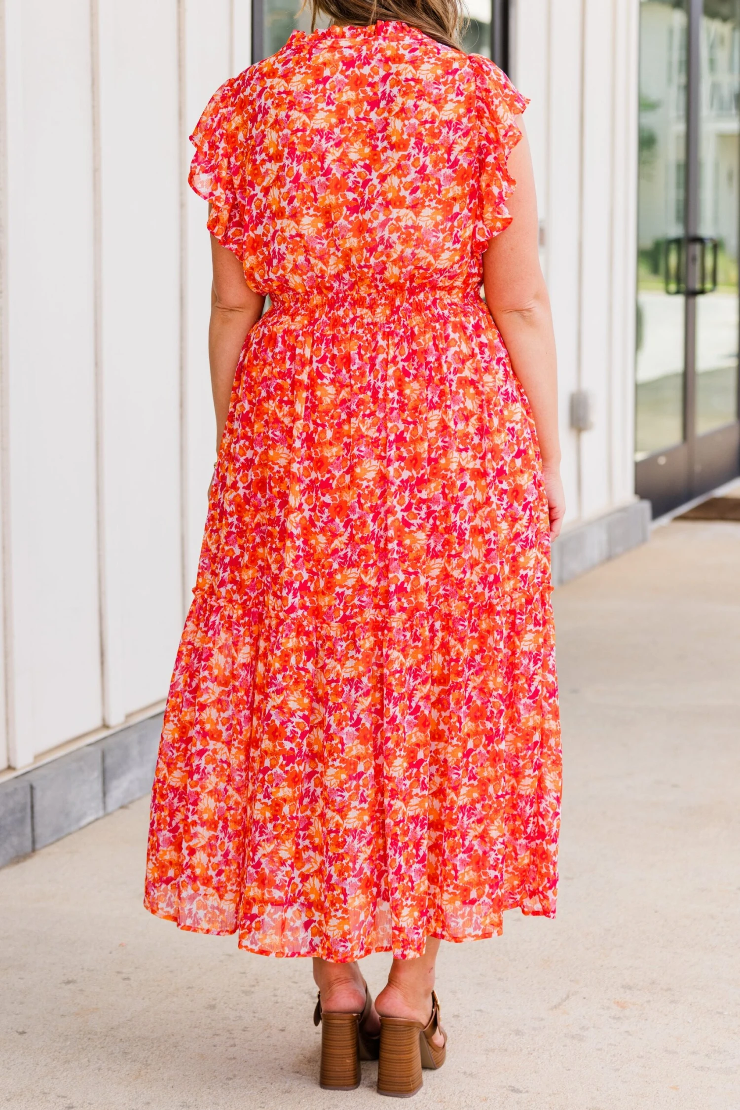 Discover the perfect blend of elegance and playfulness with our Keep ‘Em Guessing Dress in tangerine! Featuring a striking metallic floral print, this ruffle maxi dress is designed with a flattering v-neckline, elastic waistband, and flutter sleeves! Make a bold statement in this must-have dress!