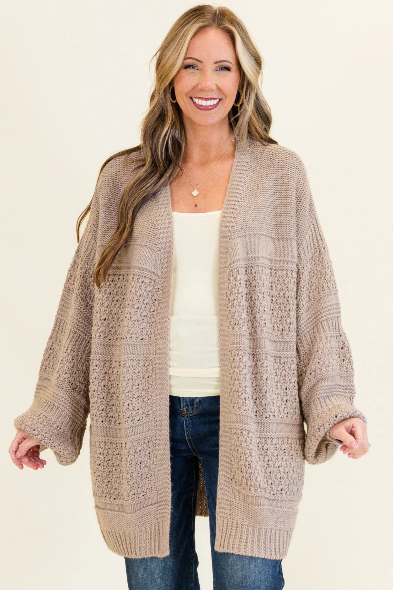 Stay cozy and stylish with our Keepin’ Cozy Cardigan in taupe! Featuring an open front and cable knit design, this cardigan adds a touch of warmth and texture to any outfit! With a relaxed drop shoulder and classic color, it’s a staple piece for any wardrobe!