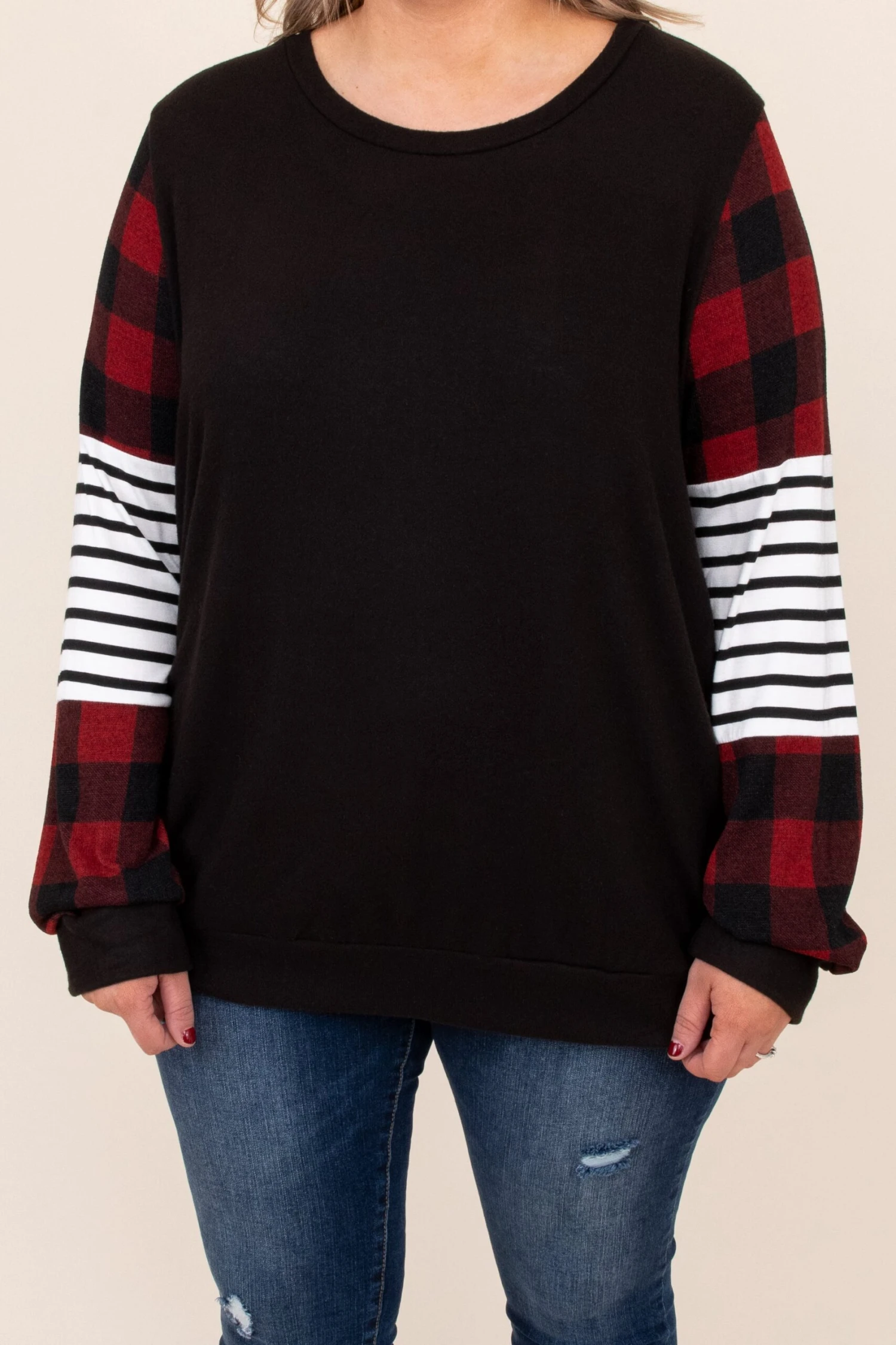 This top was made to wear around town! This top has a classic red plaid and stripe print and a loose, comfy fit that you will love! It is figure-flattering, perfect for all-day wear, and your perfect go-to piece of the season! Toss it on with your fave skinnies and booties for an effortless outfit!