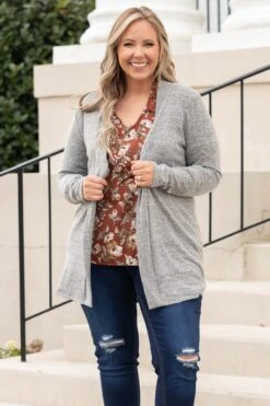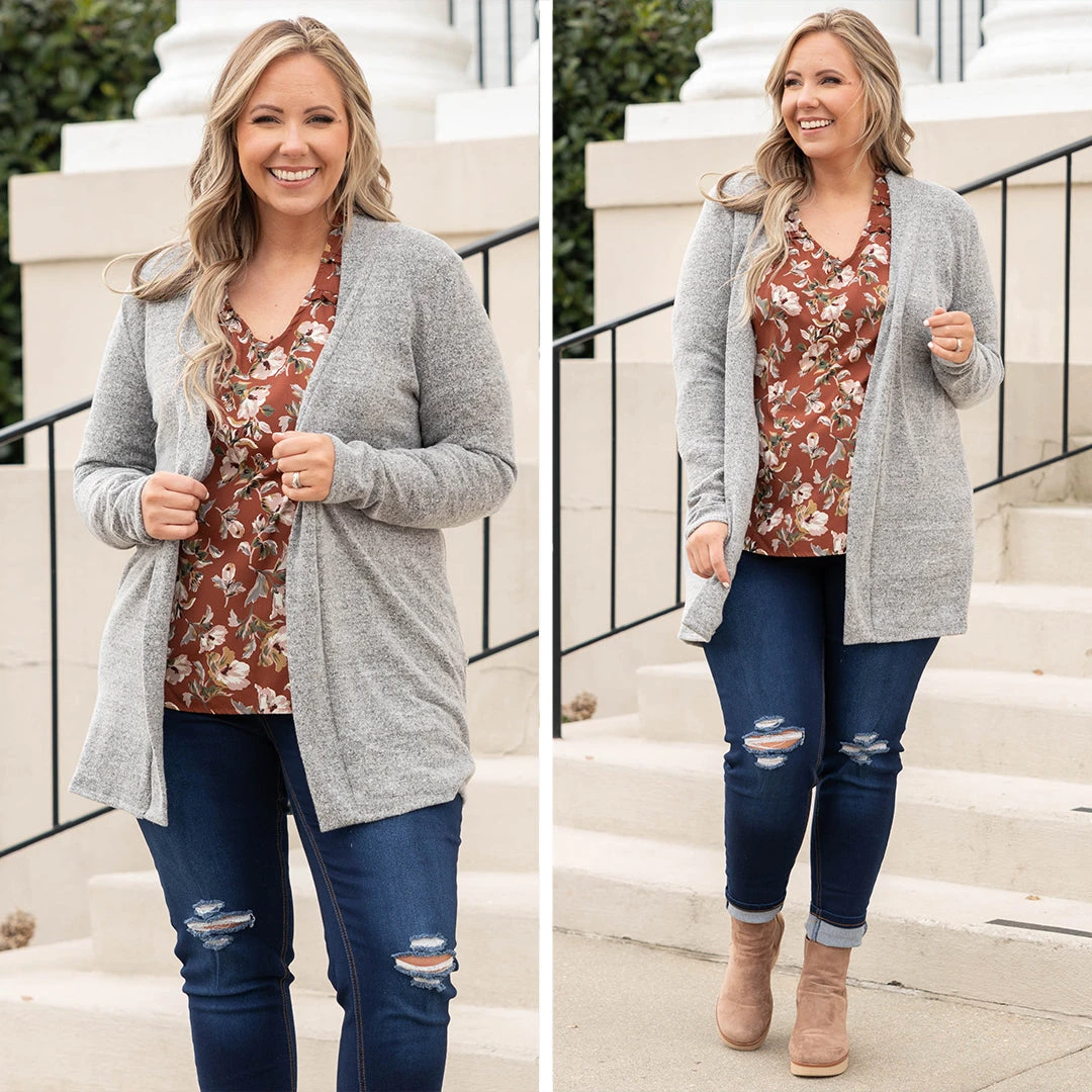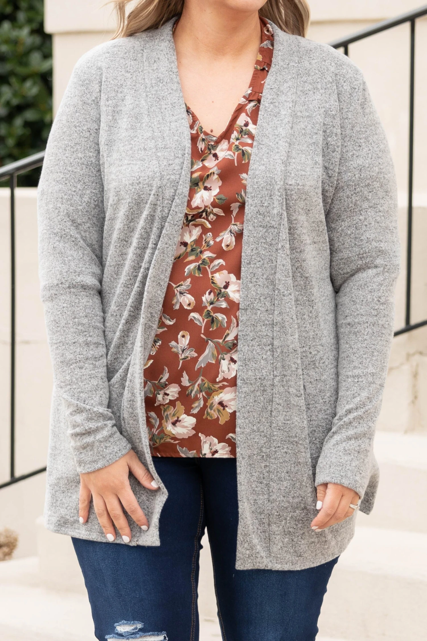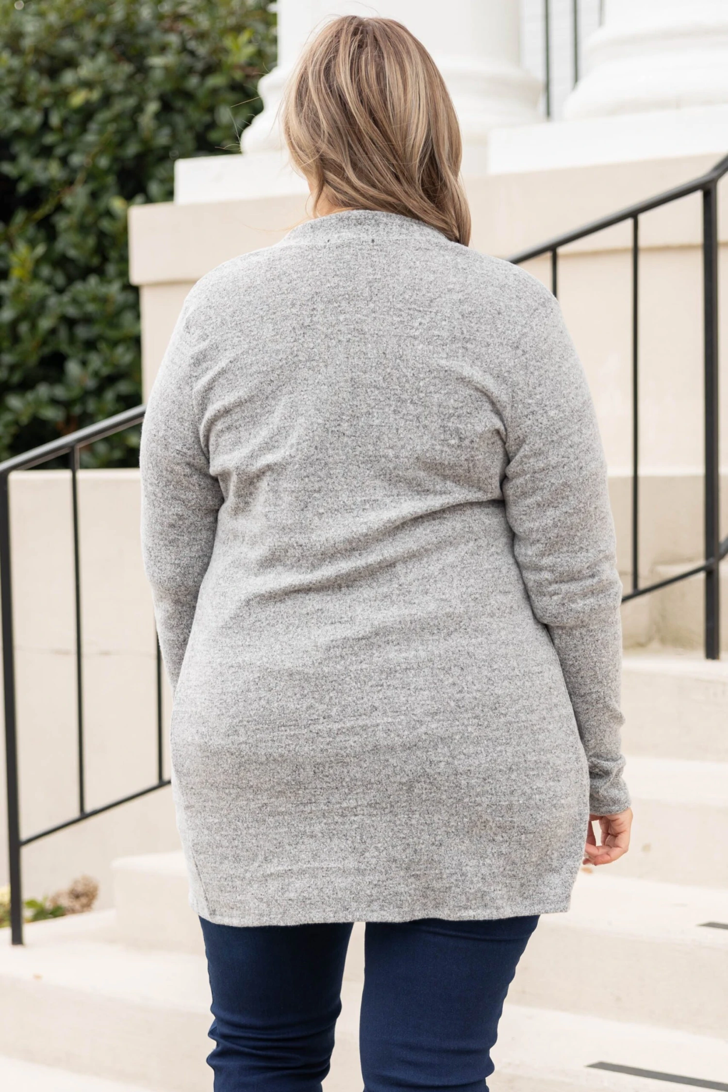 Throw on this beauty for a late night stroll! This cardigan has a heather grey color with a super soft material that is so cozy and sweet! Style this cardigan over all of your favorite outfits for a classic chic look!