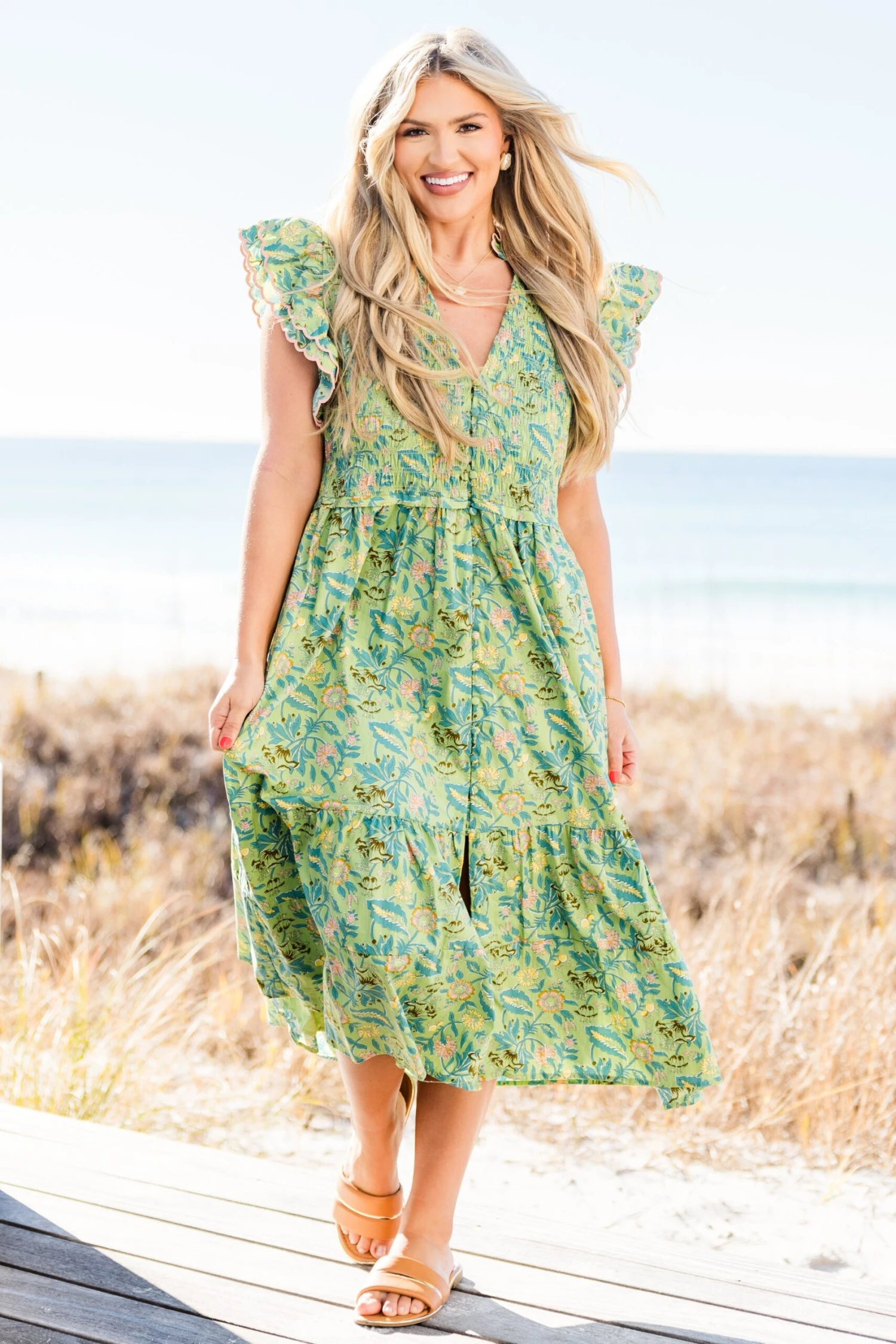 Indulge in luxurious sophistication with this dress! The smocked bodice, tiered skirt, and functional buttons down the front offer a comfortable and stylish fit, while the flutter sleeves with pink ric rac piping add a touch of whimsy! Featuring a tropical floral print, this dress exudes elegance and charm!
