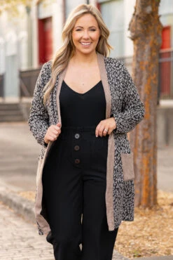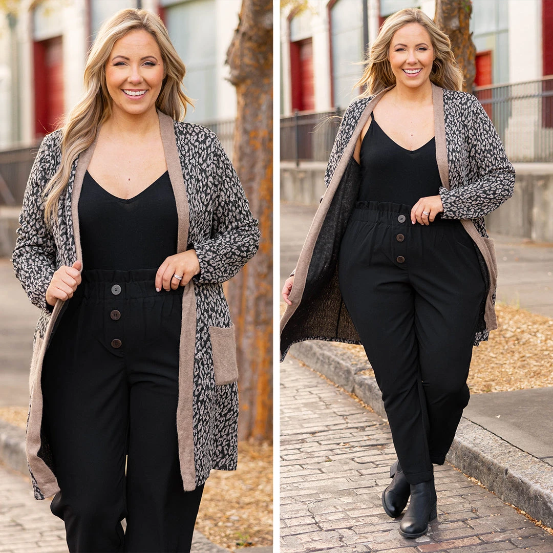 Who doesn’t love a cozy cardi?! This cardigan has a classic black color with a trendy leopard pattern and comfy fit that is just in time for the season! We love this cardigan with a solid top and cute pants for a flirty chic look!