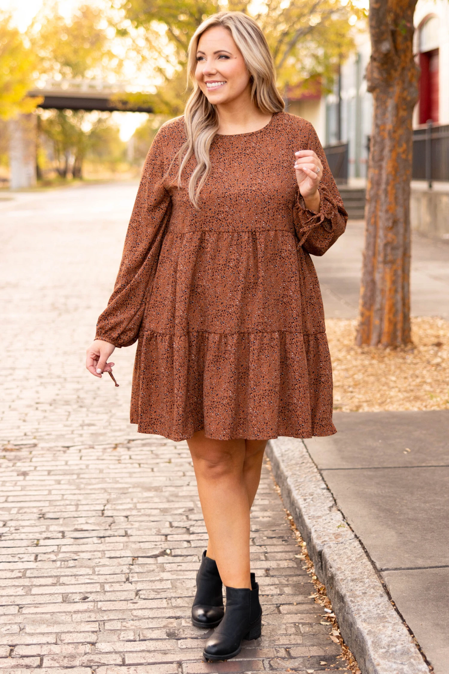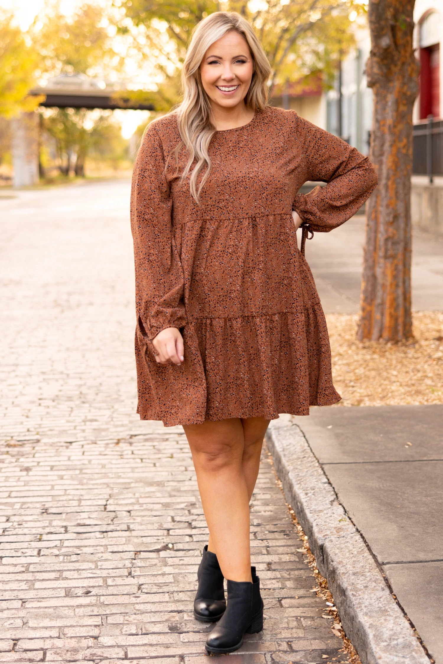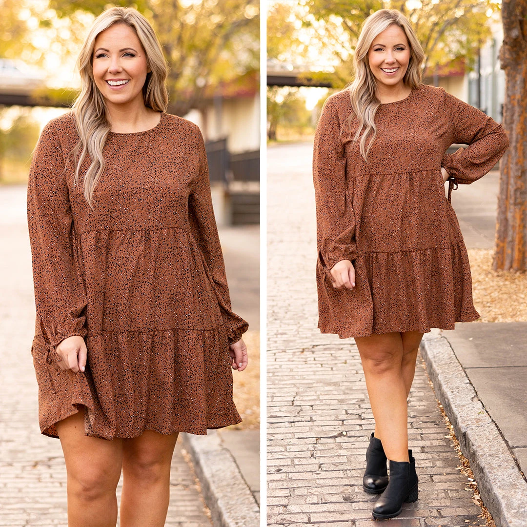 We simply love this beautiful dress! This dress has a lovely rust color with a babydoll design and adorable ties on the sleeves! The flirty, flowy length is perfect for a brunch date with the girls! Style this dress with some booties and cute accessories for a sassy chic look!