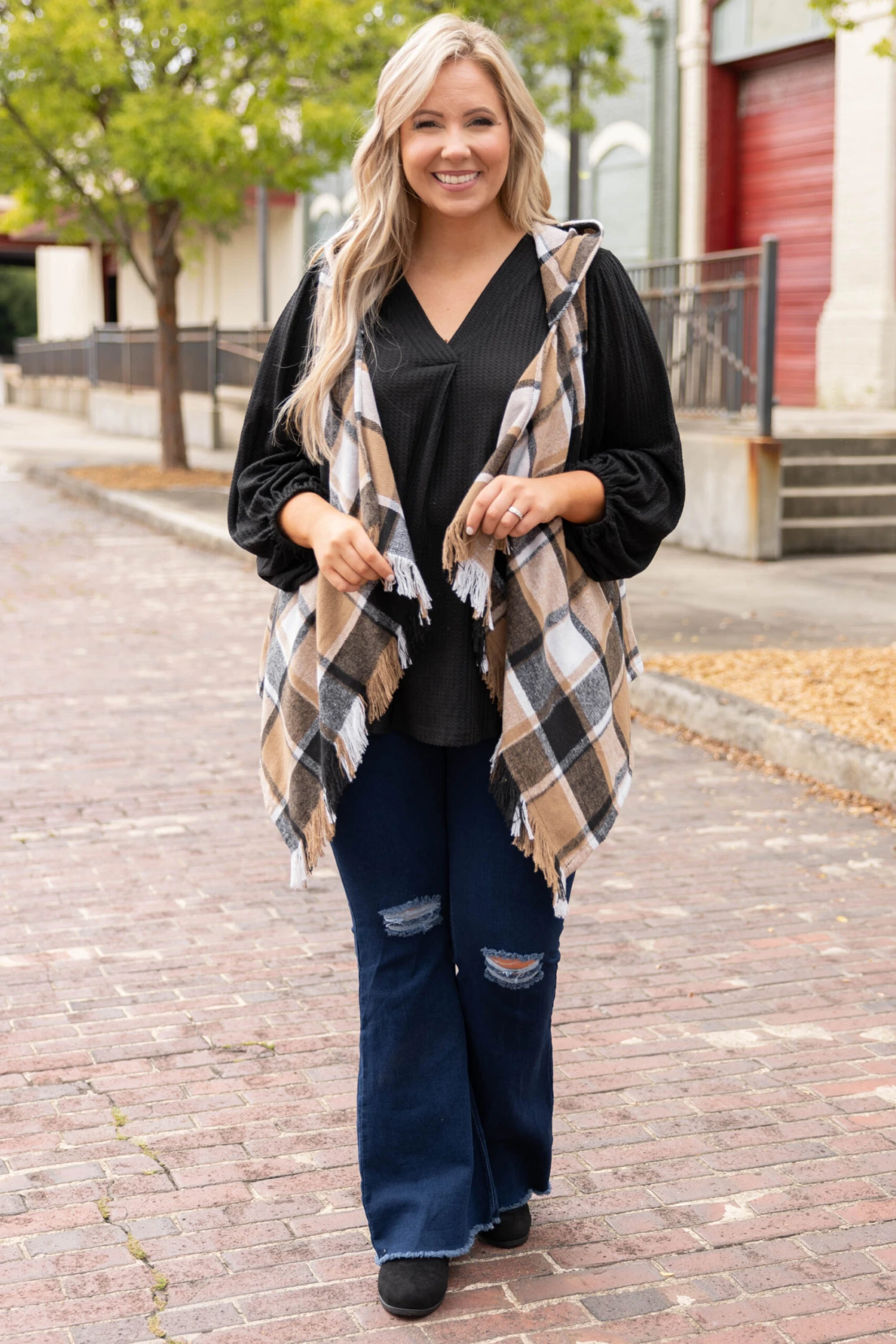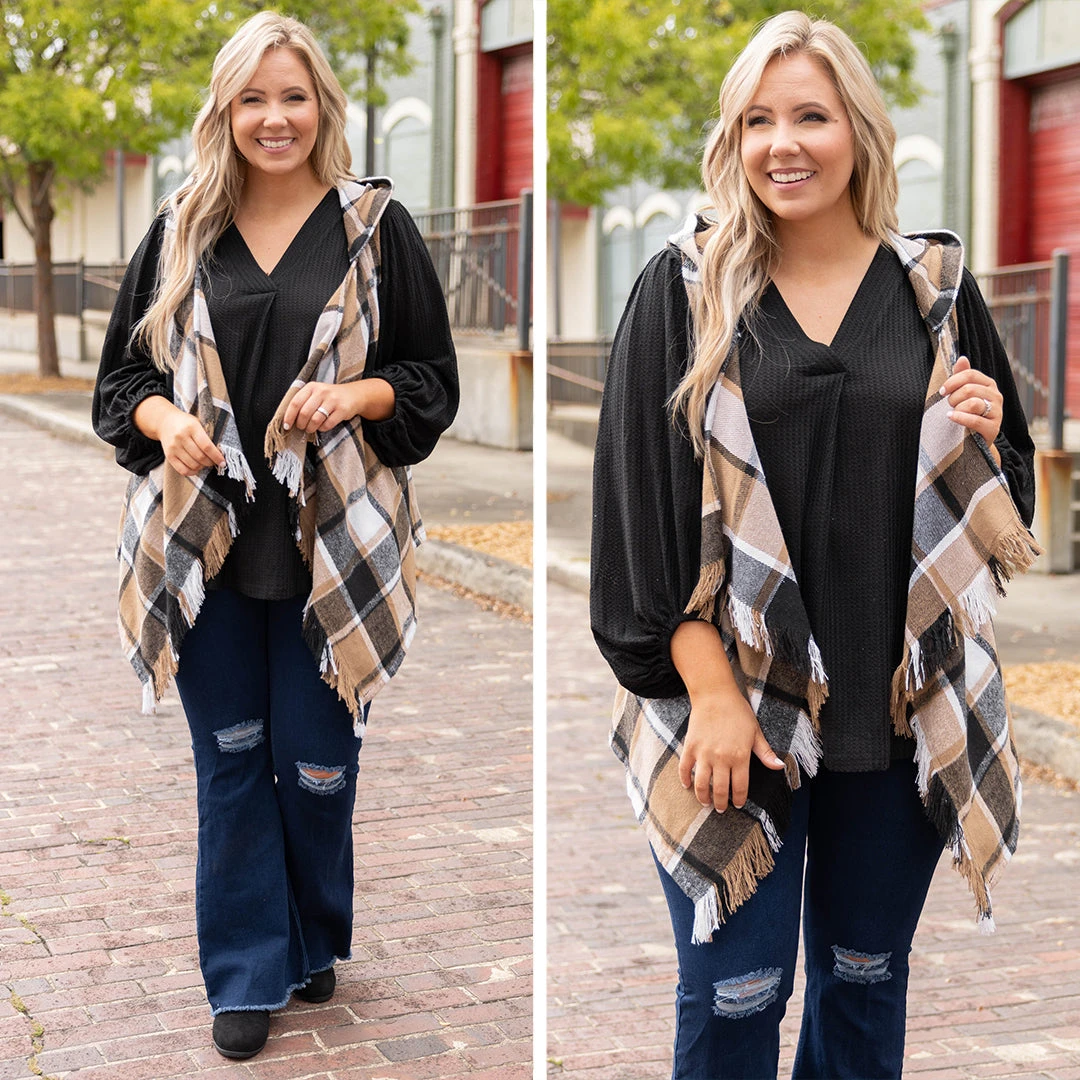 Cozy up by the fireplace in this chic vest! It features a cool hood, a fun plaid pattern and trendy fringe on the hem. Style this vest over a solid top paired with jeans for a cool weather look!