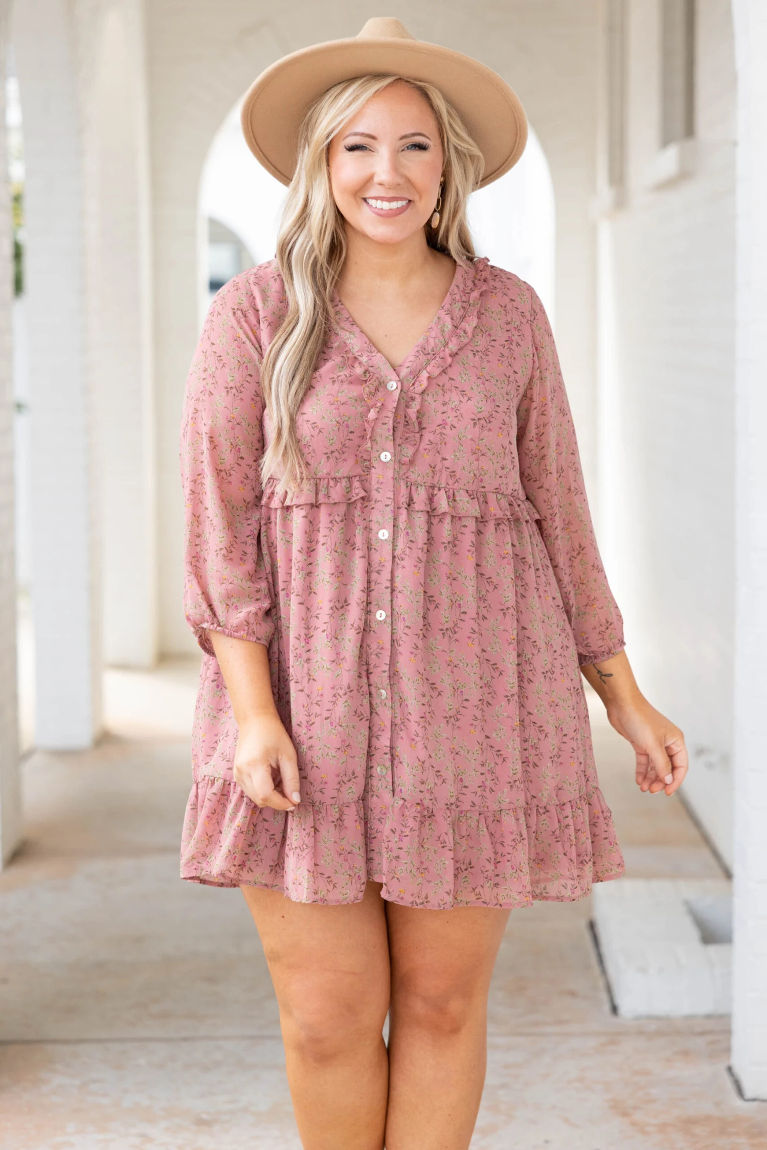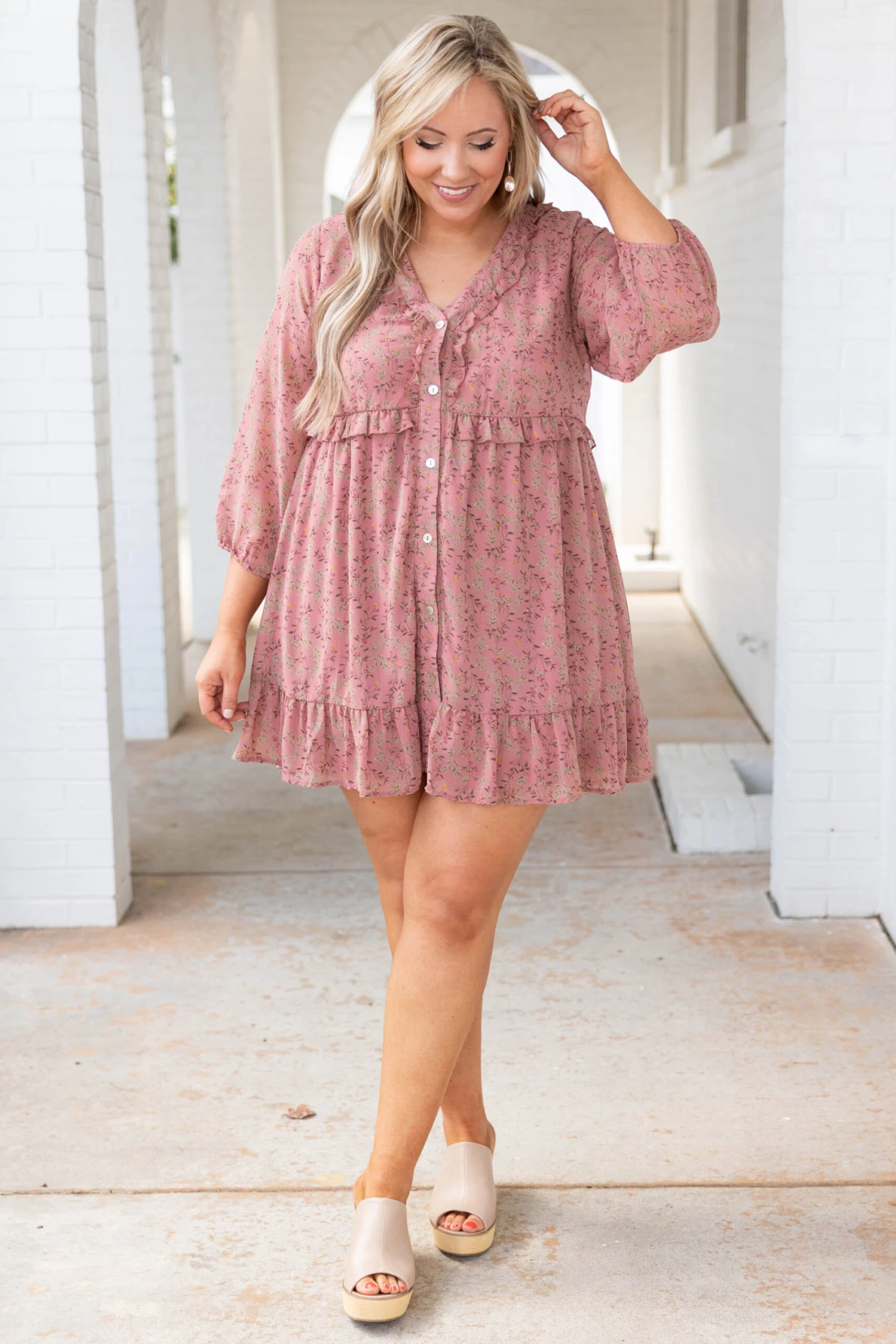 We love this dress! This dress has a dainty fall floral print with various colors you can style for every occasion! It’s comfortable for all-day wear, has a flowy baby doll fit to flatter your figure, and can be styled with all of your favorite accessories! Pair this dress with wedges or sandals for your next event!
