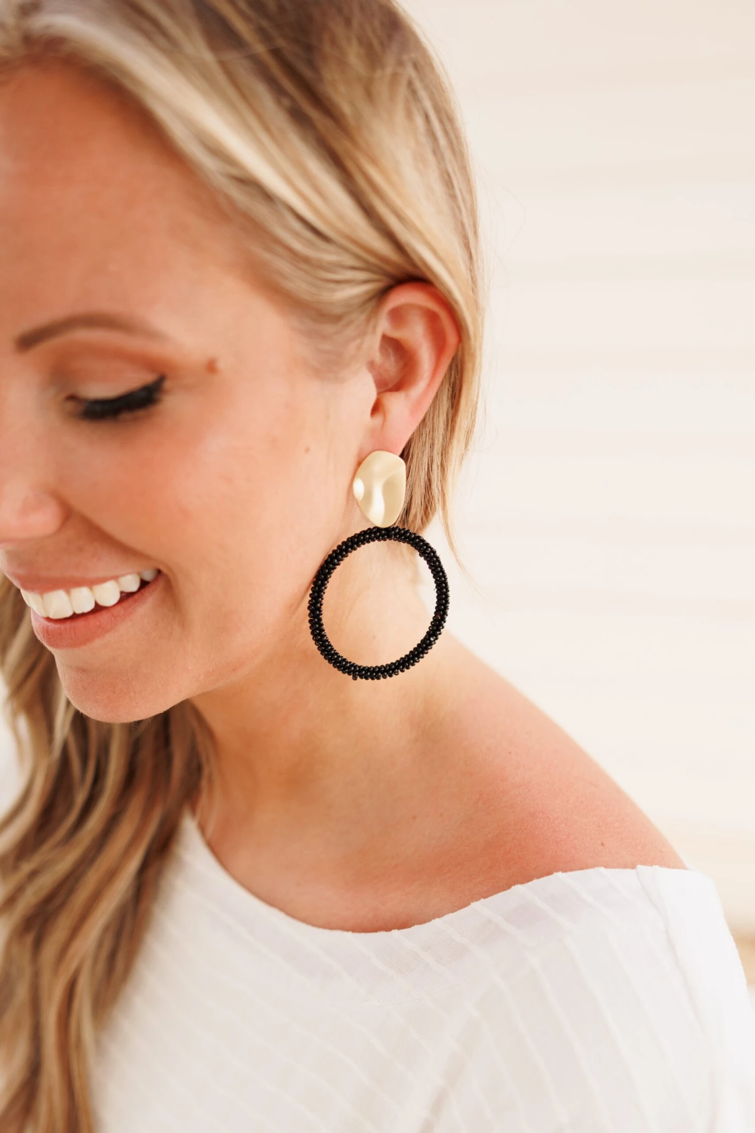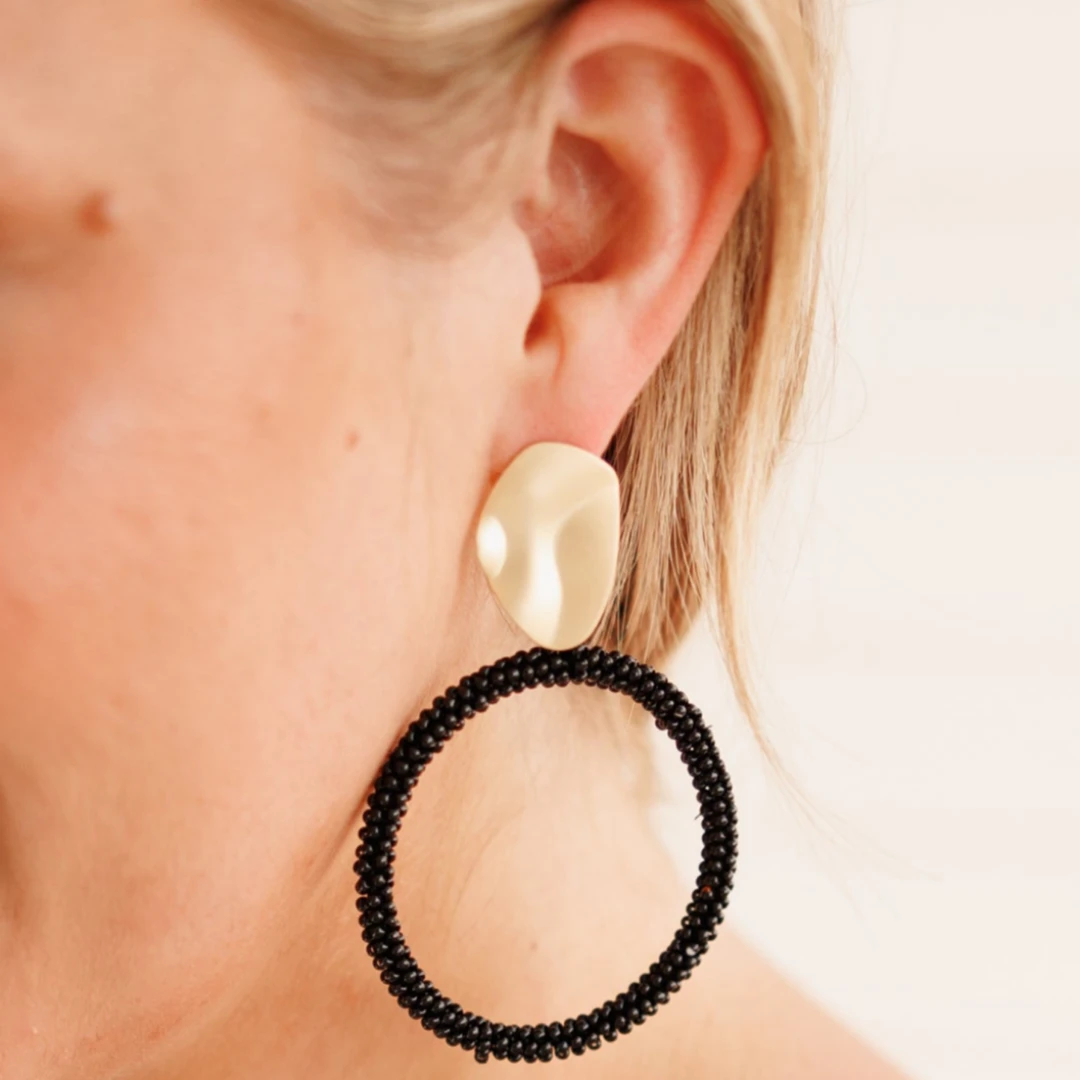 We are in LOVE with these adorable earrings! They offer a dangle style and beaded design for a classic look! The black color offers a neutral tone, complemented by a gold accent for a touch of elegance! The perfect finishing touch to any look!