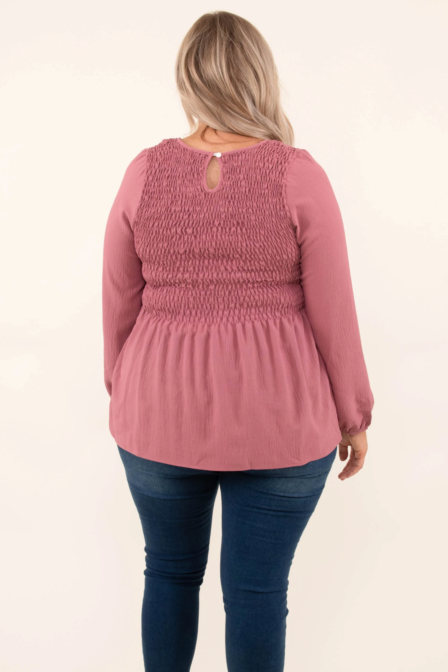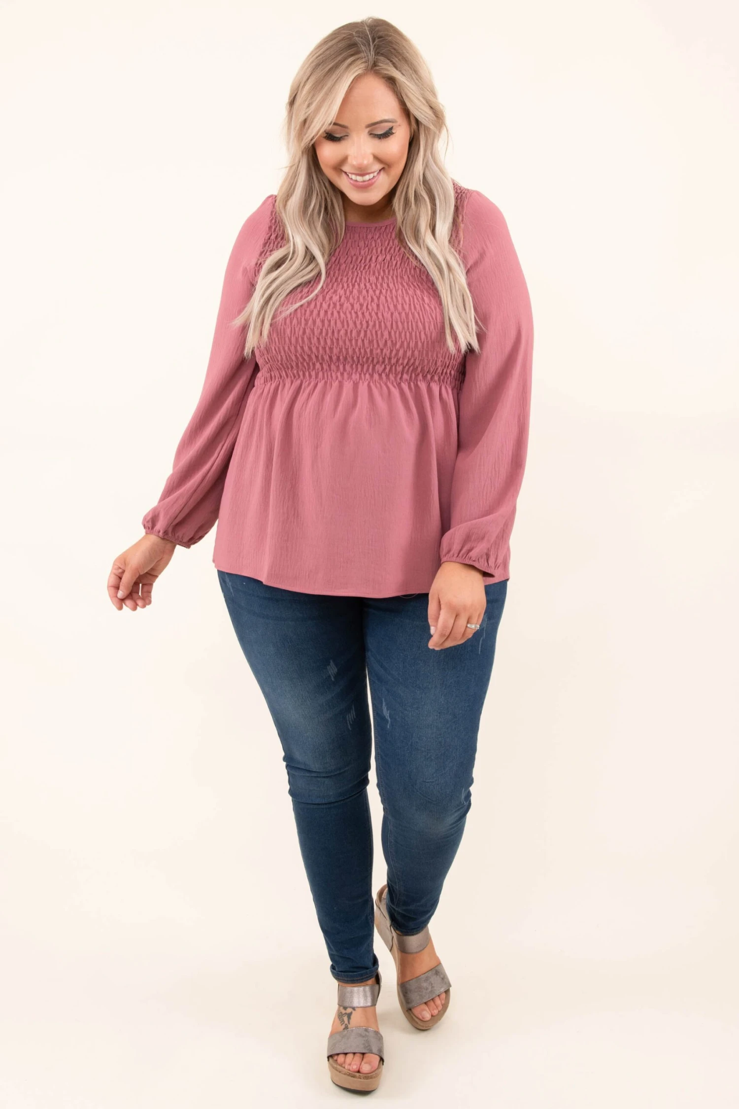 This top is so worth it! It has a wonderful mulberry color and a cute baby doll style and the trendy smocking fabric across the chest. It’s perfect for a day at the office or a fun dinner with friends! Style it with dark wash skinnies and booties for a trendy look!