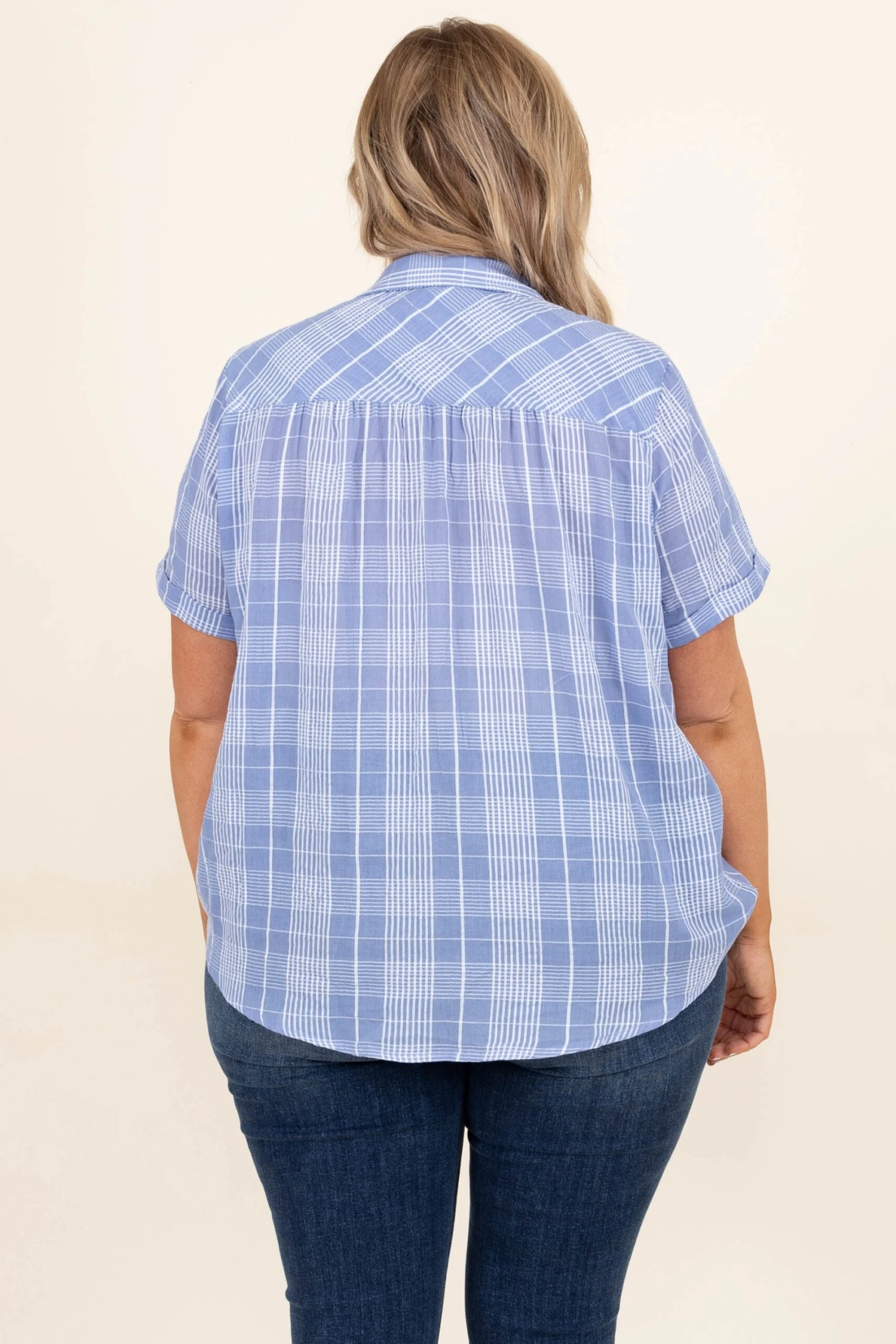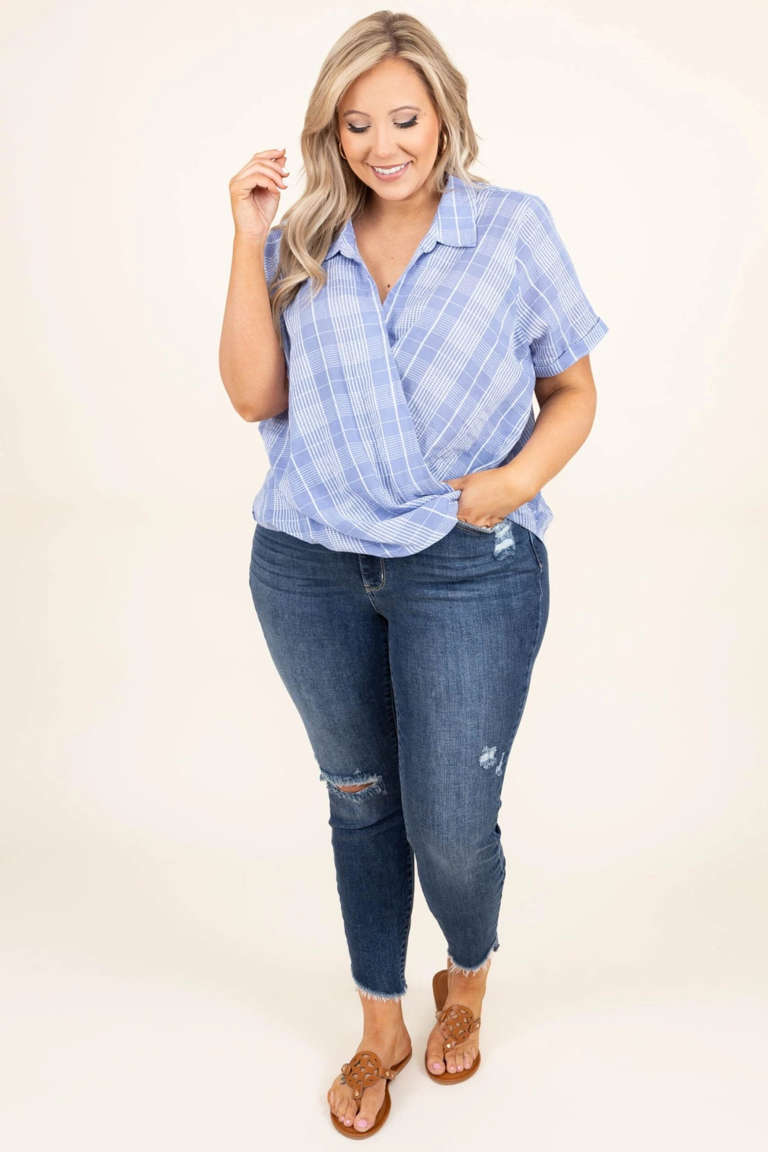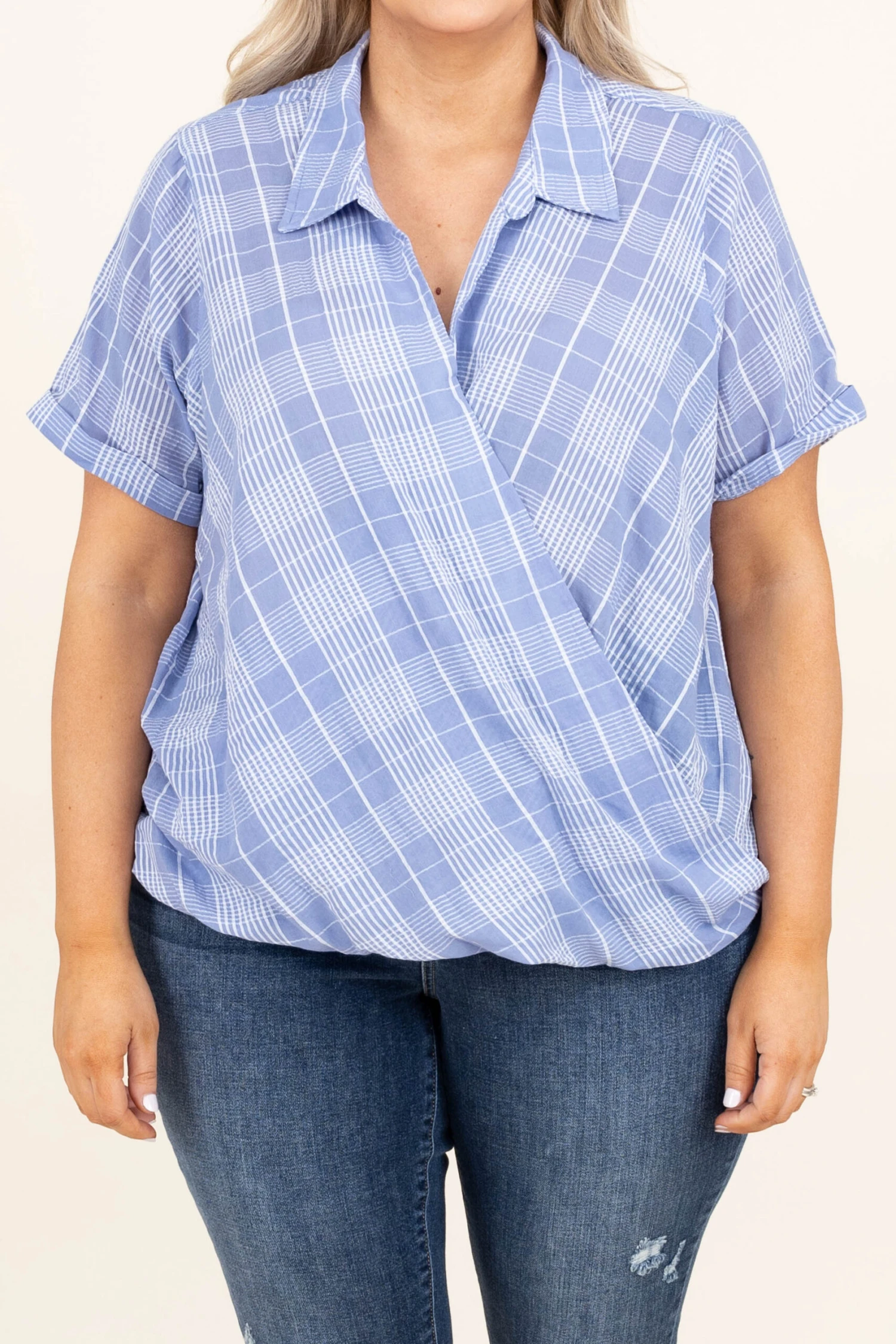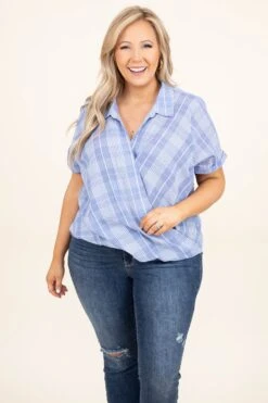 Live it up big time in this adorable top! The powder blue color is so sweet and the plaid design is so trendy! We love the crepe fabric and surplice front that snaps for a fuller coverage look! Style this with a great skinny and a cute sandal to look oh so good!