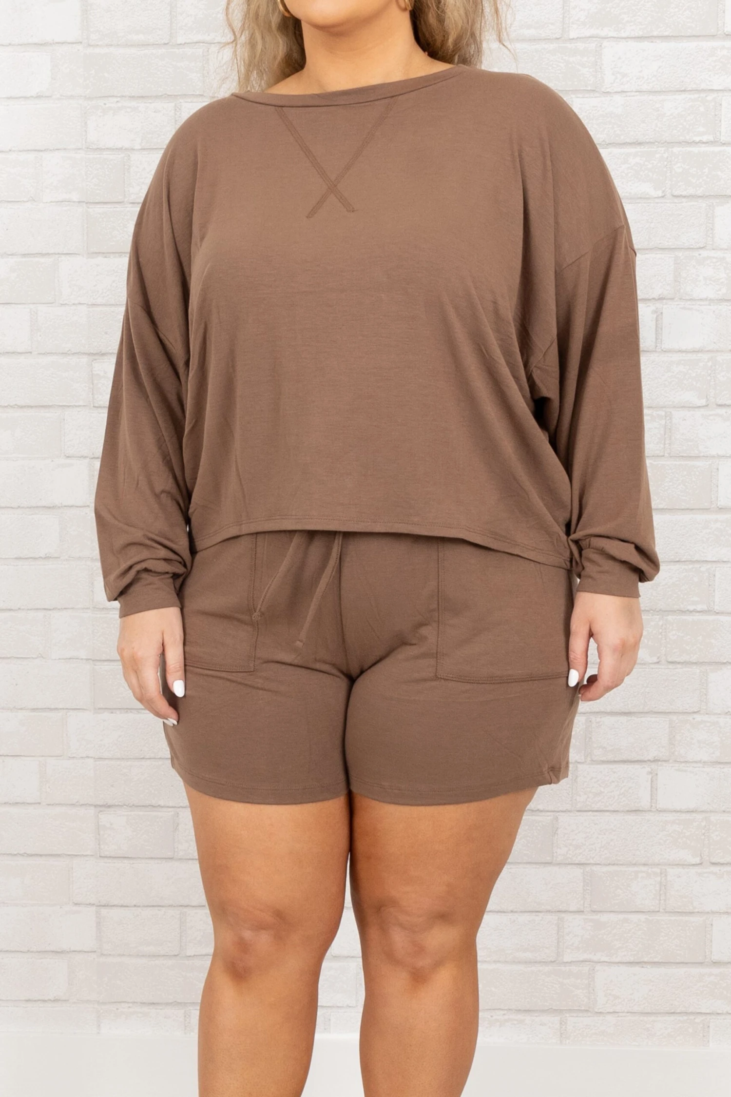 Live, Love, and Lounge in this adorable set throughout the season! It is a classic and stylish choice for your everyday wardrobe! Crafted with a neutral mocha color, this matching set is perfect for lounging around the house or for a casual outing! The cozy material is both cute and comfortable, creating an effortless look you will love!