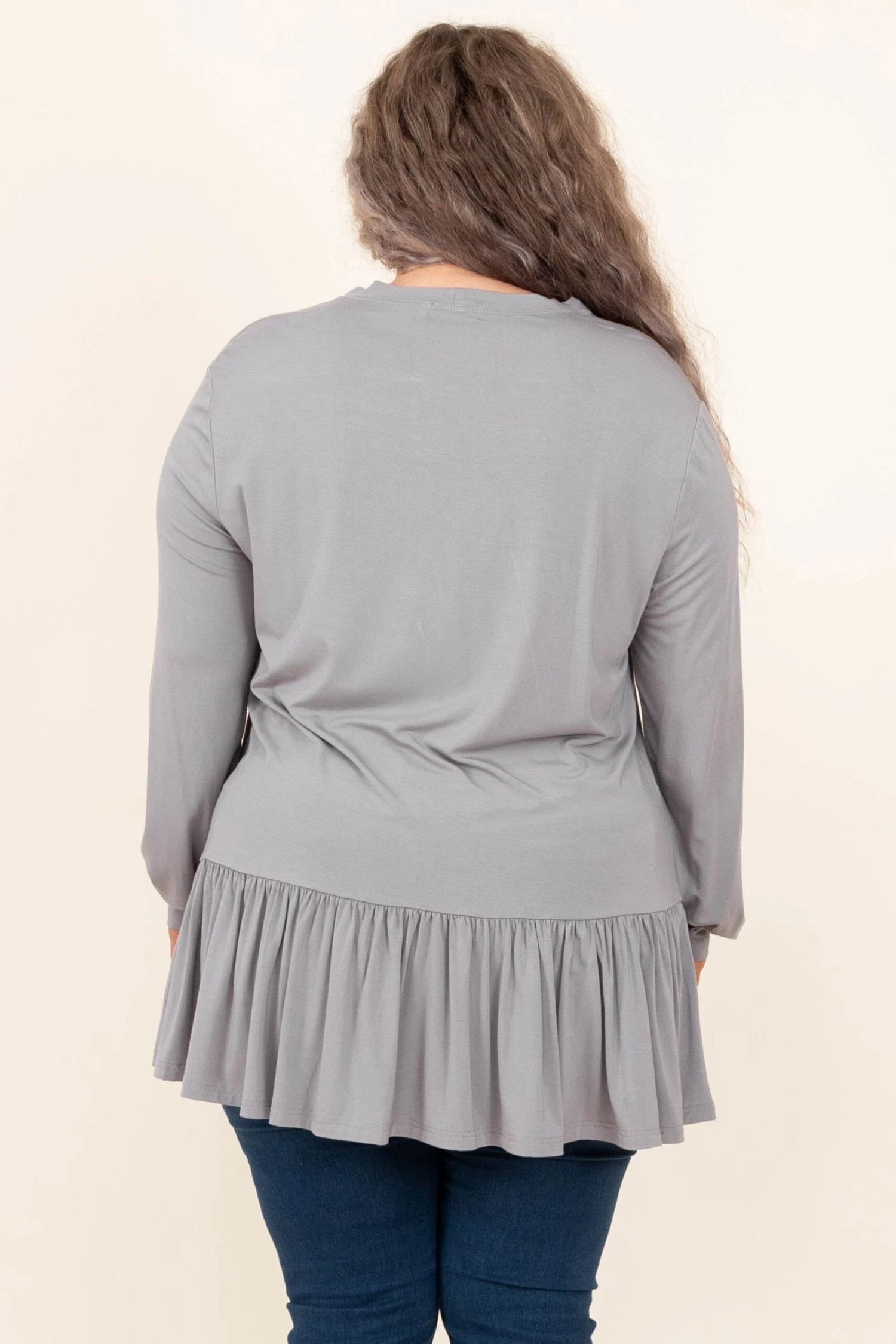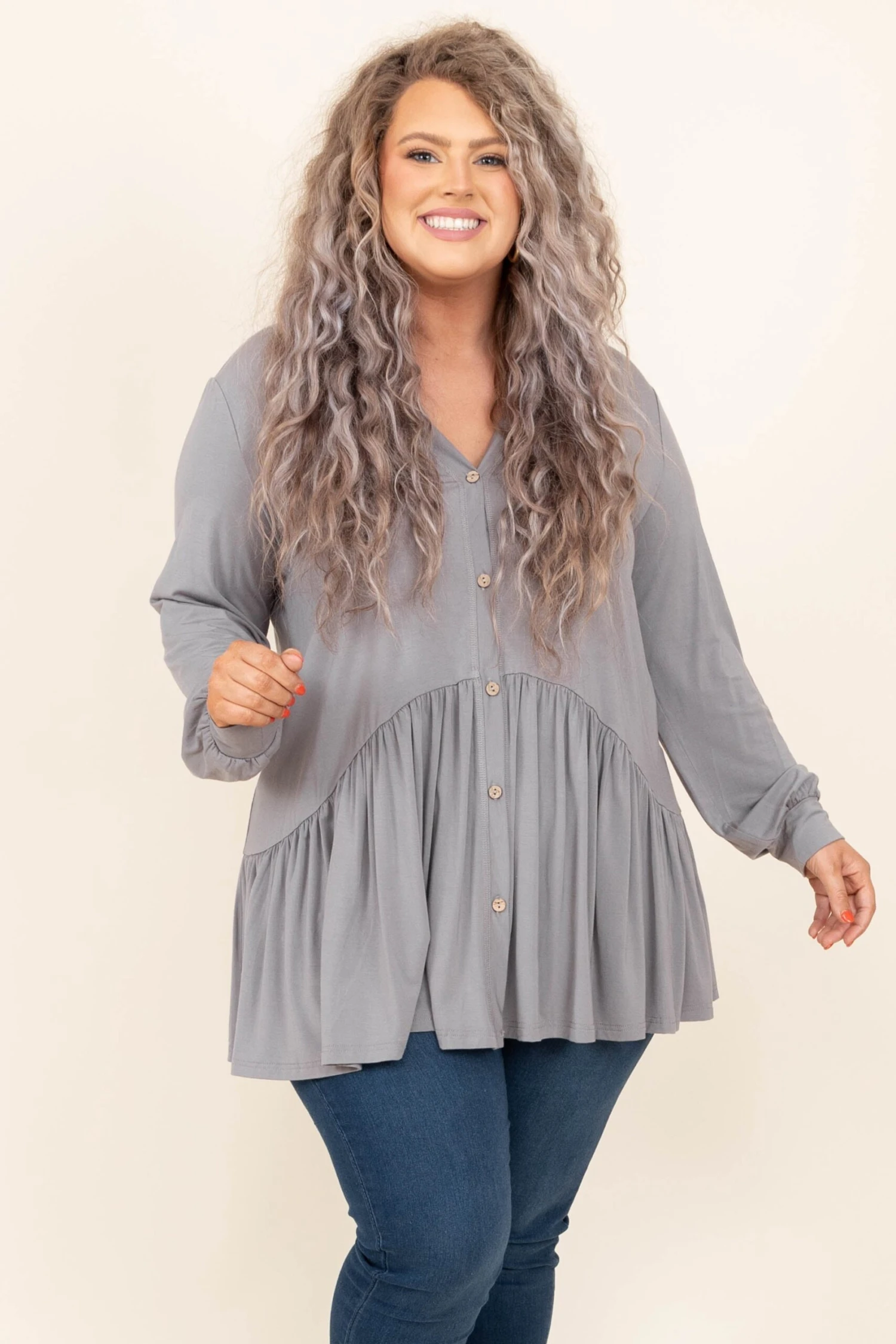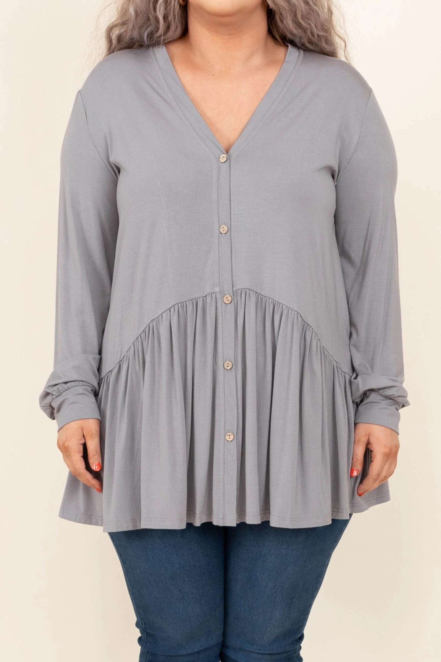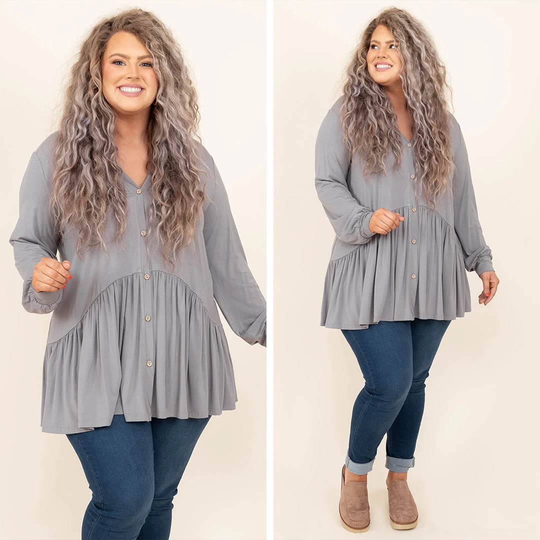 We simply LOVE this top! This top has a lovely gray color and a trendy babydoll design that is perfect for the season! The stretchy, figure flattering fit is great for all day wear! Style this top with some patterned pants or skinnies for a casual, chic look!Â