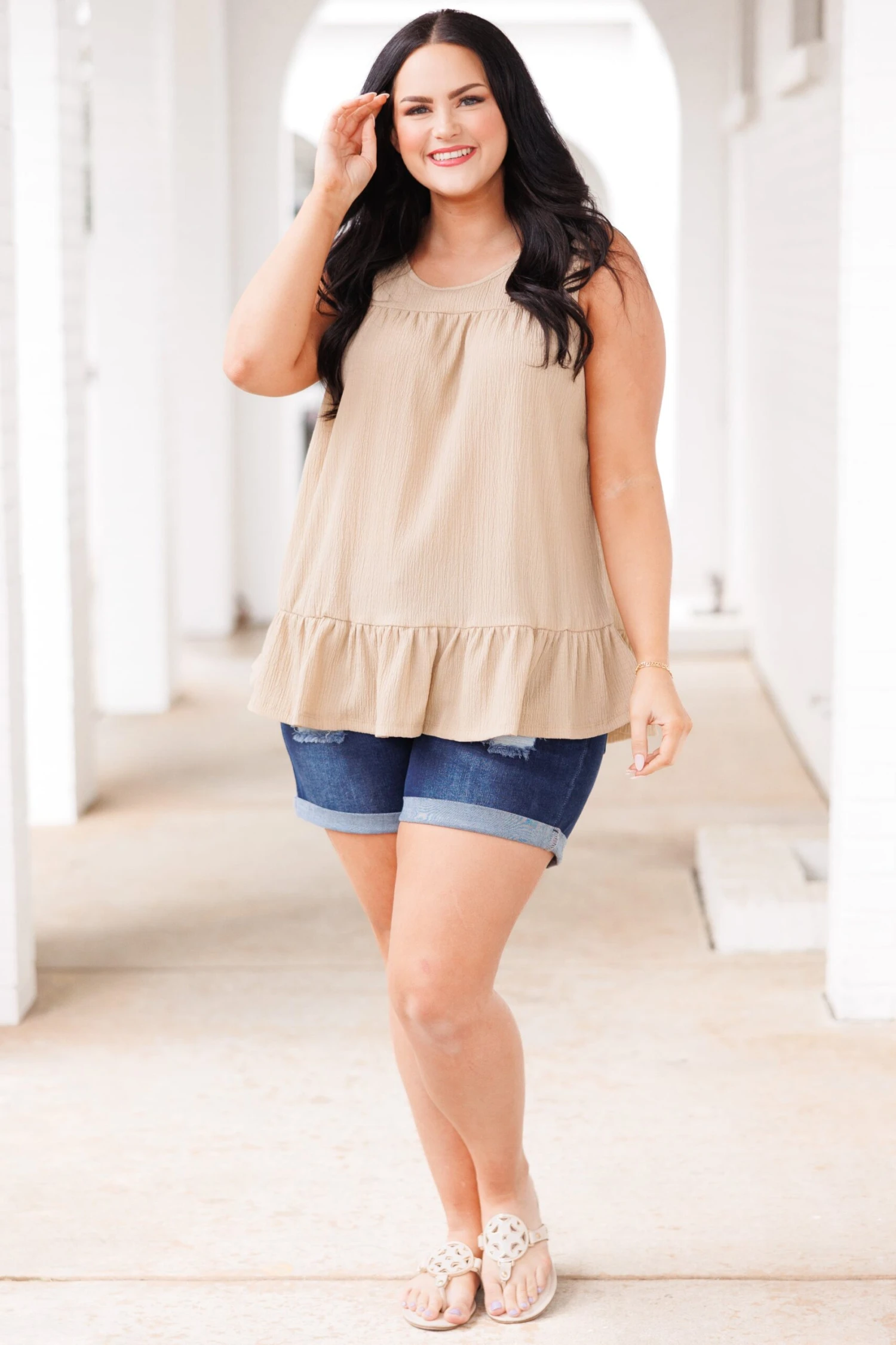 Look stylish and chic in this FAB top! Featuring a classic babydoll design, this top ensures a flattering fit! Its neutral taupe hue is ideal for creating effortless day-to-night looks!