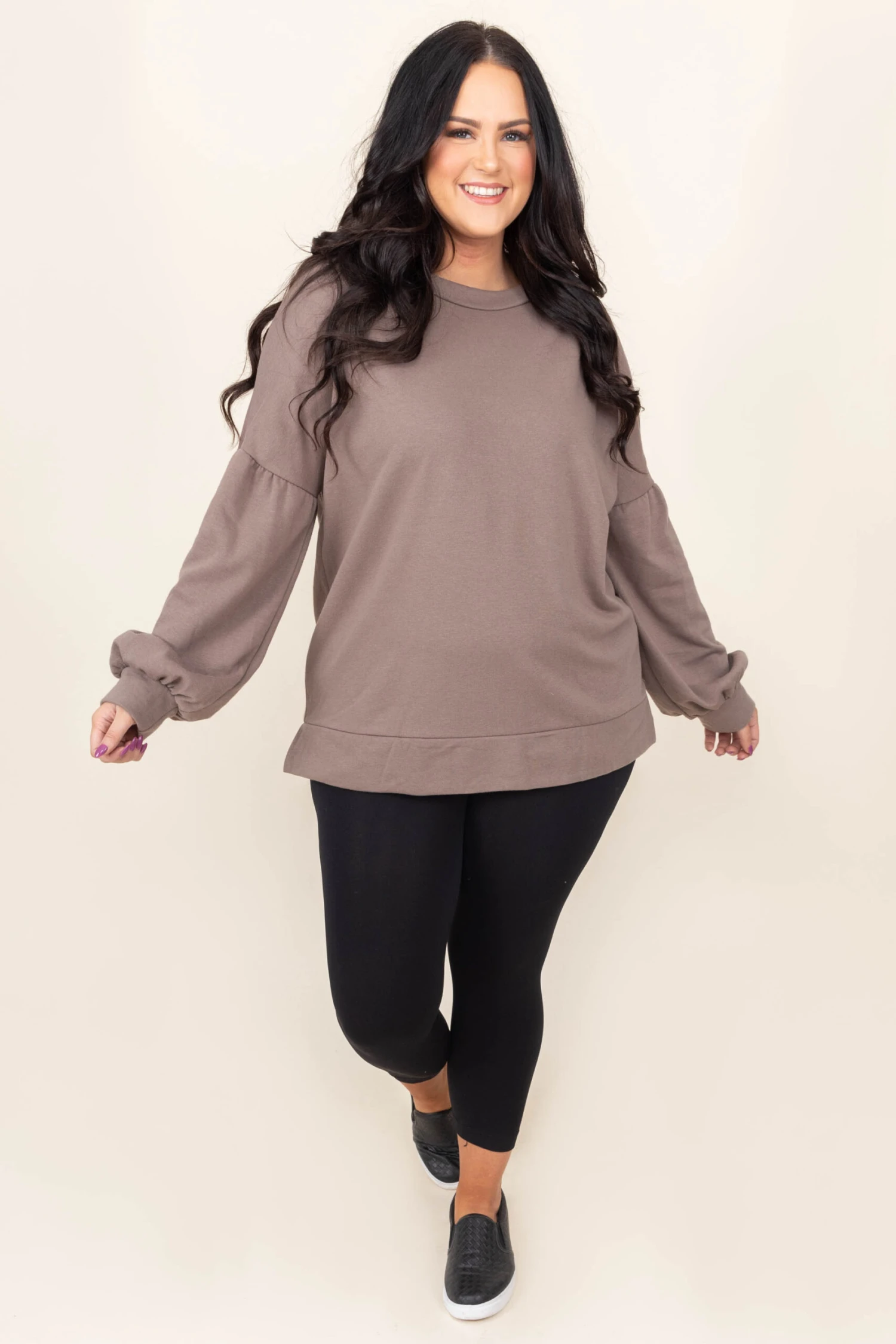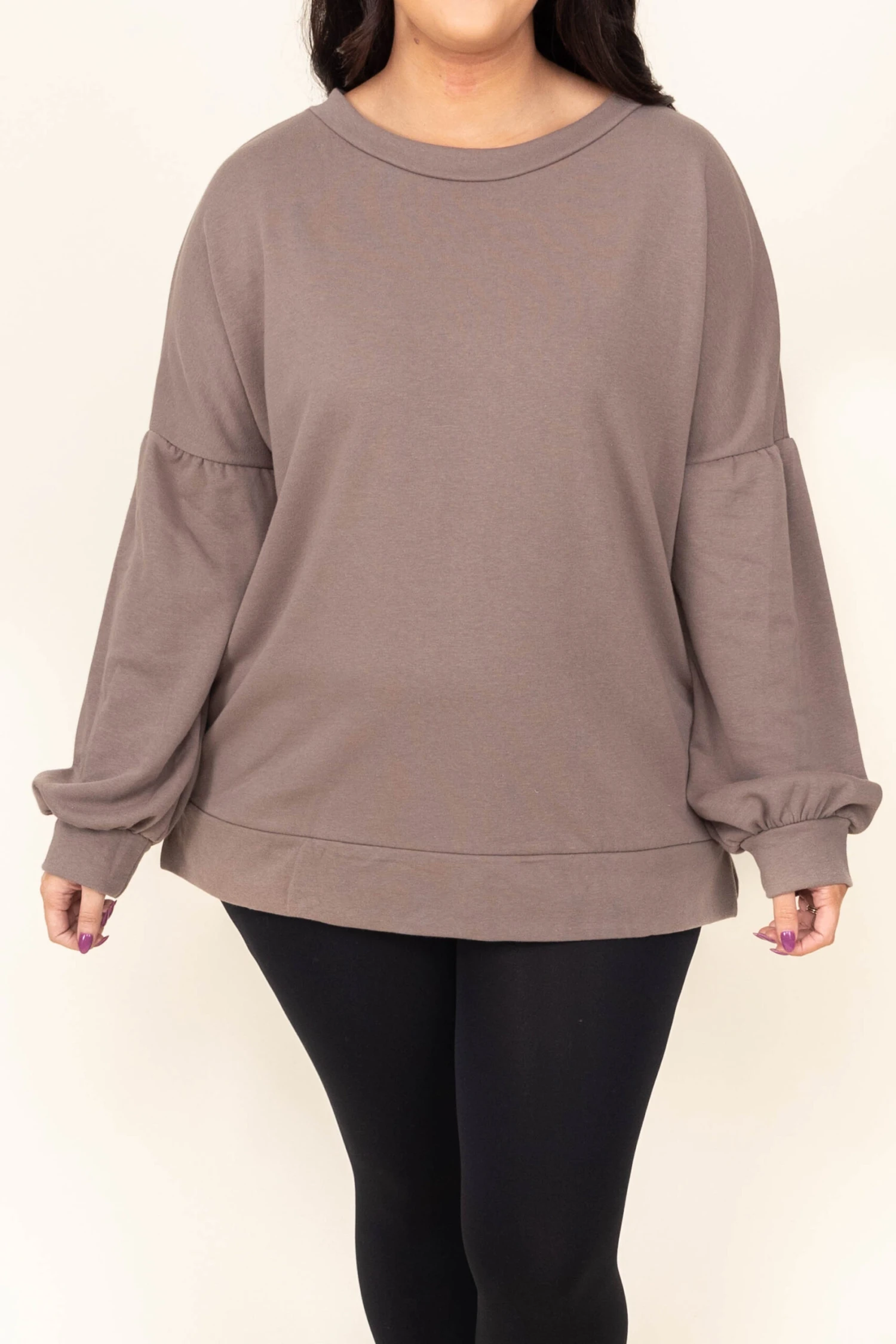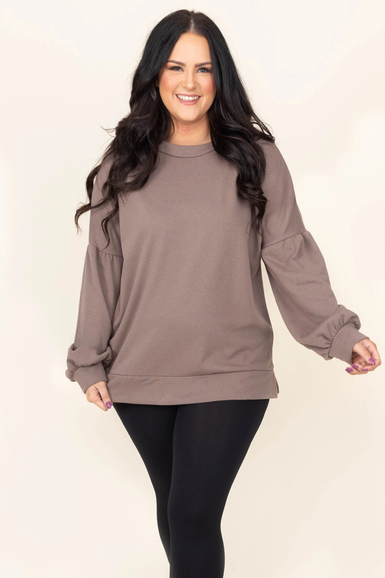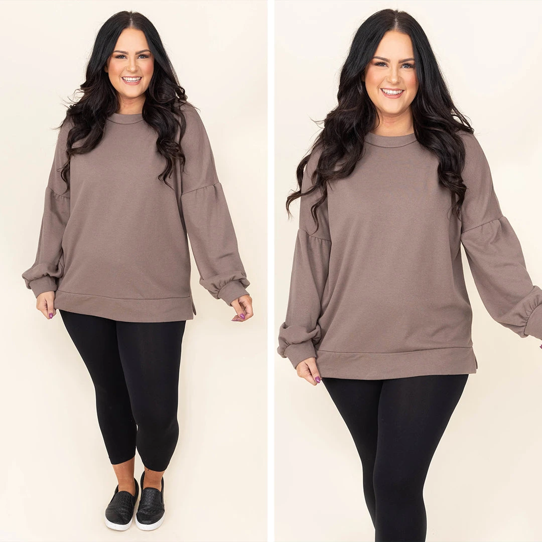 We absolutely love this sweater! It has a solid mocha color and a cool banded hem. This sweater is comfortable for all day wear and is perfect for the season! Pair this with leggings and boots for a comfy look!
