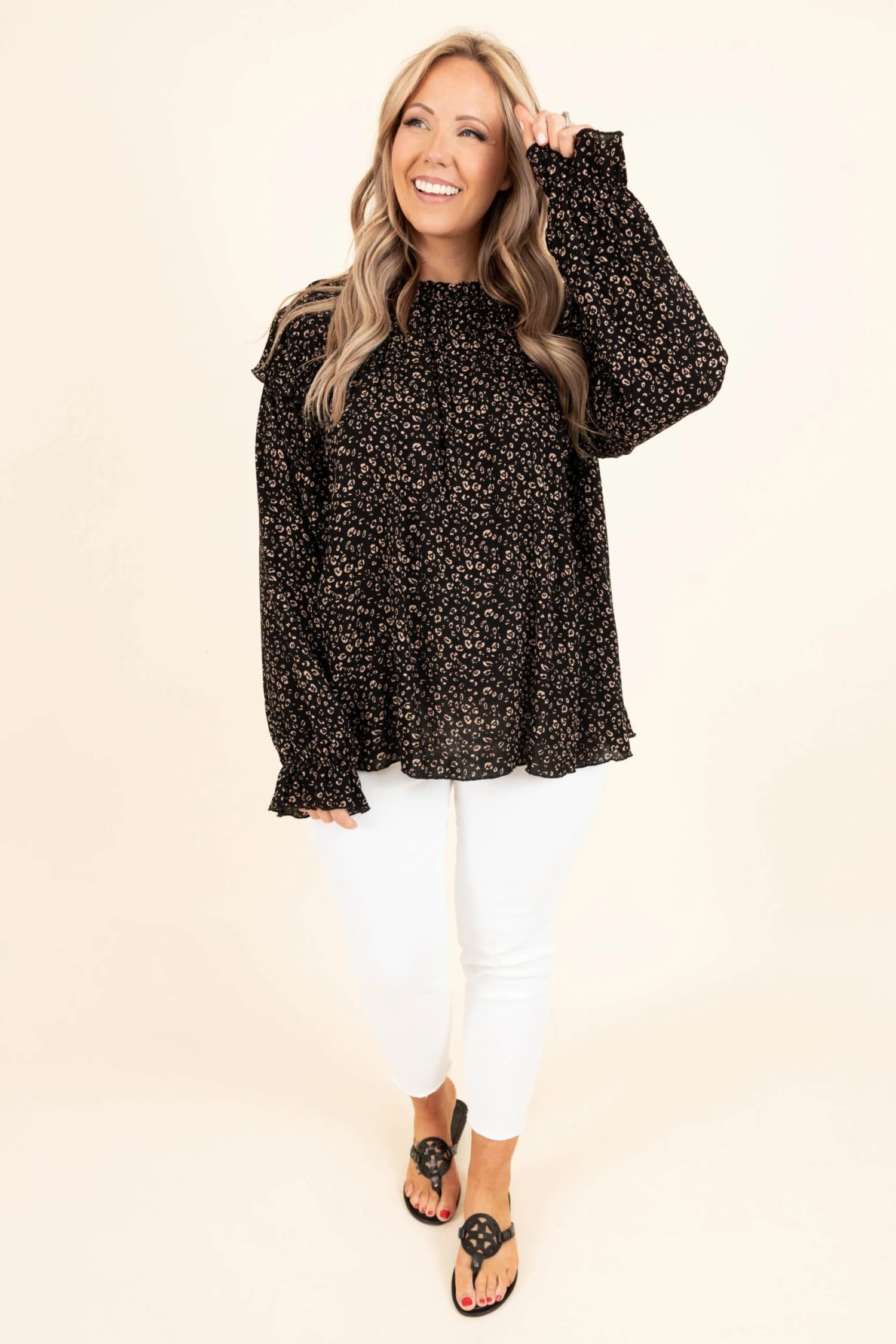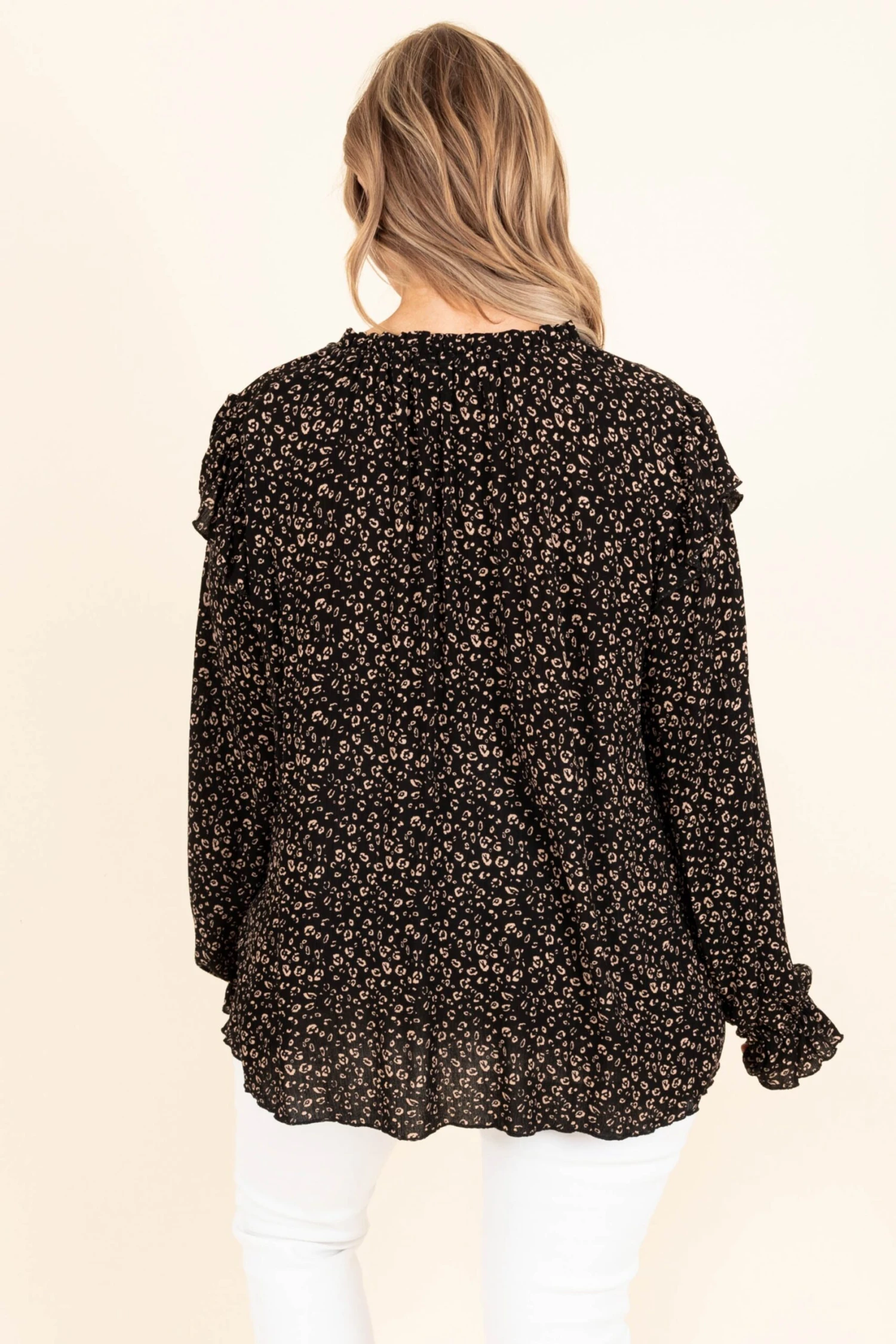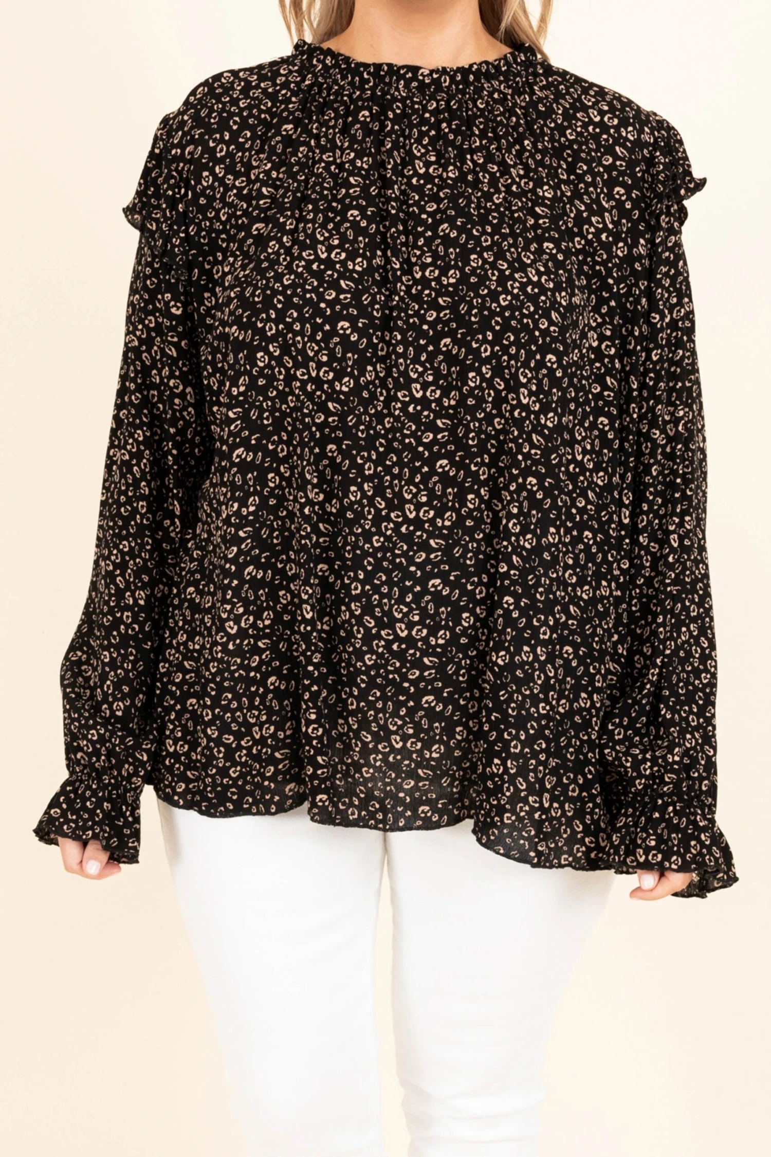 We simply adore this top! This top has a classic black color with a trendy leopard pattern that is oh so sweet! The ruffled neckline and flowy fit is perfect for any occasion! Wear it in the office with some cute pants and heels or keep it casual with some leggings and sandals for the ultimate chic look!
