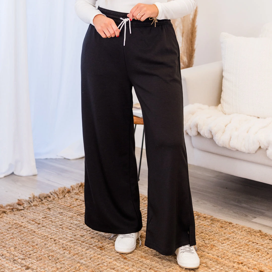 Stay cozy and stylish with these pants in black! These sweatpants feature a white drawstring, side pockets, and a wide leg flow for ultimate comfort! The stitched hem adds a touch of elegance to these laid-back pants! Perfect for a relaxing day in or a casual outing!