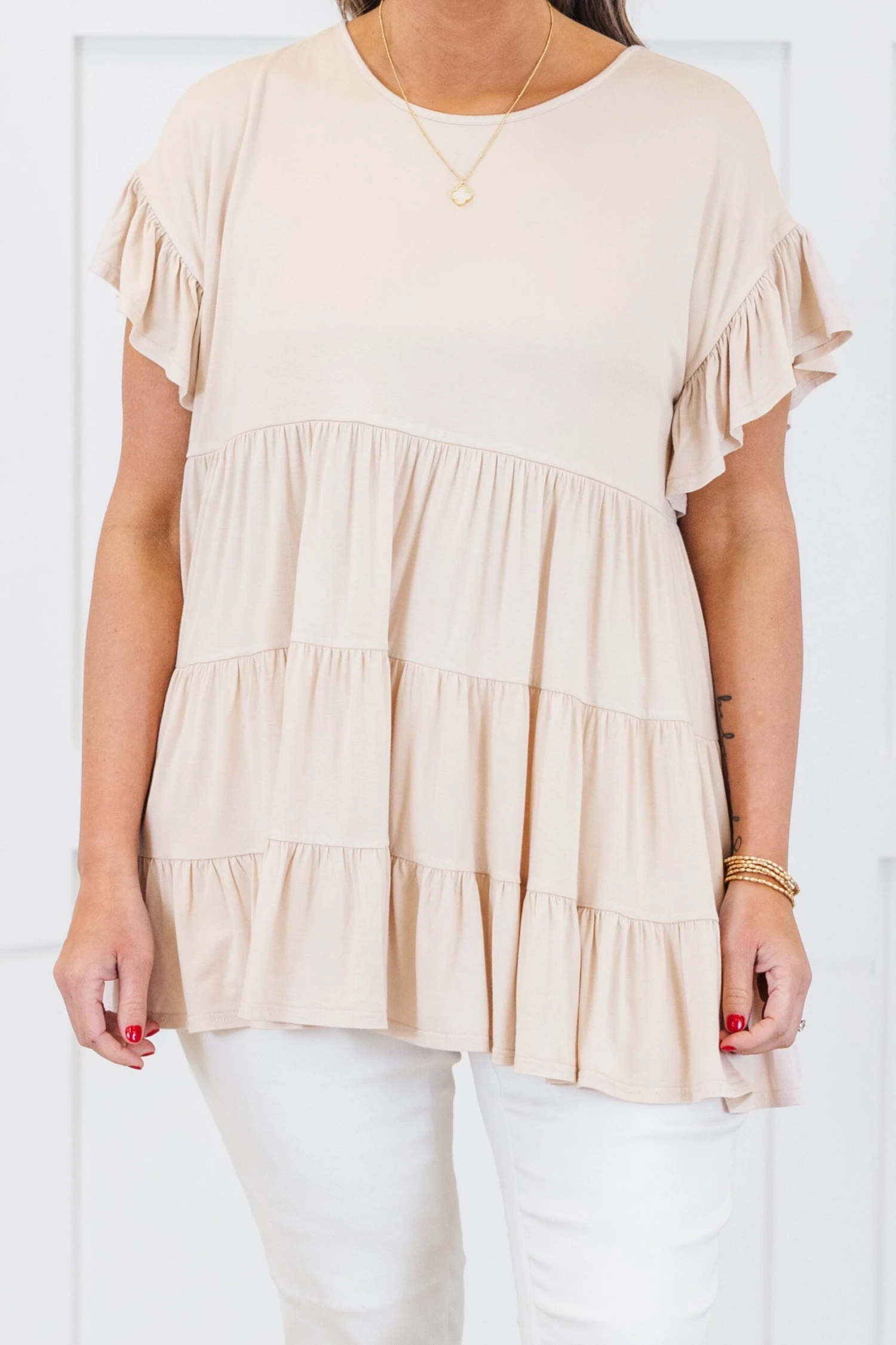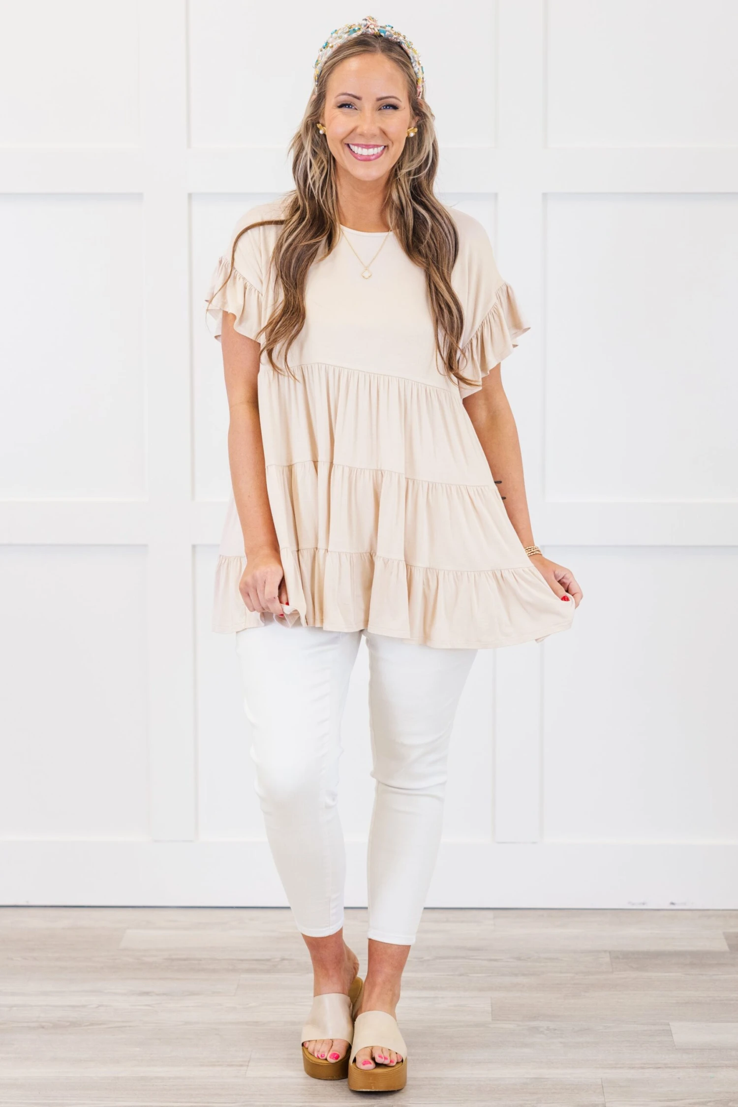 We are madly in love with this top! It has a beautiful flowy fit with a fun and flirty design that’s just too cute! The ruffled layers against the solid taupe color make for a top that is unlike any other basic piece in your collection! Wear this baby doll top with leggings and sneakers for an easy everyday look or dress it up with wedges and a statement necklace!Â