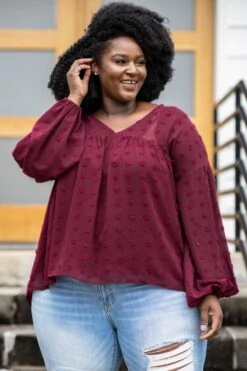 We are absolutely in love with this blouse! This flowy blouse has a chic burgundy color with the prettiest swiss dot fabric for a look you can wear everywhere! It’s soft, sweet, and sheer, featuring an attached lining along the front of the blouse! Not to mention how cute the billow sleeves are for your next event! Simply, style this blouse with skinnies and booties for an effortlessly beautiful outfit!Â
