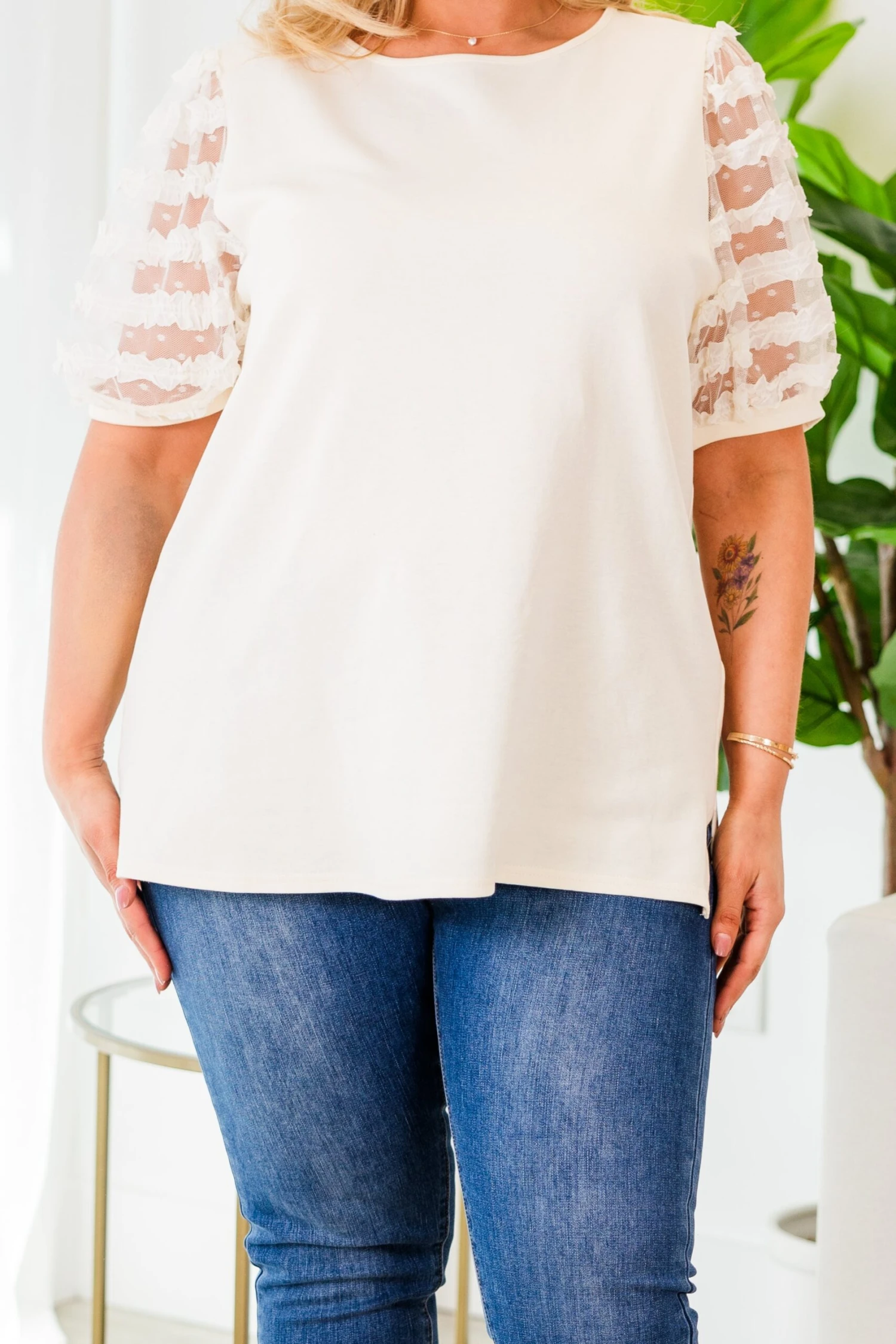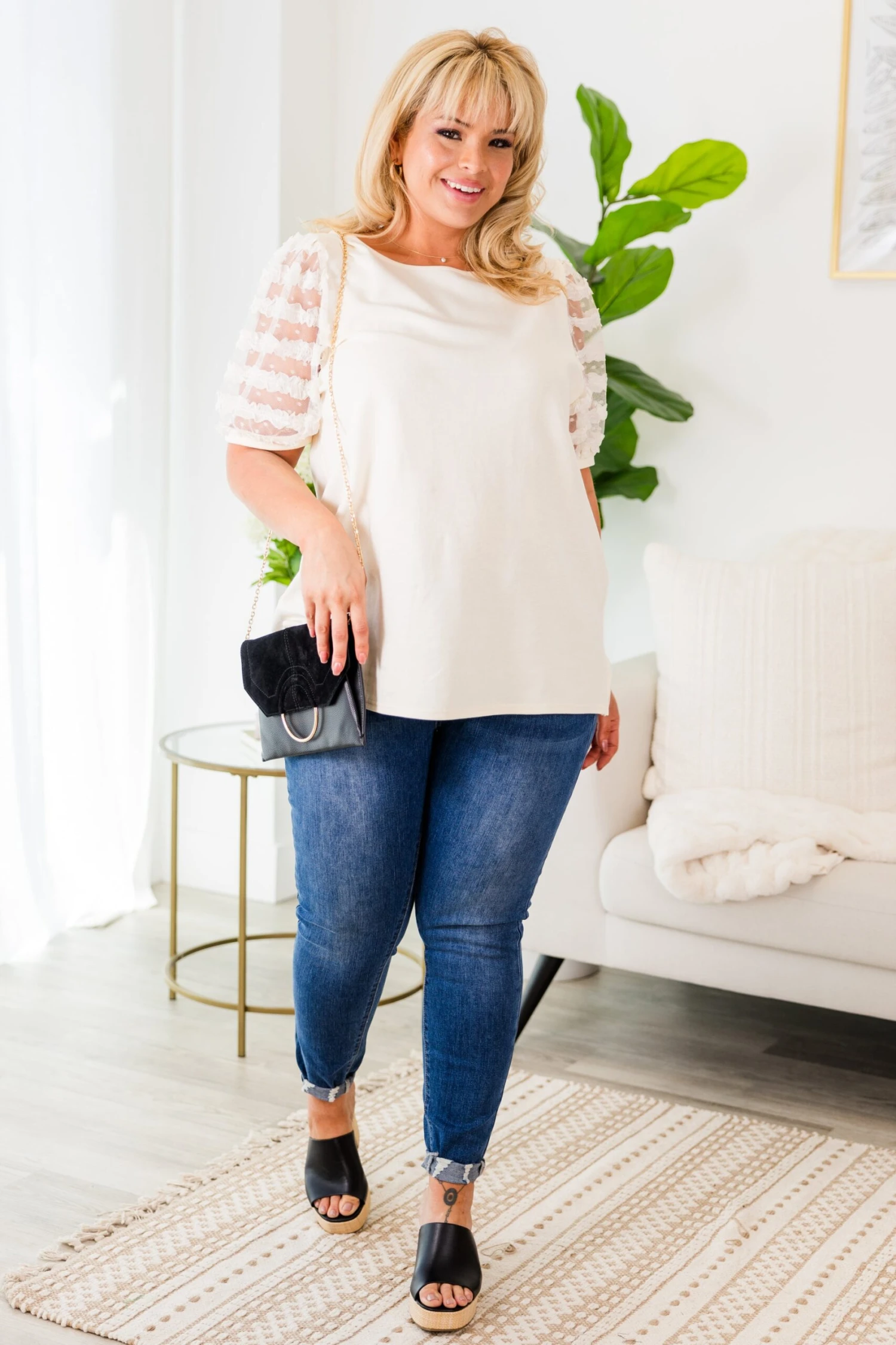 We are SO in love with this top! With sheer sleeves and delicate lace detailing, this neutral cream top exudes elegance and comfort! Experience true style and comfort with this must-have piece!