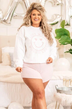 Love more, worry less with this sweatshirt in your wardrobe this season! The classic white color is sure to wow and the fun graphic is so trendy! Pair this top with skinnies or shorts sneakers for a comfy chic look!