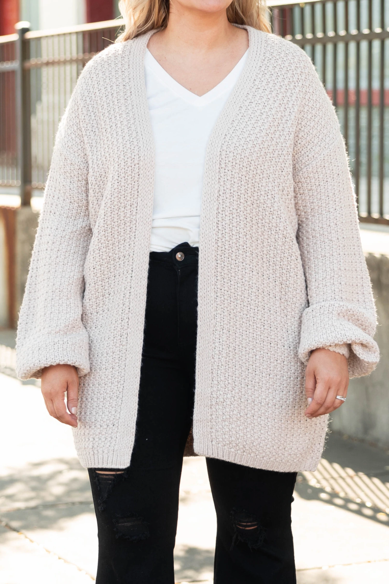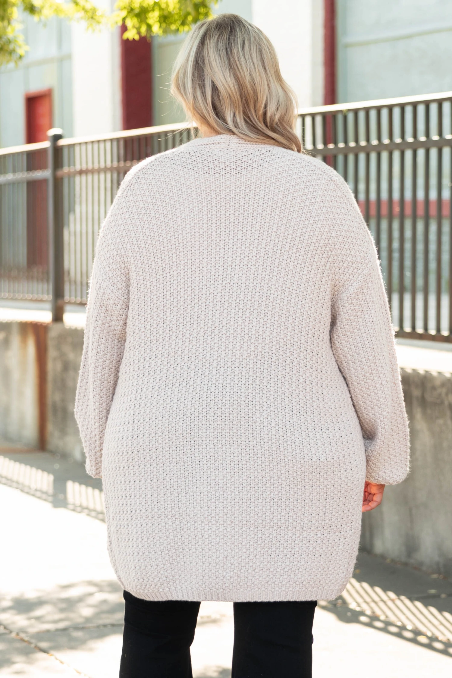 We LOVE this cozy, beautiful cardi! This cardigan has a soft, taupe color and a knitted design that is perfect for those cool days ahead this season! Grab this cardi as your go-to layering piece for a comfy, chic look!