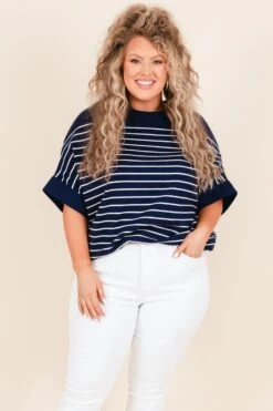 We mean it when we say we love this top! This top has a simple stripe pattern with a navy color that is perfect for the season! It’s comfortable for all-day wear, has an oversized fit, and features the cutest pre-cuffed sleeves! Style this top with skinnies or shorts for an easy everyday look!Â