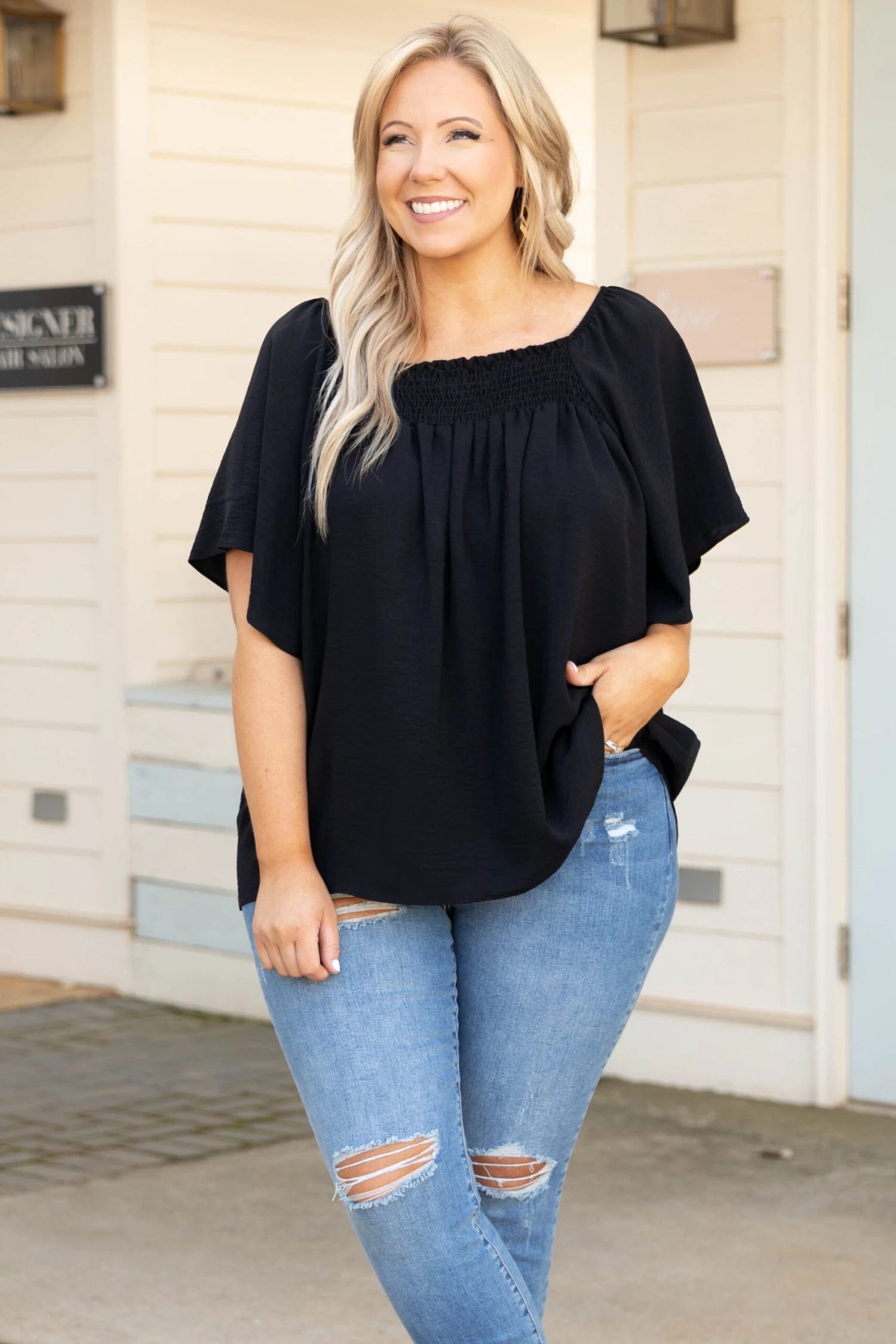 Feel luxe in this adorable black top this season! The material is oh so soft and the relaxed fit flatters everyone! The flutter sleeves give this top a sweet feminine feel and the green color will catch everyone’s eyes! Pair this with skinnies and booties for a super stylish look!