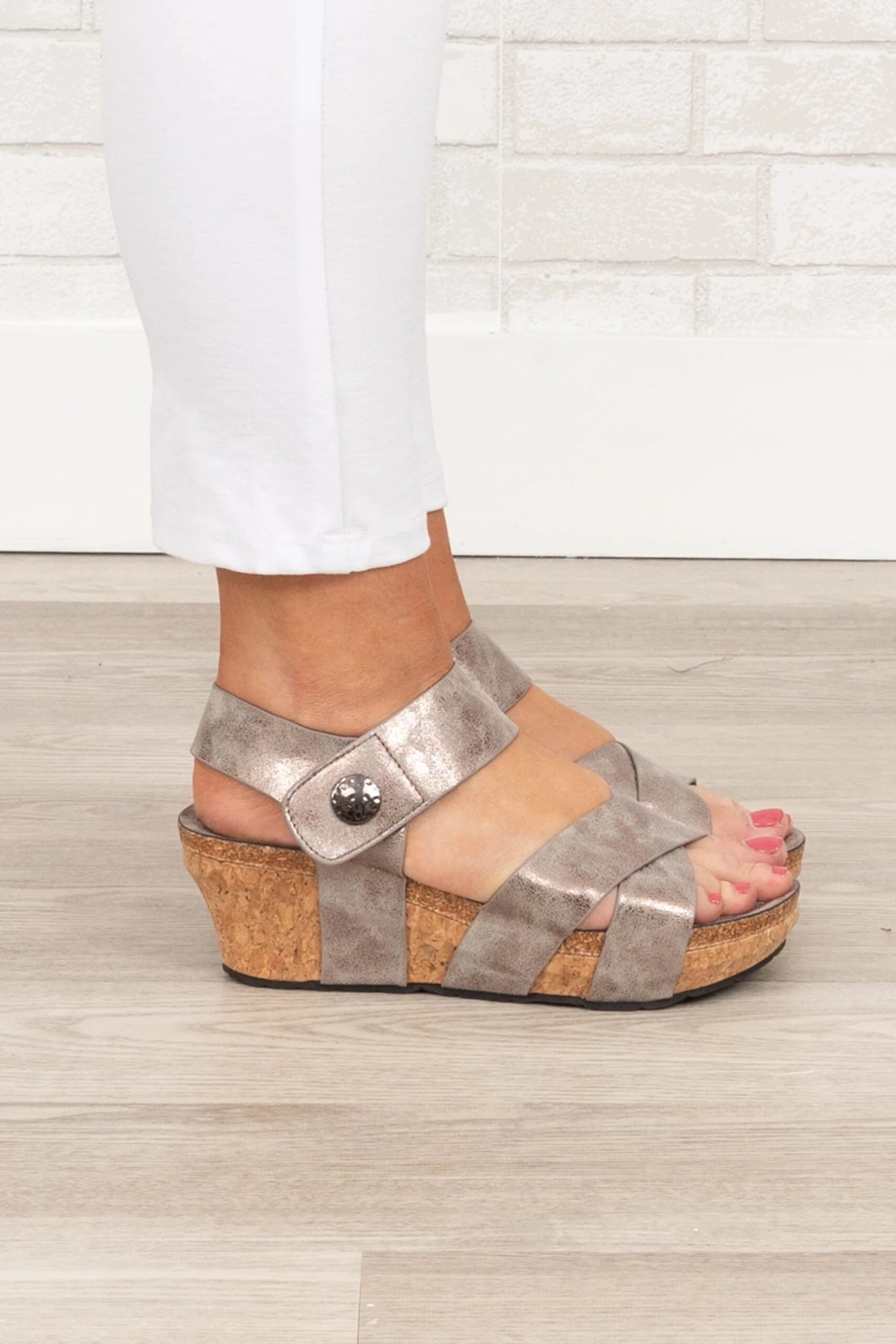 Make your way to the checkout with these cuties! These wedges have a fun pewter color that is so easy to pair with all of your faves! They are super comfy and chic! Style these wedges with a flirty dress and cute accessories for your next event!