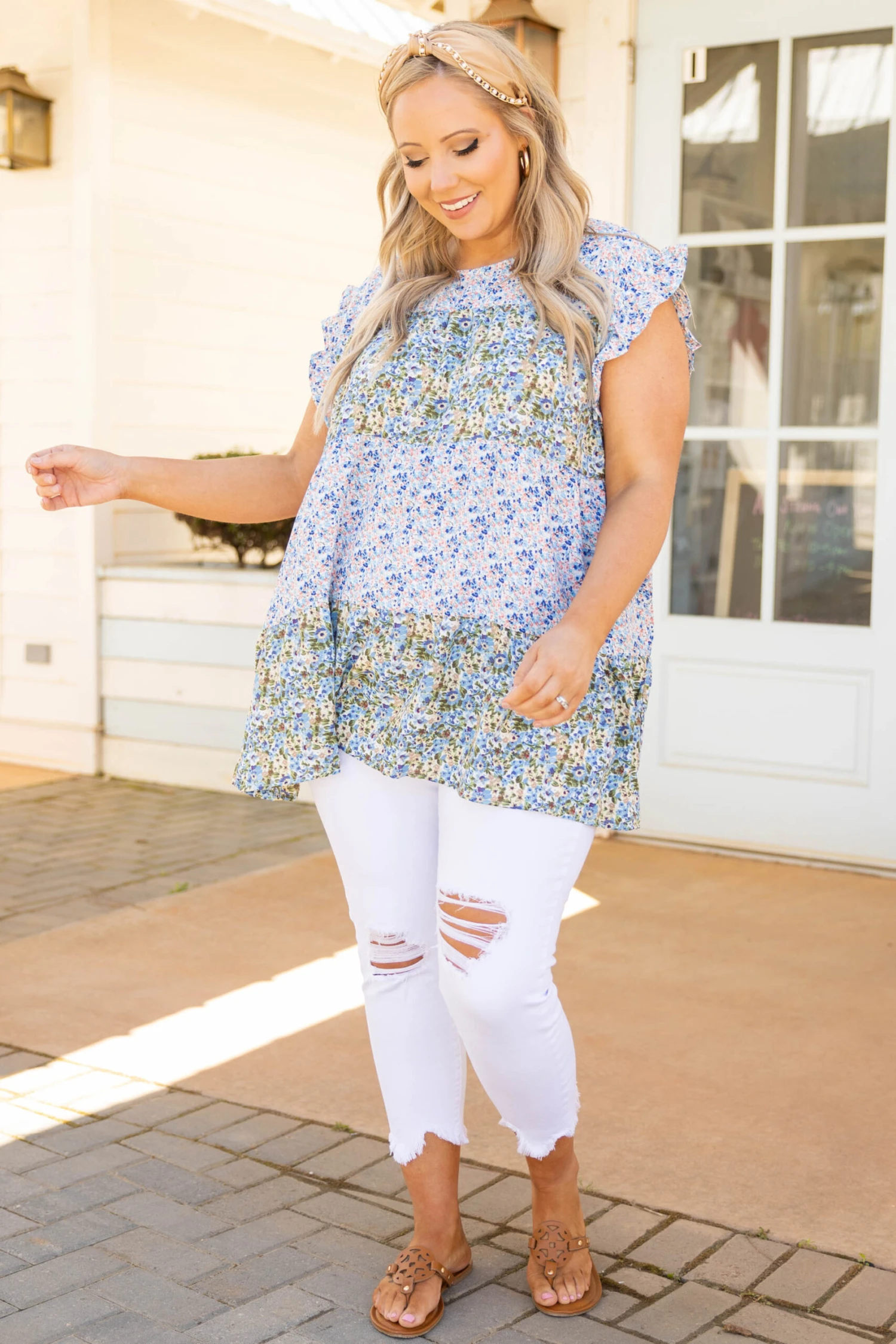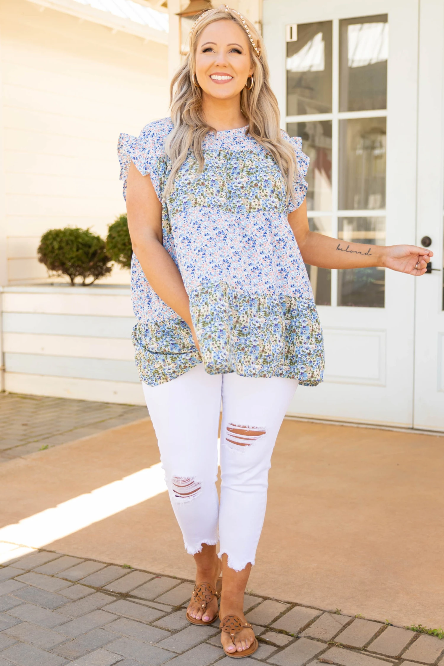 You will love wearing this stylish top all the time! This babe has a stunning floral blocking pattern that works so well with the babydoll style! The flutter sleeves are so trendy for warm weather and the blue colors are beautiful! Just pair this top with some white denim and some sandals for a look that will turn heads!