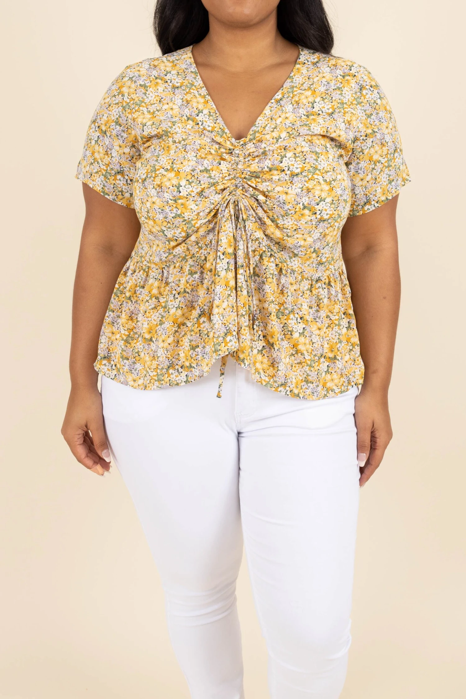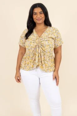 Wear this cutie to express your passion for fashion! Crafted from lightweight material with a vivid yellow hue, it features a ruched front and a beautiful floral pattern! This top is sure to bring a vibrant and sunny feel to any look!