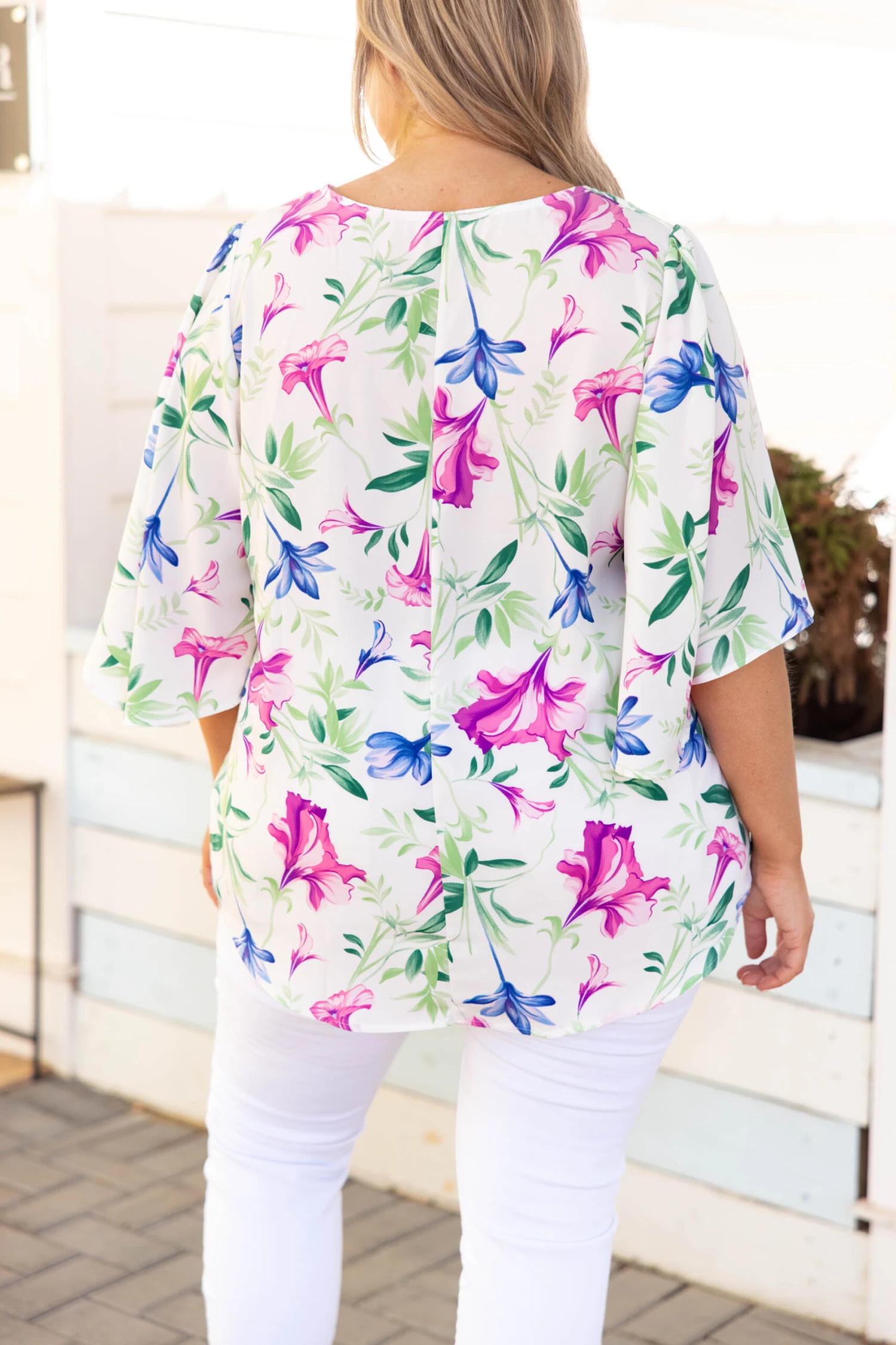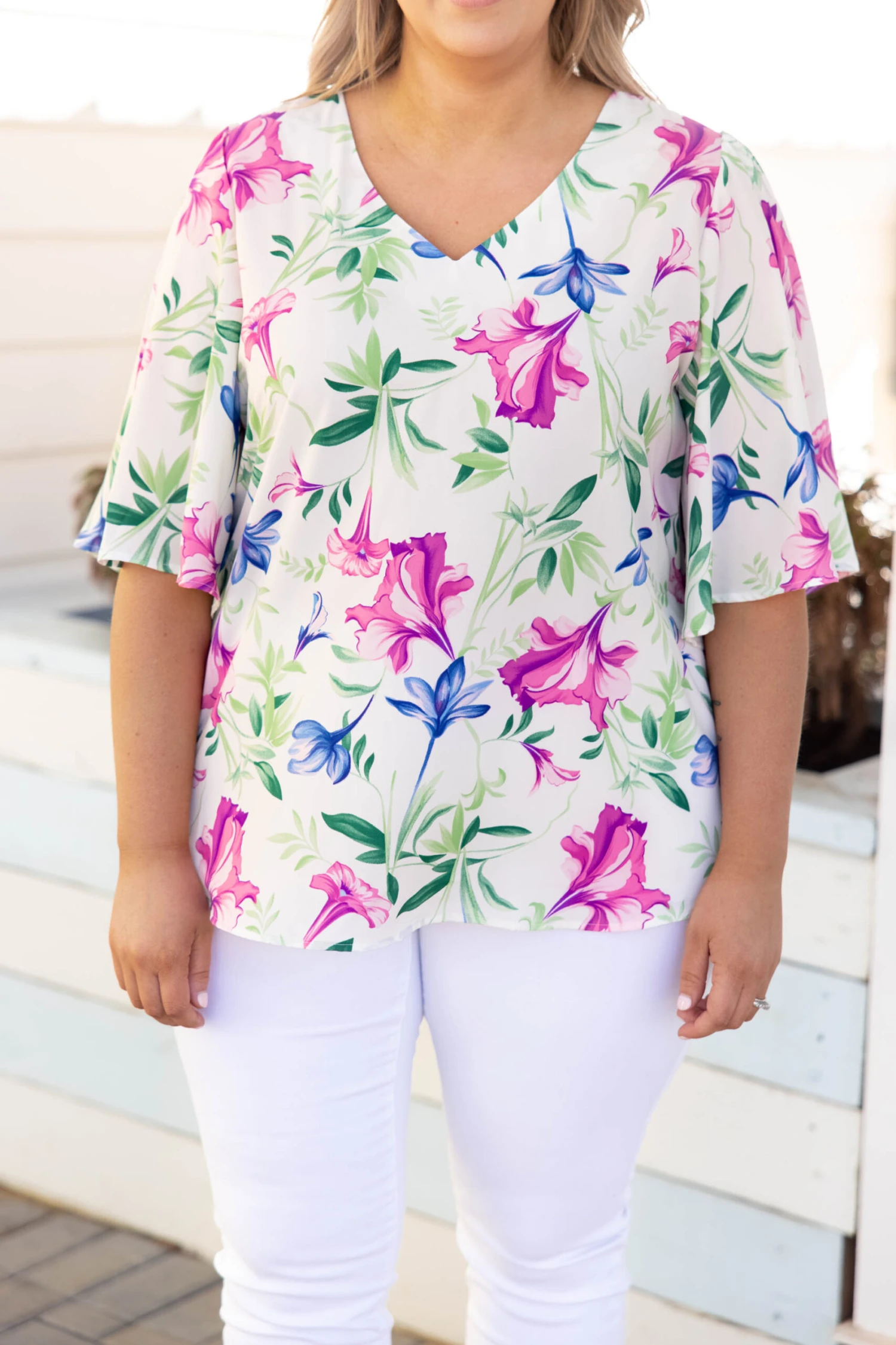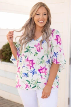 Enjoy the sunset in this top! This top has a sleek design with a pretty color and floral pattern you can dress up or down and style for every occasion! It’s comfortable for all-day wear, has a figure-flattering fit, and features the cutest flutter-sleeves for the ultimate trendy look! Style this top with skinnies and wedges for an easy everyday outfit!Â