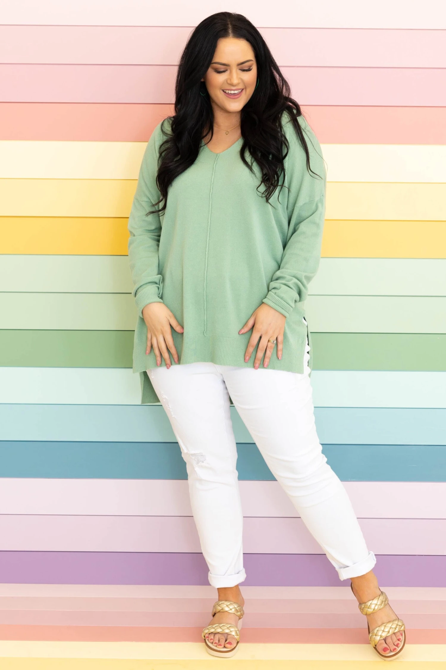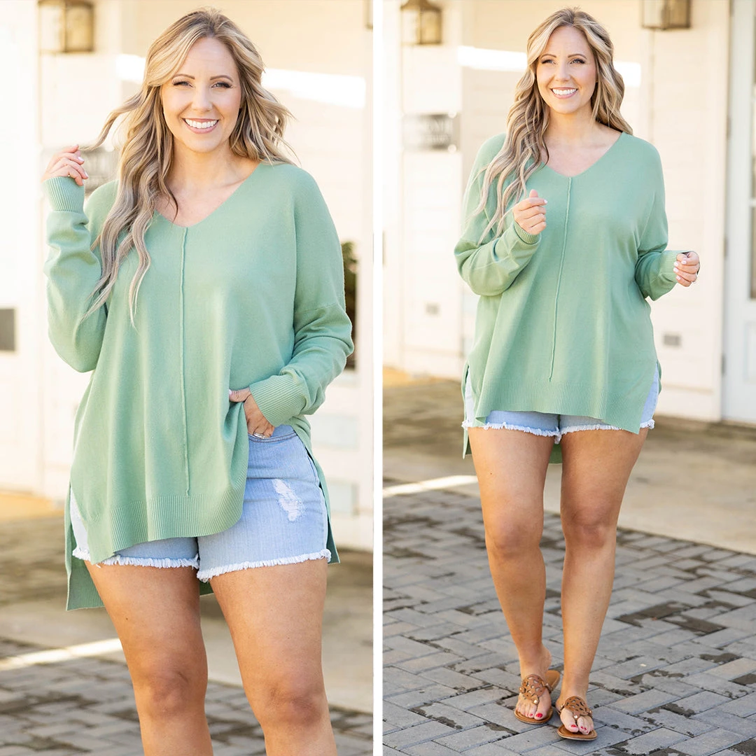 In this top, you’ll never miss last year’s wardrobe! This sweater has a chic light jade color you can dress up or down and style with everything in your closet! It’s comfortable for all day wear, has a figure-flattering fit, and can be layered with your favorite outerwear! Simply, style this sweater with skinnies or shorts for an effortlessly chic look!