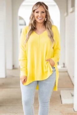 In this top, you’ll never miss last year’s wardrobe! This sweater has a chic yellow color you can dress up or down and style with everything in your closet! It’s comfortable for all day wear, has a figure-flattering fit, and can be layered with your favorite outerwear! Simply style this sweater with skinnies and sandals for an effortlessly chic look!Â