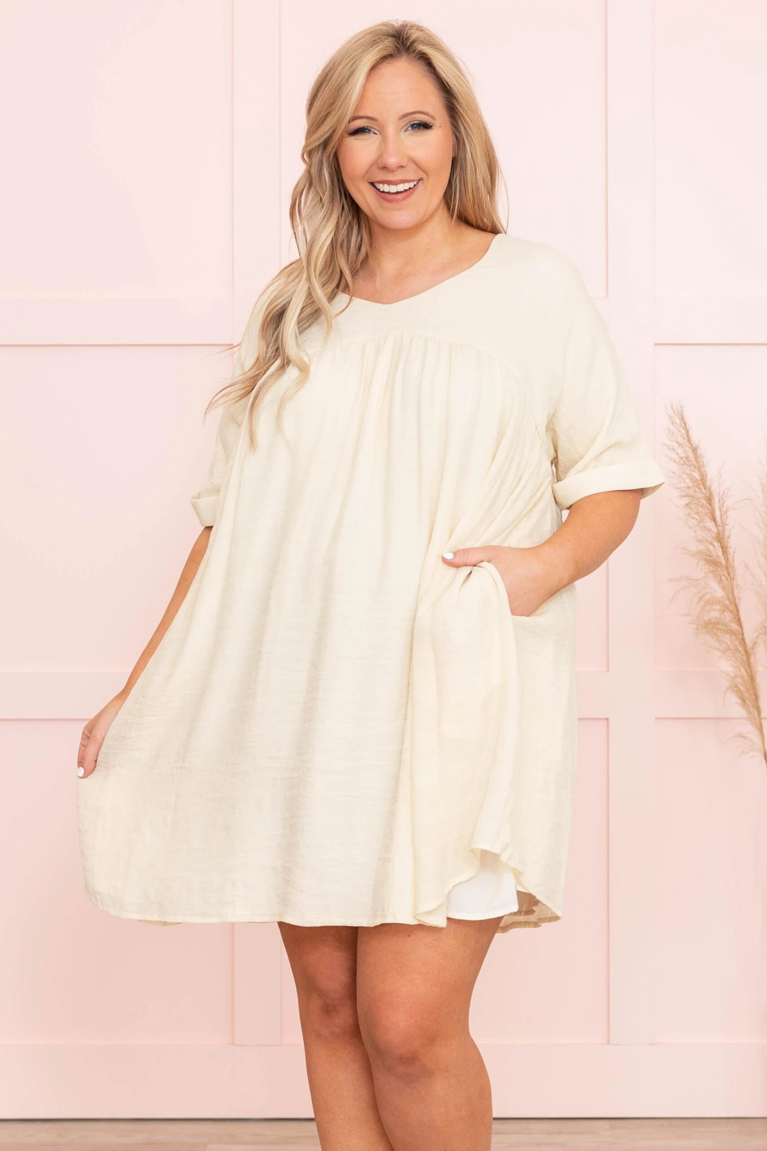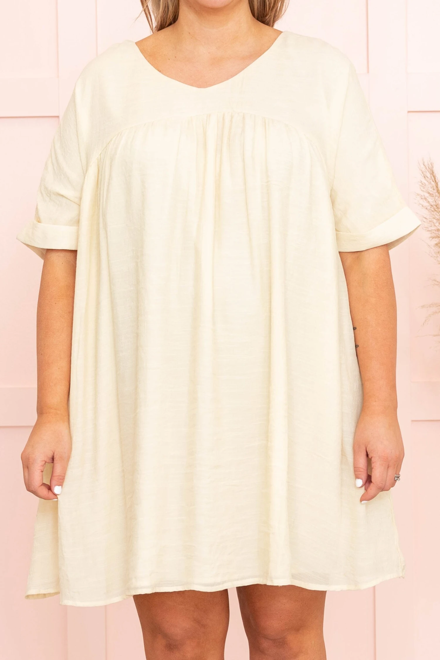 Look like a model straight off the runway in this dress! This dress has a solid cream color you can style for every occasion! It’s comfortable for all-day wear, has a flowy baby doll fit to flatter your figure, and can be styled with your favorite shoes and accessories! Simply pair this dress with wedges or sandals for your next event!