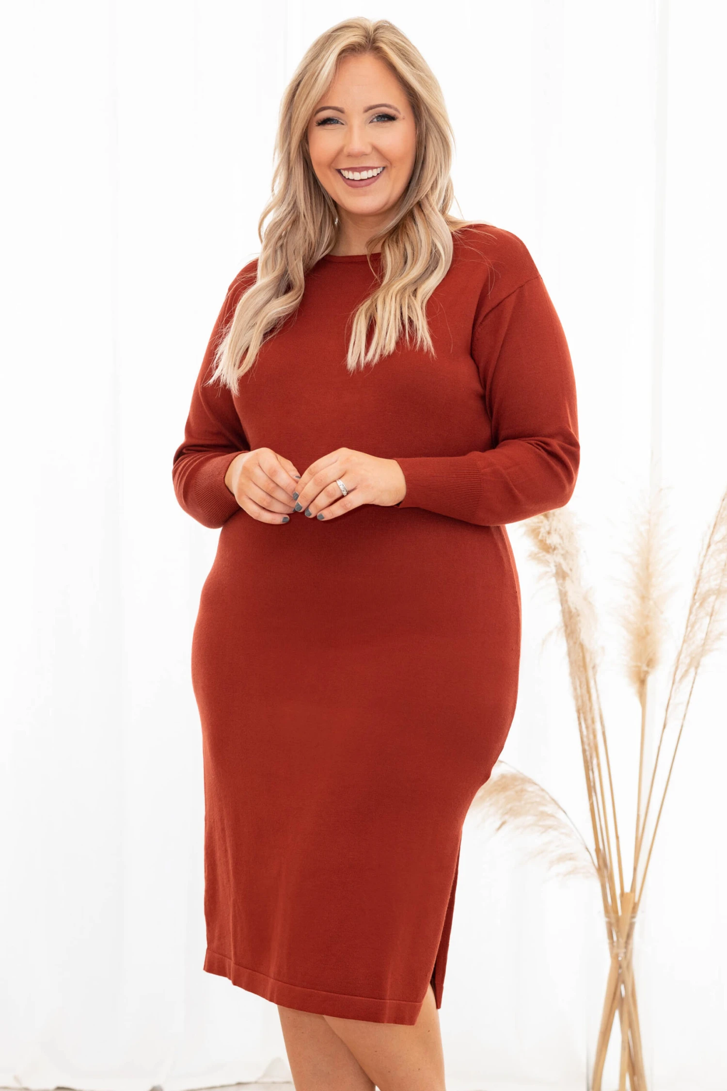 Show off those curves girl! This dress has a solid rust color you can dress up or down and style for every occasion! It’s comfortable for all-day wear, has a figure-hugging fit sure to flatter every body type, and features the cutest high neckline for a trendy look! Simply style this dress with booties and bold earrings for an effortlessly chic look!