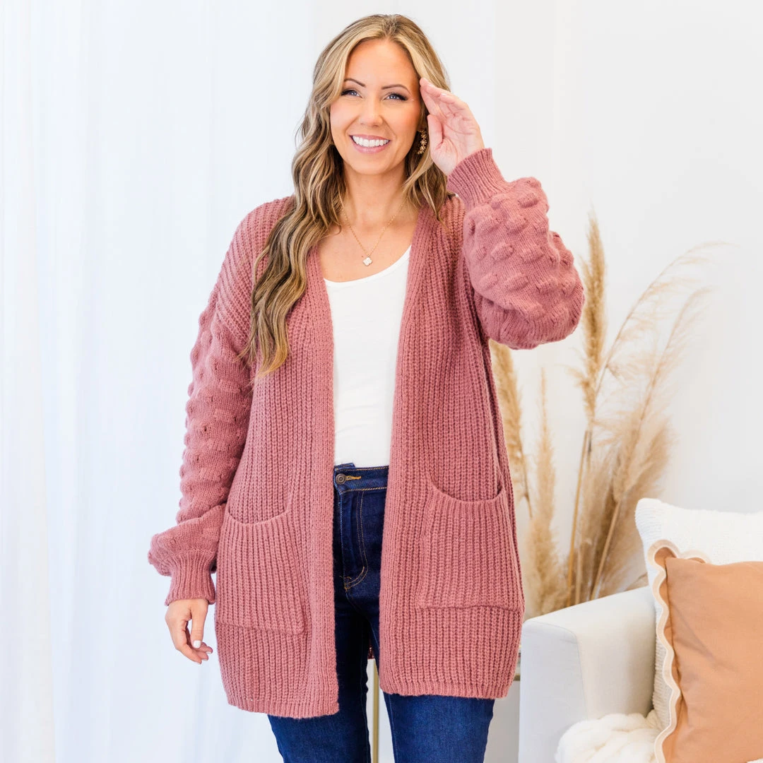 Introducing the My Kinda Happy Cardigan in mauve! Made with cozy knit fabric, this classic cardigan features playful textured sleeves and long bubble sleeves for added flair! Plus, it even has pockets for convenience! Stay warm and stylish in this must-have piece!