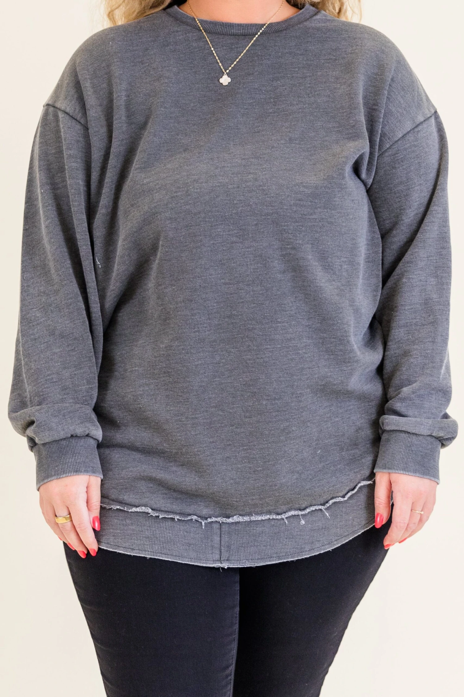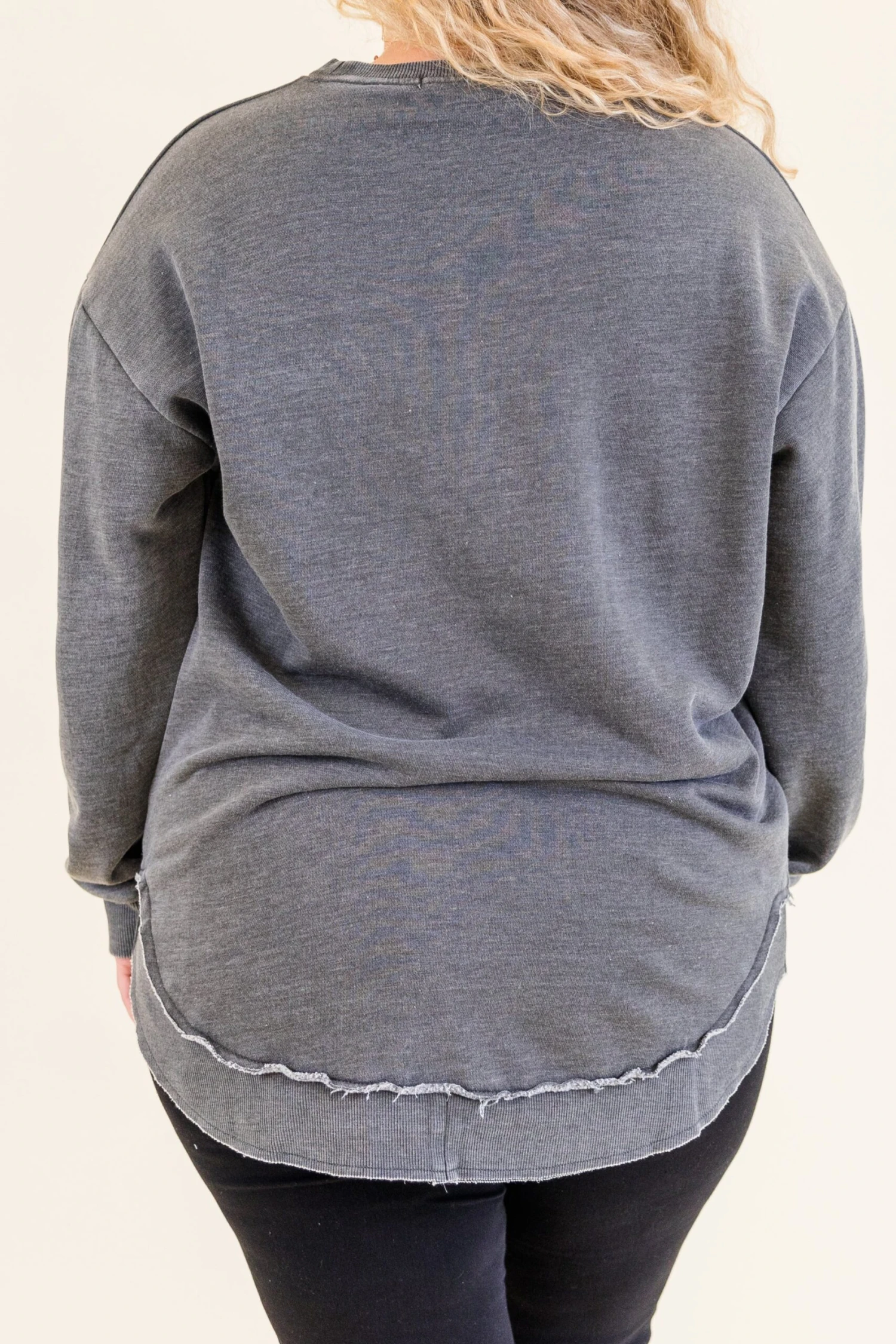 Achieve effortless style with this lovely tunic! Featuring a charcoal color and distressed seam, this tunic adds a pop of color and texture to your wardrobe! It pairs perfectly with white denim for a chic and trendy look!Â