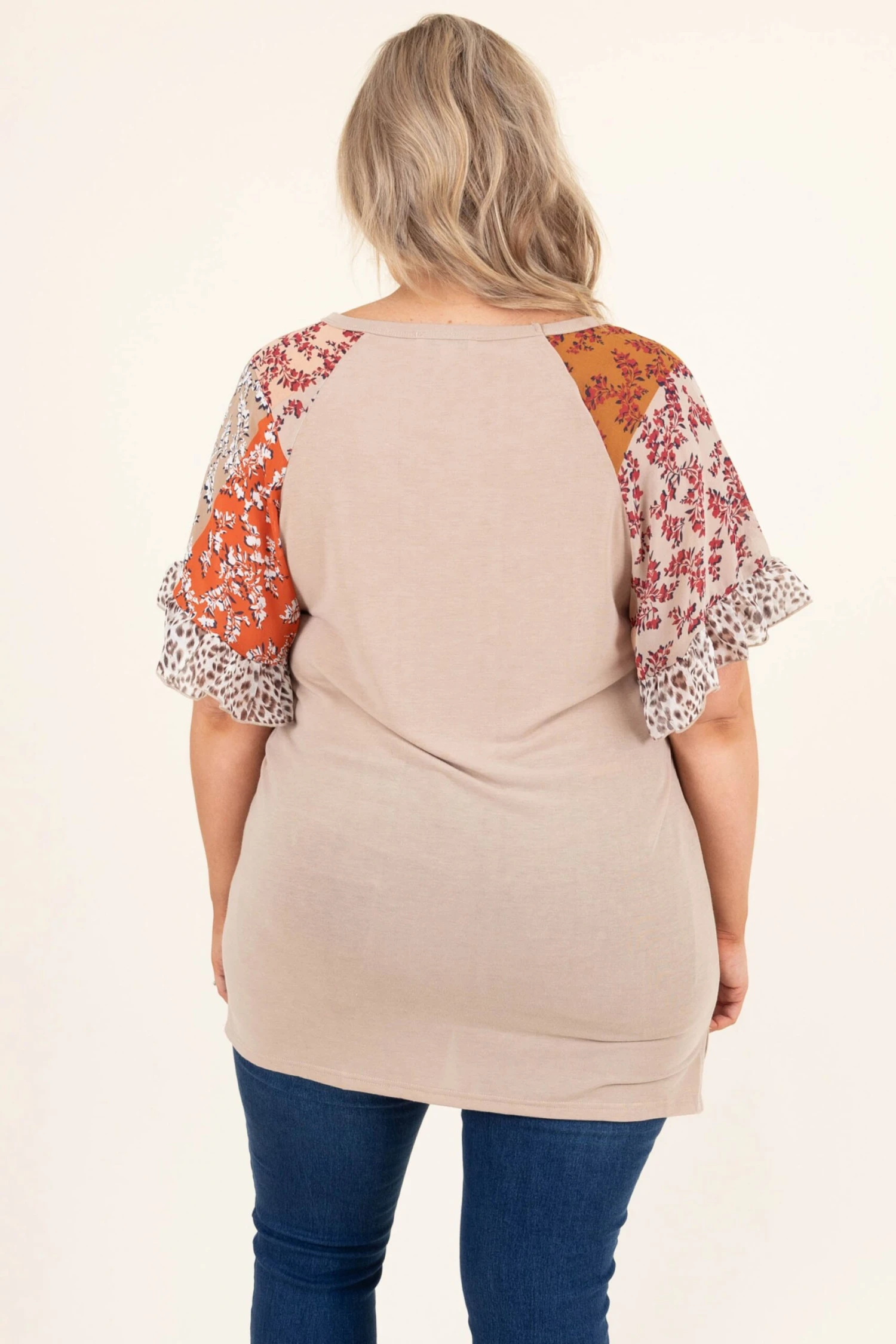 You will have the spotlight on you in this beautiful top! The floral pattern on the sleeves and soft mocha color is so fun and trendy! Style this top with a great pair of skinnies and some booties for a fun, chic look!Â