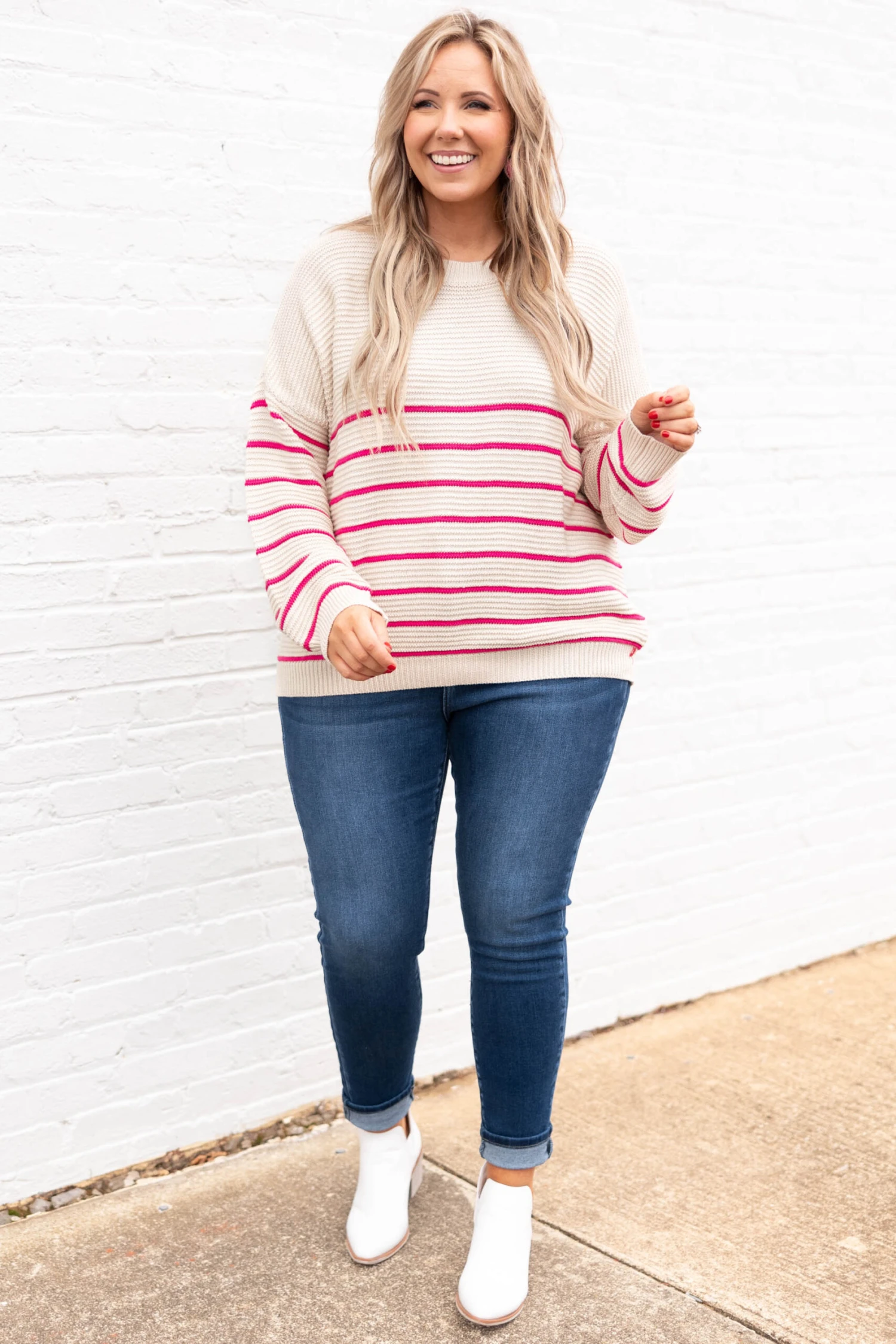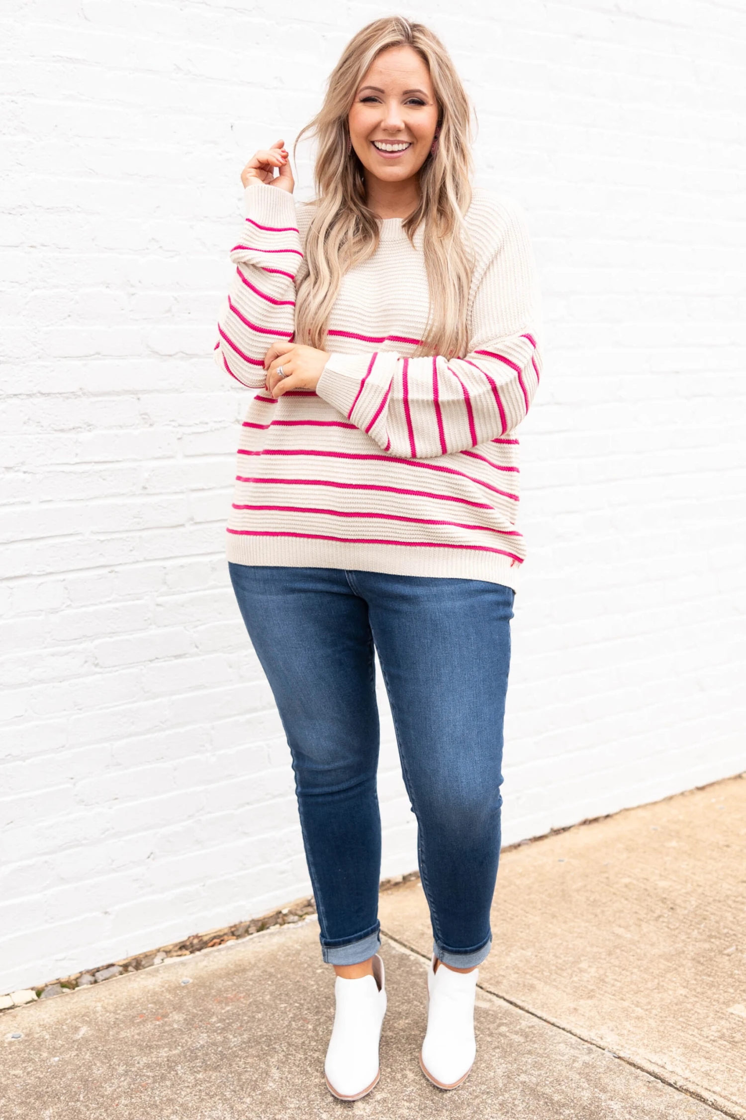 We love this top! It has a simple stripe pattern with neutral colors you can dress up or down and style for every occasion! It’s comfortable for all-day wear, has a relaxed fit to flatter your figure, and can be layered with your favorite outerwear! Simply style this sweater with skinnies and booties for an effortlessly, chic look!
