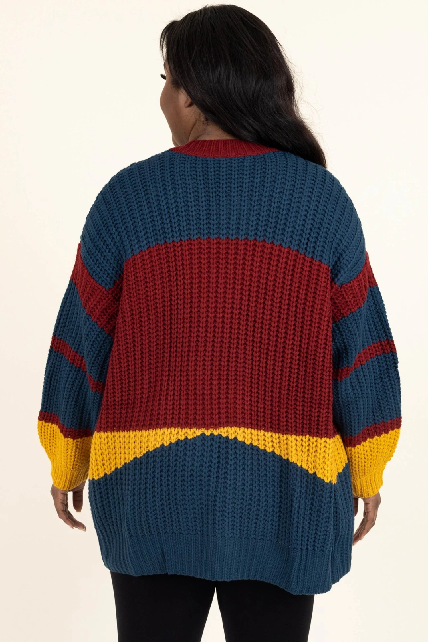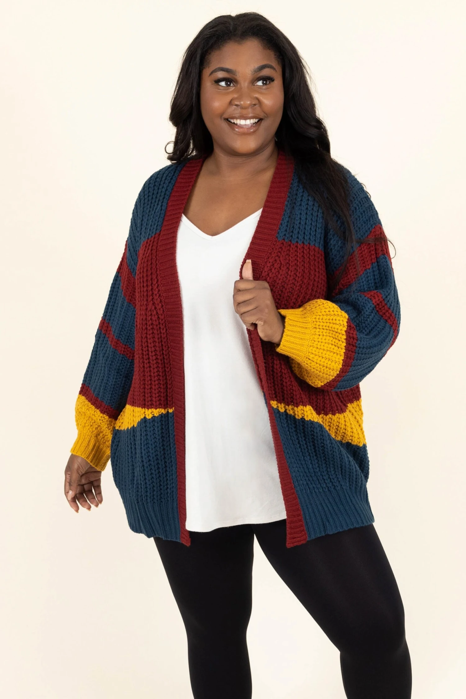 Take your wardrobe in a new direction with this beautiful cardigan! This cardi has a lovely mix of bold colors and a trendy colorblock design that is SO sweet! Style this cardigan with a solid top and leggings for your next adventure for a casual, chic look!