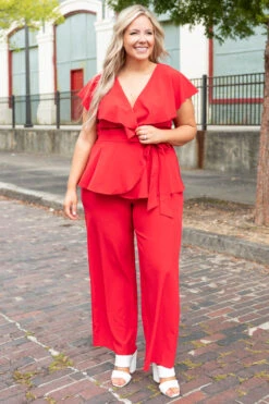 Take your wardrobe to the next level with this gorgeous jumpsuit! This jumpsuit has a bold, red color with super chic flutter sleeves! The vibe of this jumpsuit will have you looking super fierce! Simply style this jumpsuit with some heels and cute accessories for an effortlessly fabulous look!Â