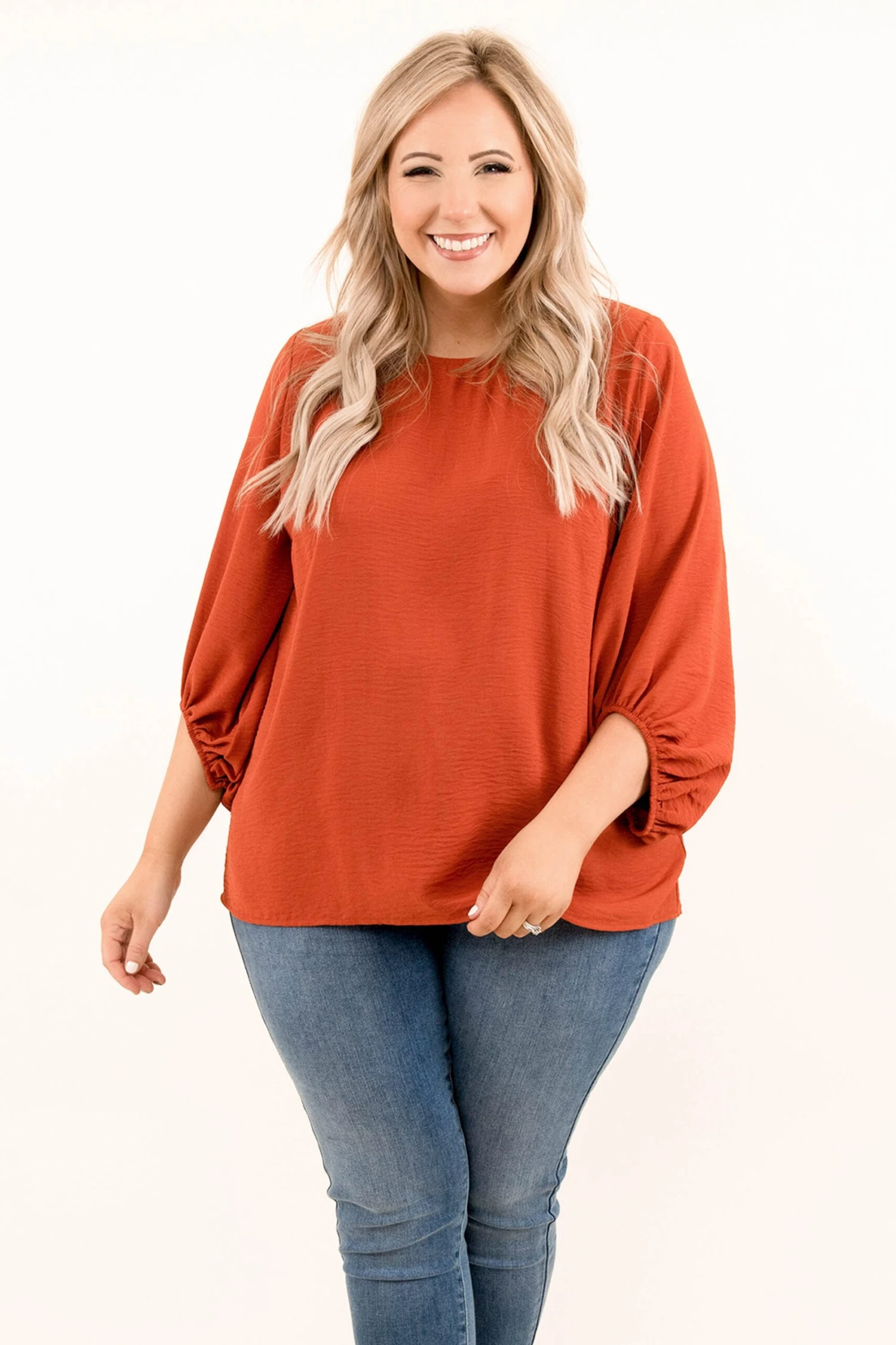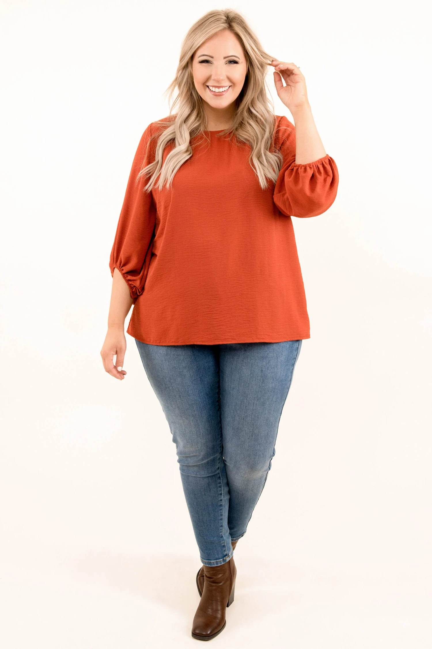 This blouse is exactly your type! It has a gorgeous rust color with a fun and flirty fit to flatter your figure! Pair this top with skinnies or leggings for an effortlessly chic look!Â