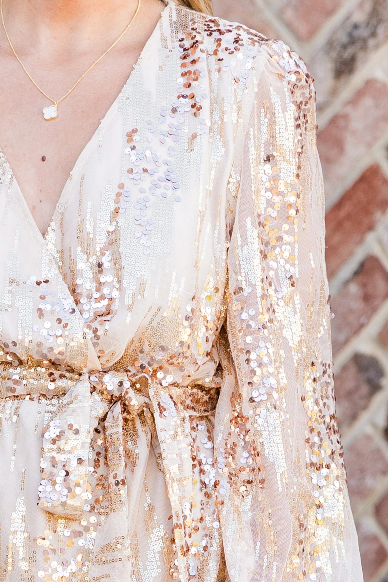 Indulge in luxury with our Now I Know Dress in champagne! This long-sleeve gold dress features a waist-tie for a flattering silhouette and a deep v-neckline adorned with sparkling sequins! Elevate your style and make a statement at any event with this exclusive piece!