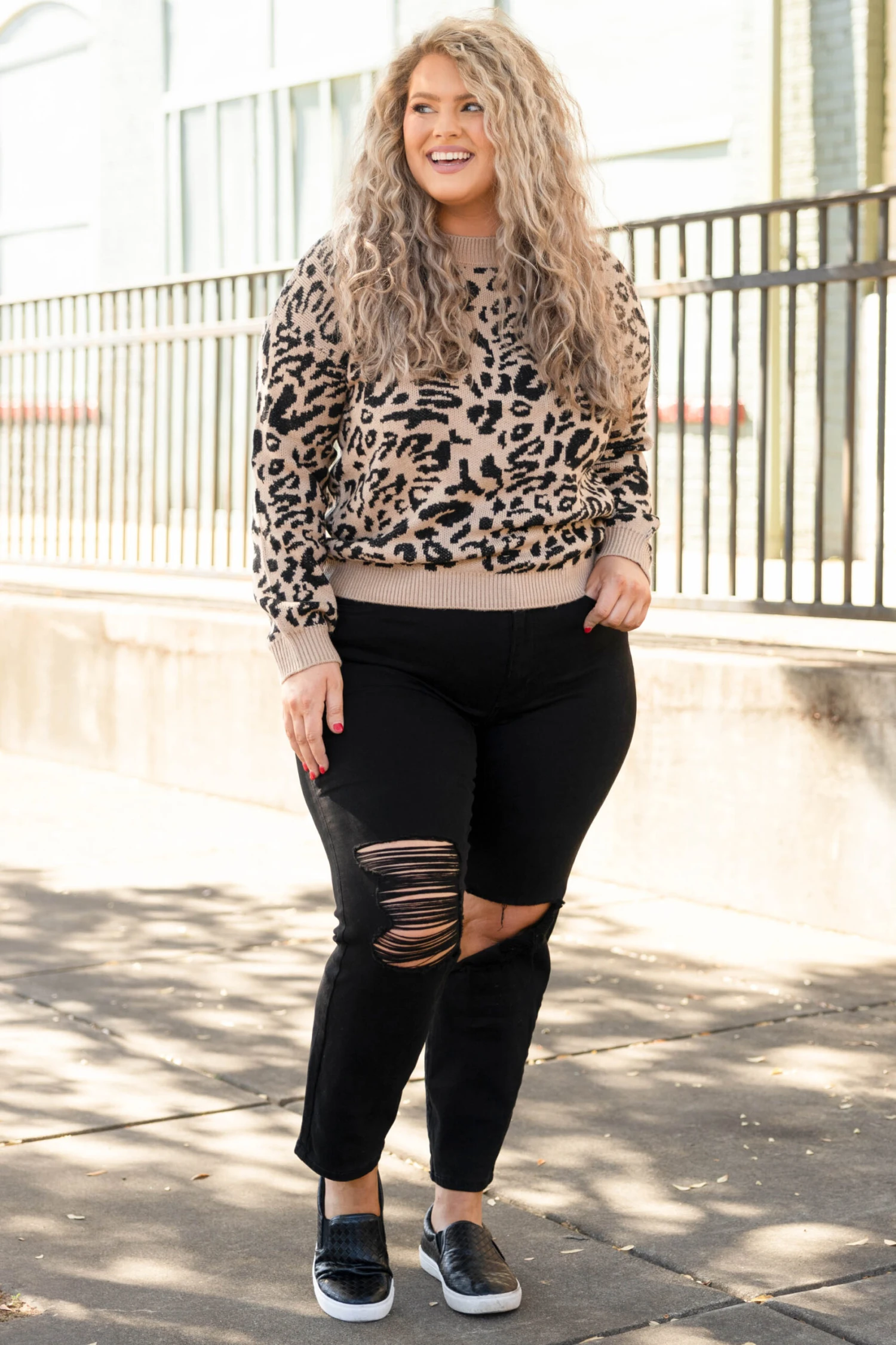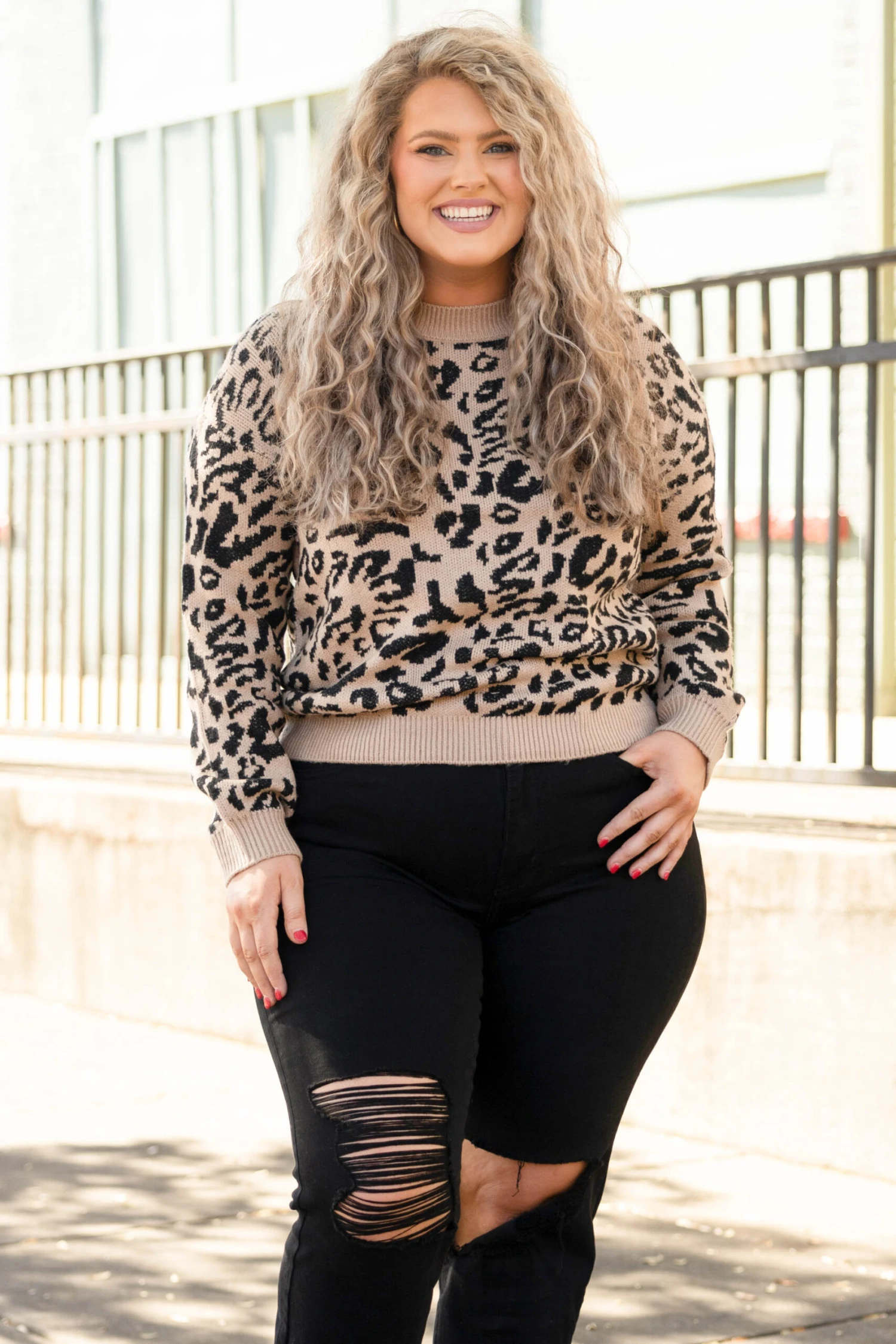 If you have been on the hunt for the perfect sweater, this is it! This sweater has a pretty tan color with a fierce leopard print on both the front and back! Simply pair this sweater with skinnies and sneakers for an easy everyday look!