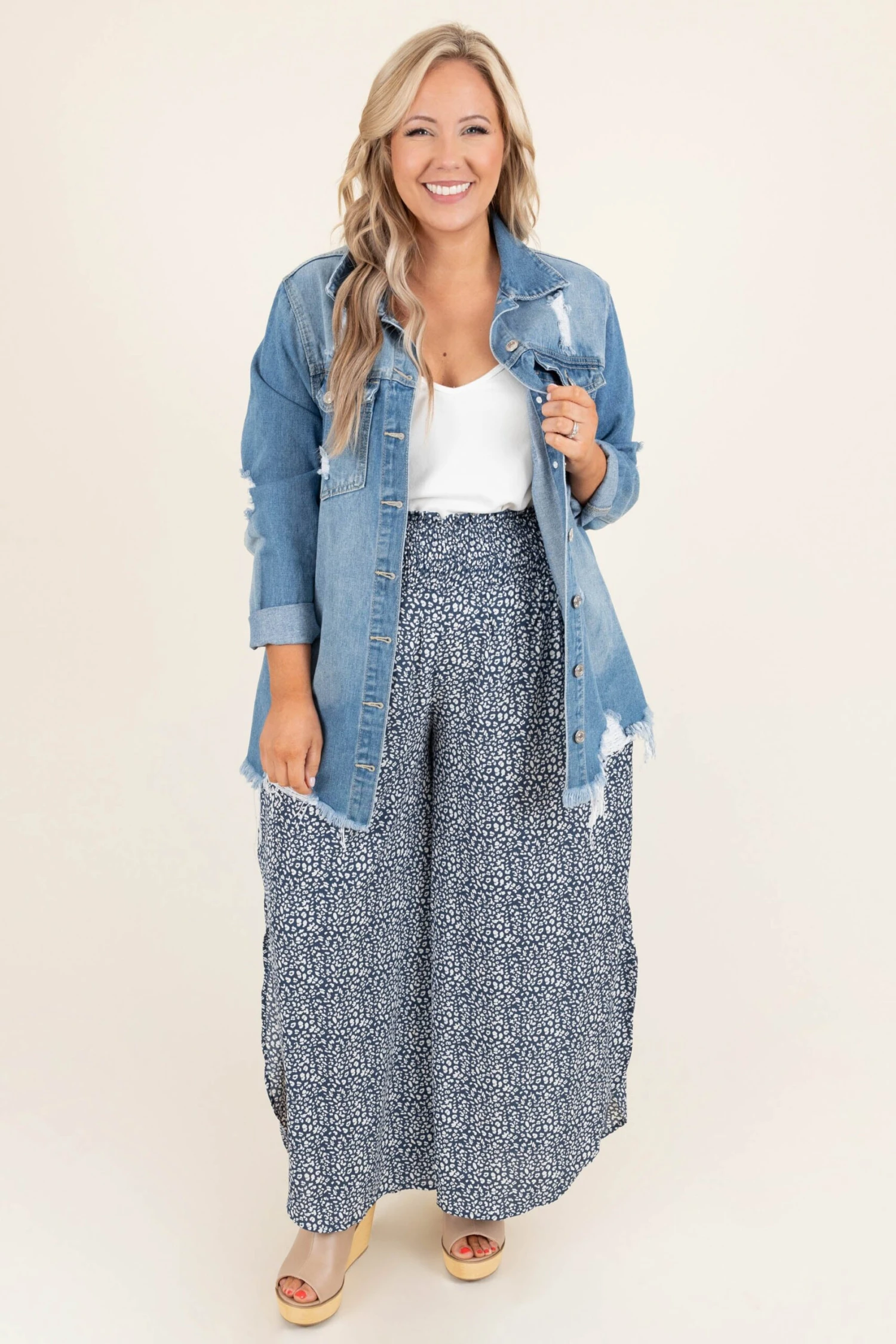 Chill out on the patio in these adorable pants! These pants have a lovely blue color, and a chic leopard pattern! The feathered side splits and elastic waist will give you the perfect fit! Style these pants with a cute top and denim jacket for a bold, trendy look!