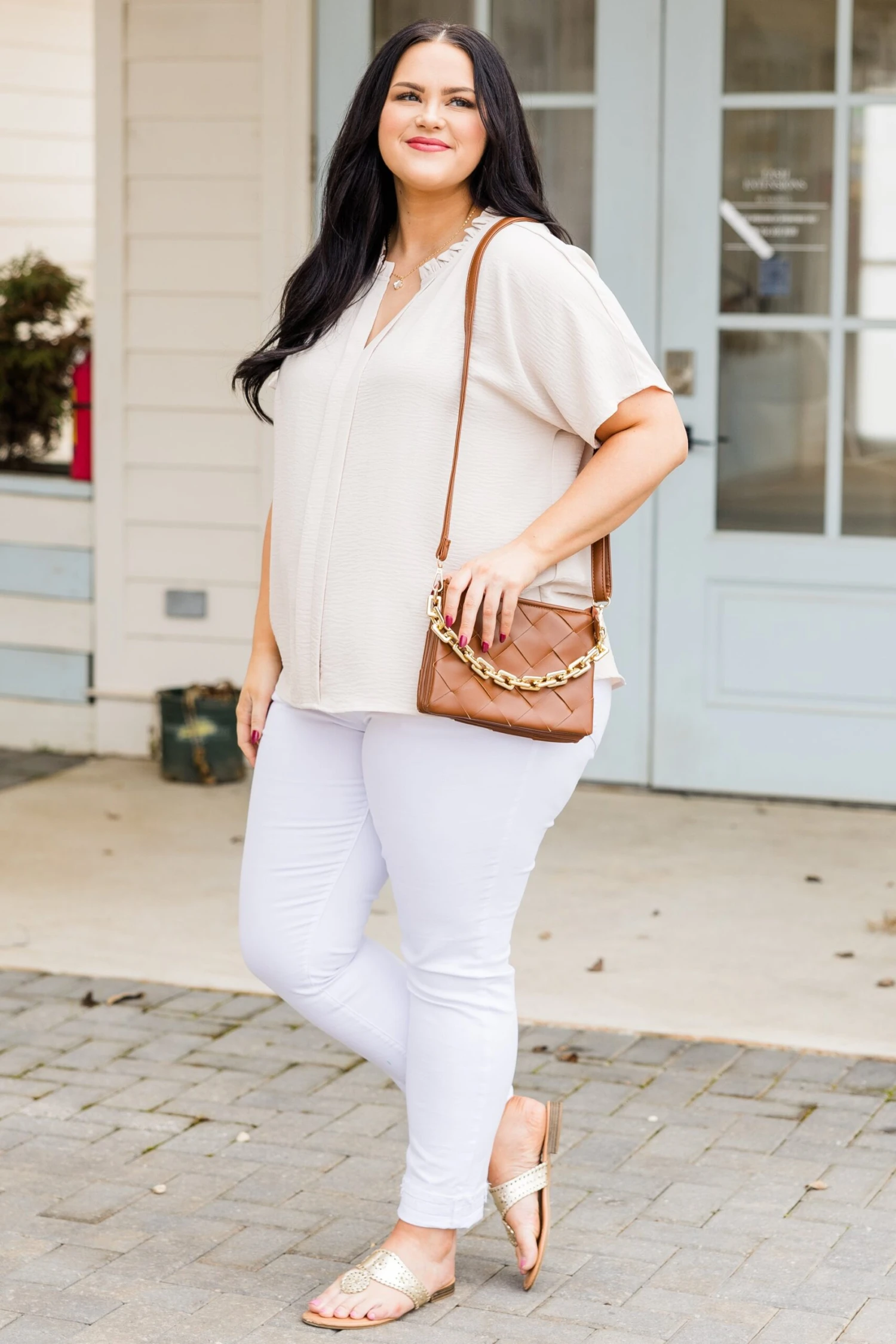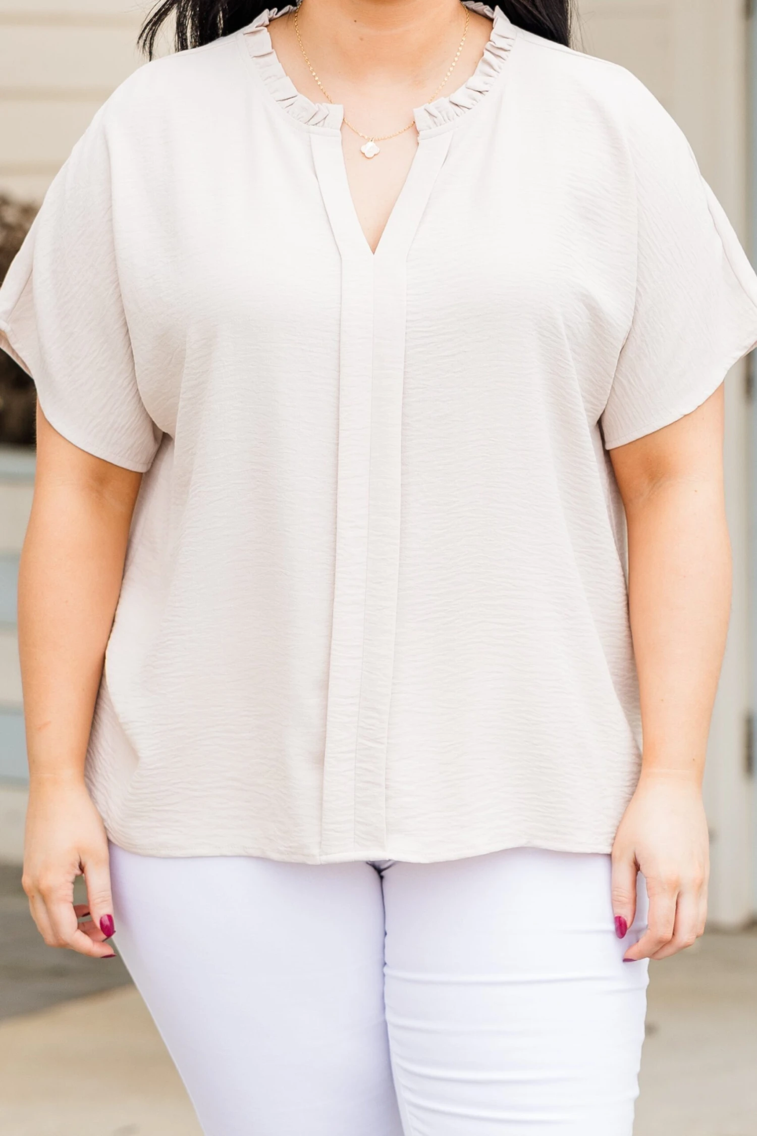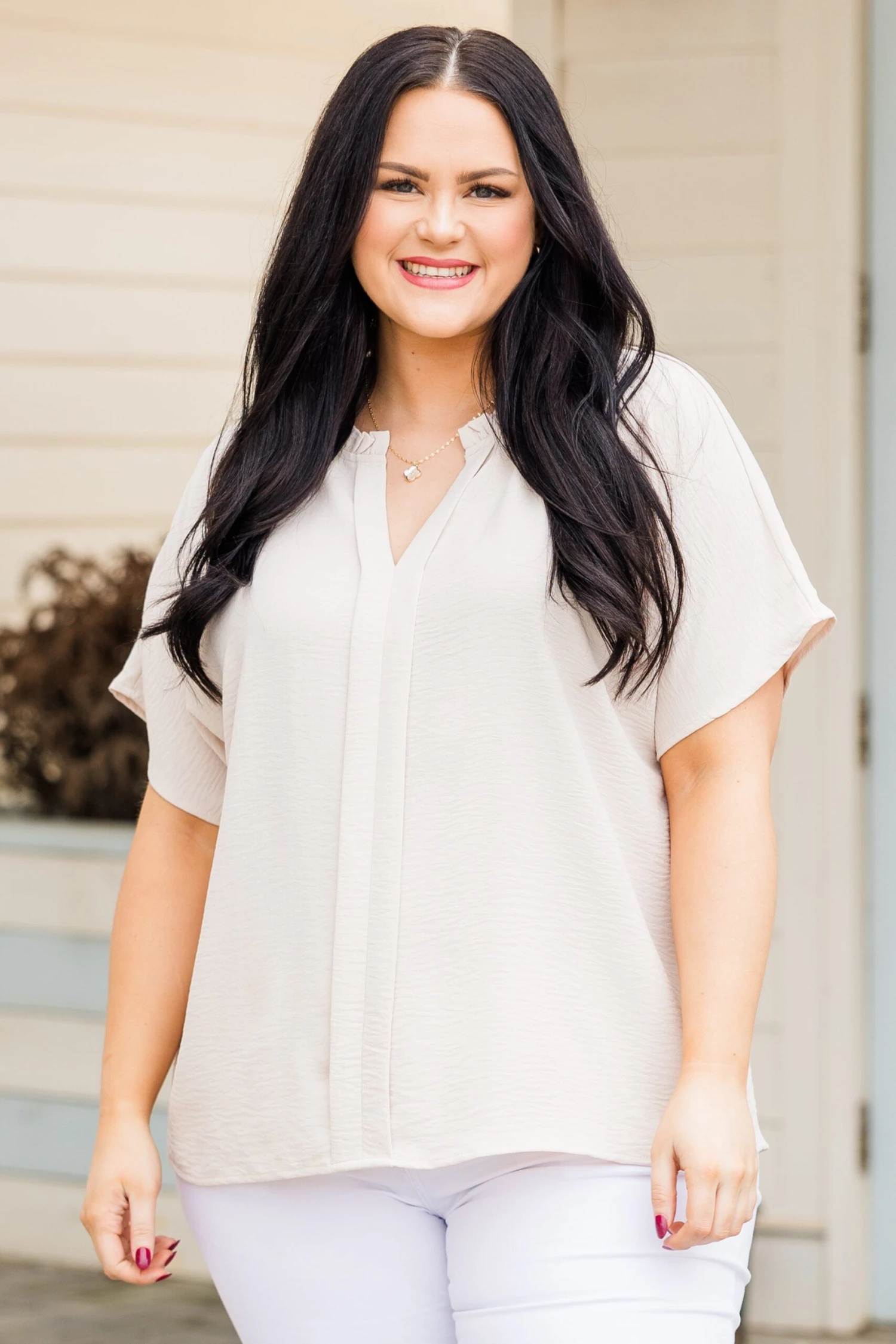We simply adore this top! The top features a ruffled neckline and a classic oatmeal color that adds a touch of elegance, perfect for pairing with white denim or patterned pants! Elevate your style with this chic and versatile top!