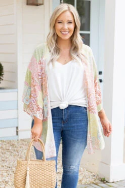 Take a vacay to paradise in this paisley kimono! The color blocked paisley pattern is so stunning and the bell sleeves give this a vintage feel! This lightweight feel is perfect for layering over a sweet swimmie or a basic top and some skinnies for a super stylish look!