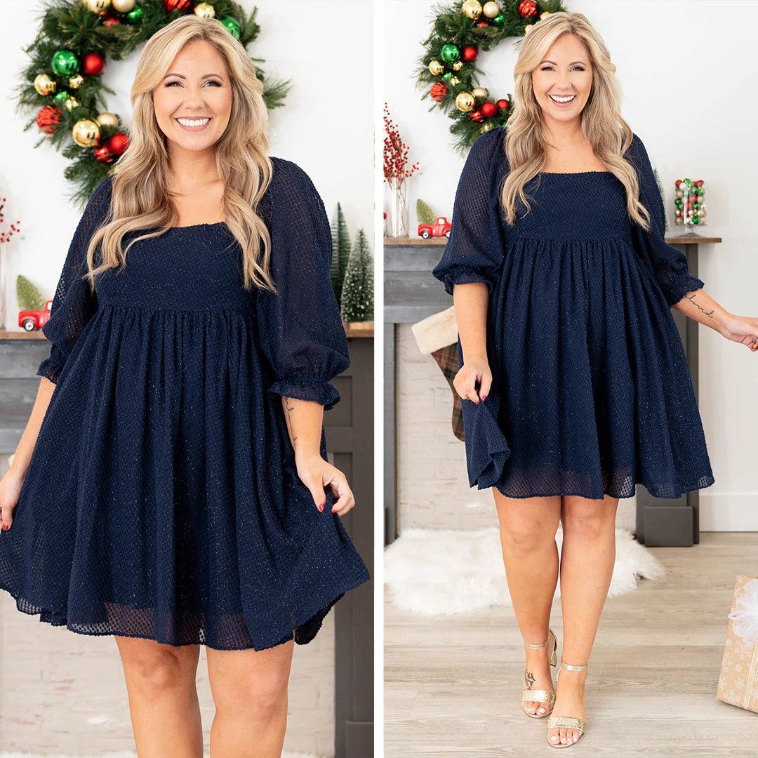 It’s holiday party season! This dress features a beautiful navy color that is sure to stand out for every occasion! The textured fabric is so on-trend and the poofy sleeves are the perfect added touch! This dress is figure-flattering for all body types and comfortable for all-day wear! Simply pair this dress with your favorite heels and accessories for a chic, trendy outfit!