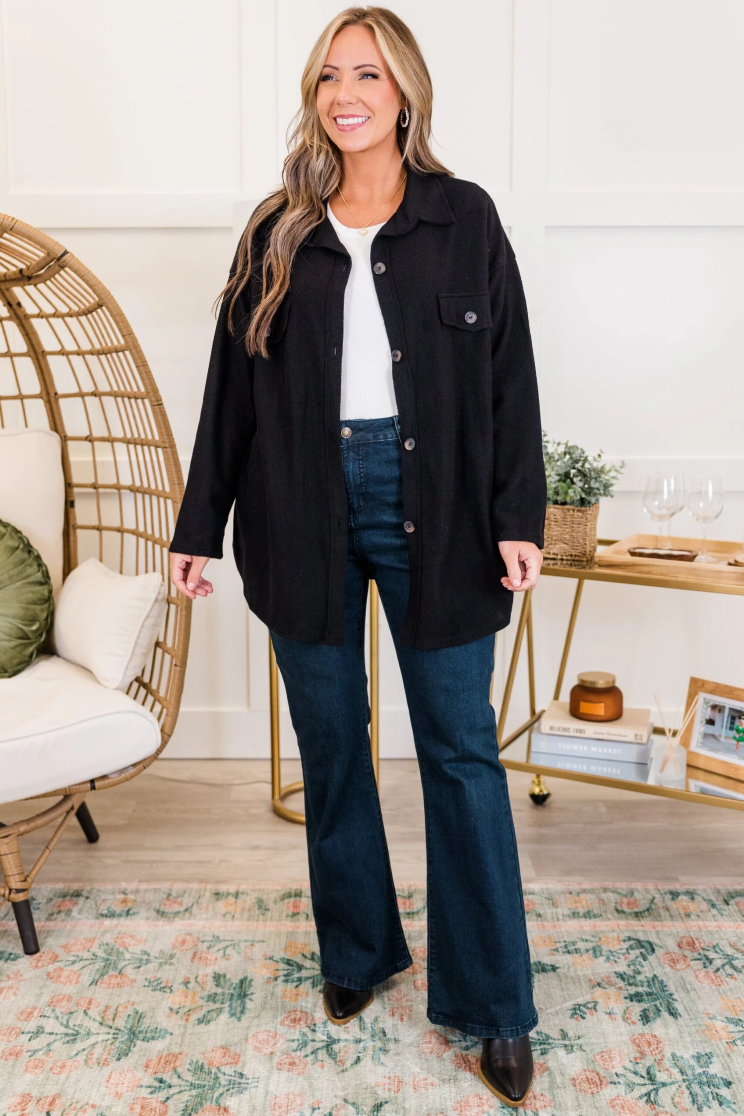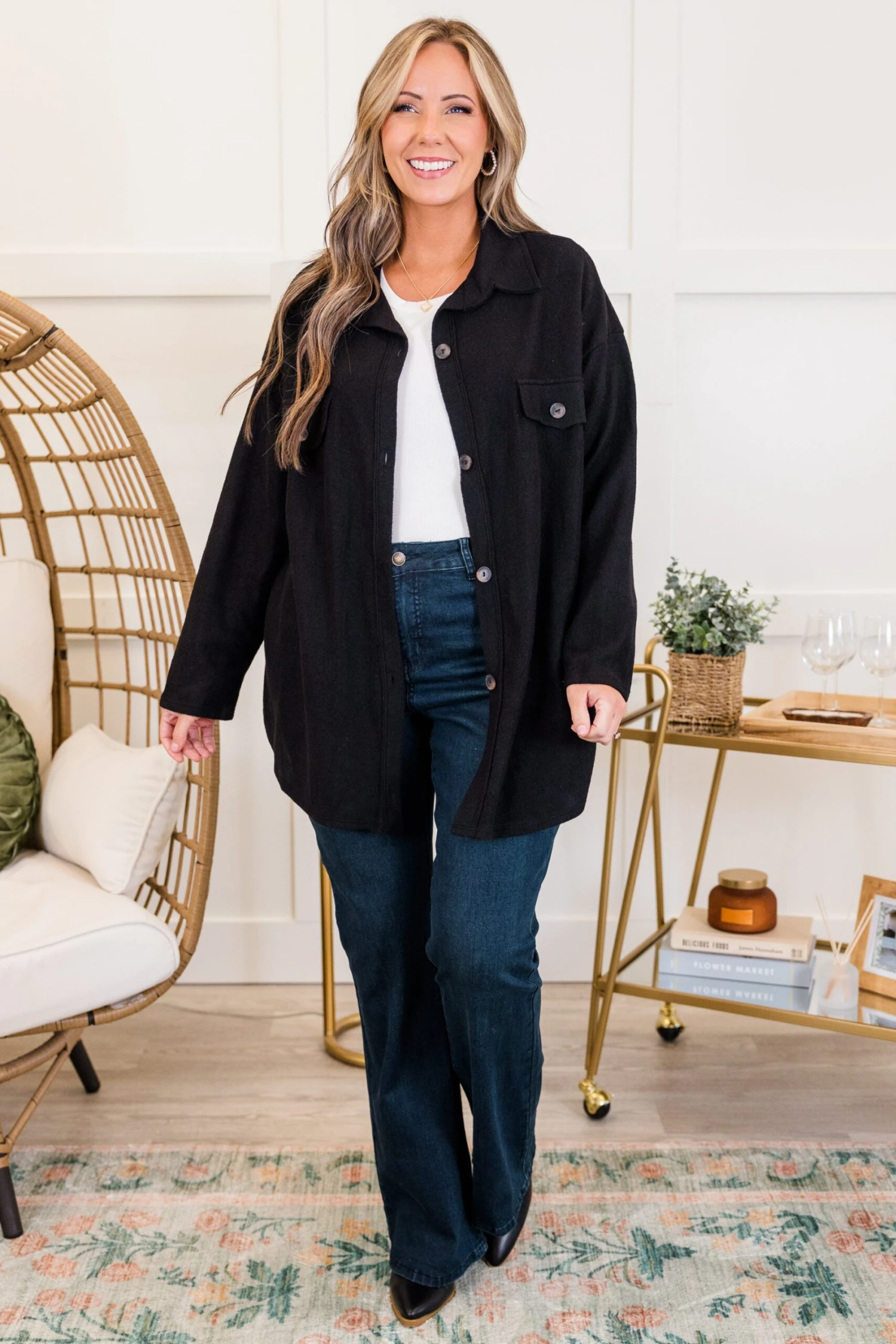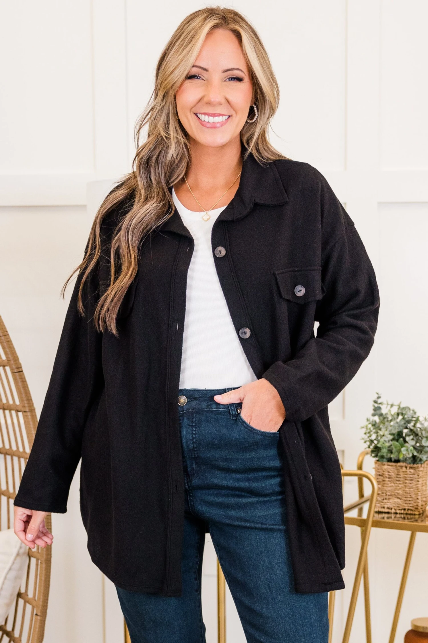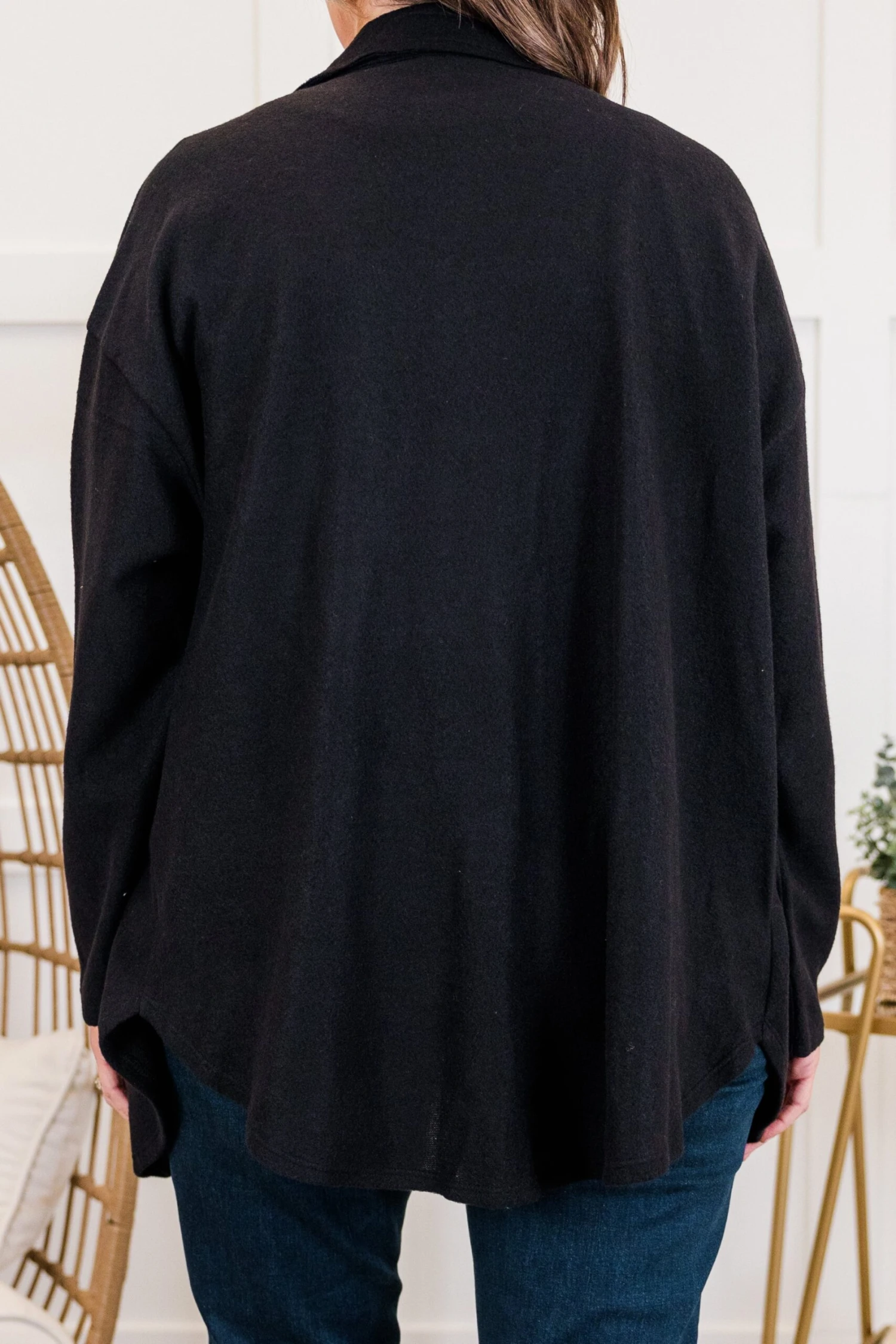 Introducing the Passing Glances Jacket in a luxurious black color! Made from brushed hacci material, this jacket offers both comfort and style! The functional buttons add a touch of sophistication to this versatile piece! Perfect for any occasion, stay cozy and chic in this must-have jacket!