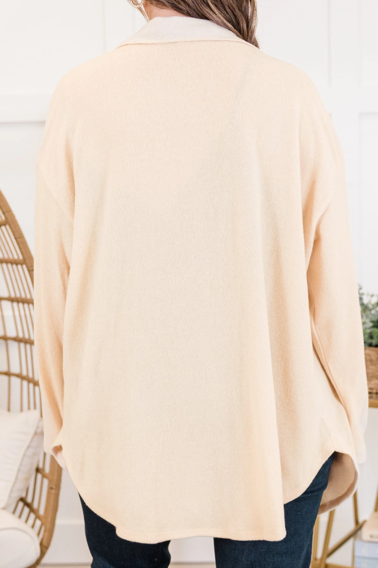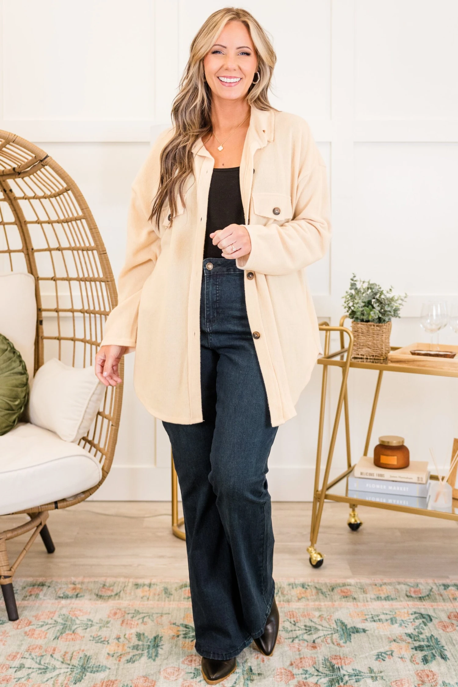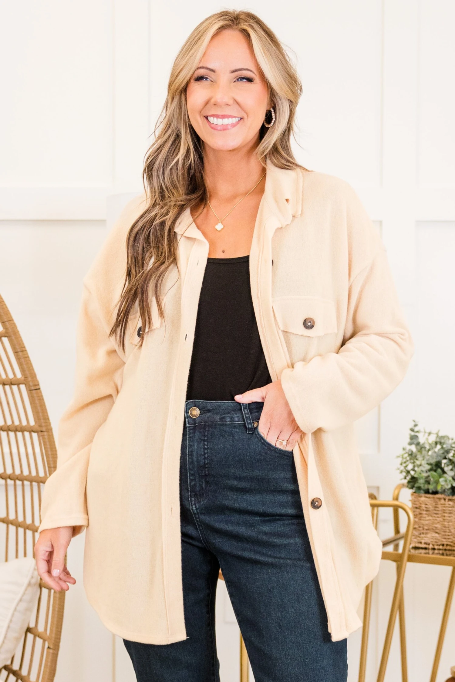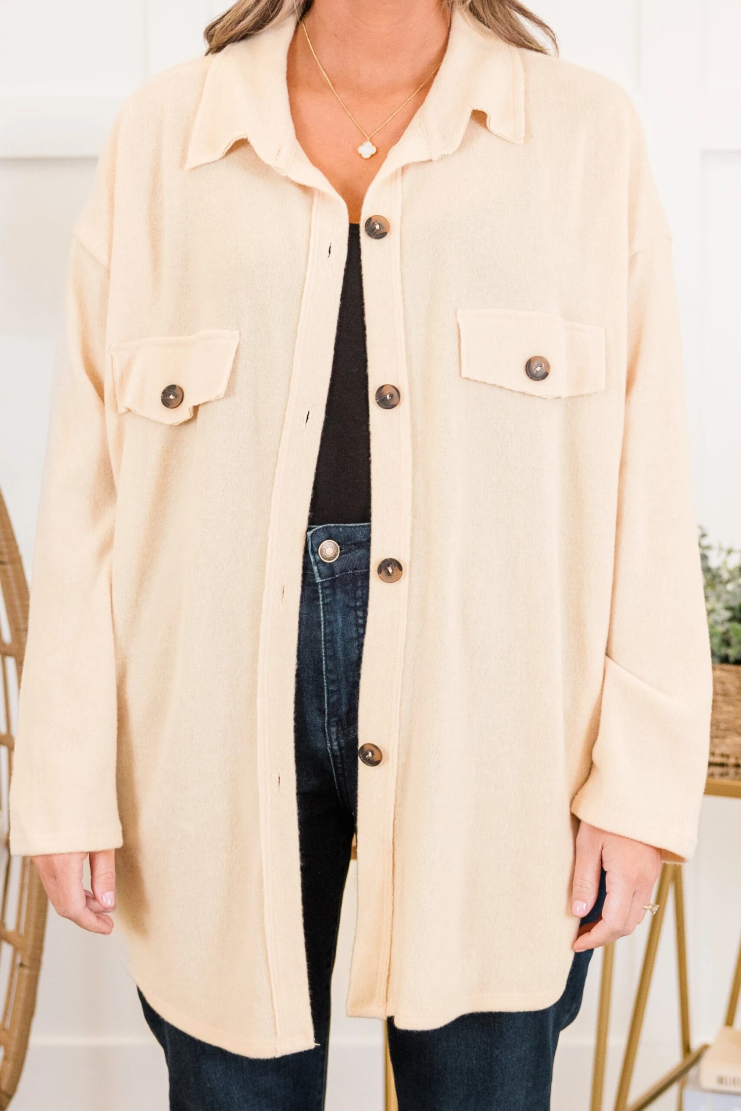 Introducing the Passing Glances Jacket in a luxurious cream color! Made from brushed hacci material, this jacket offers both comfort and style! The functional buttons add a touch of sophistication to this versatile piece! Perfect for any occasion, stay cozy and chic in this must-have jacket!